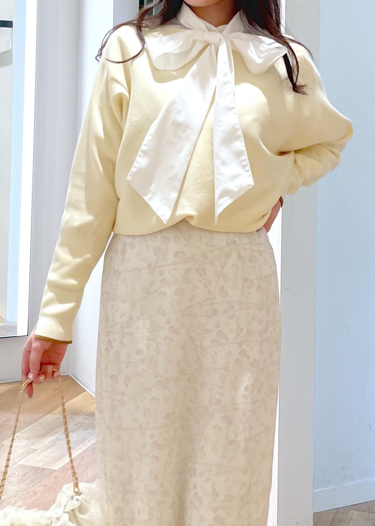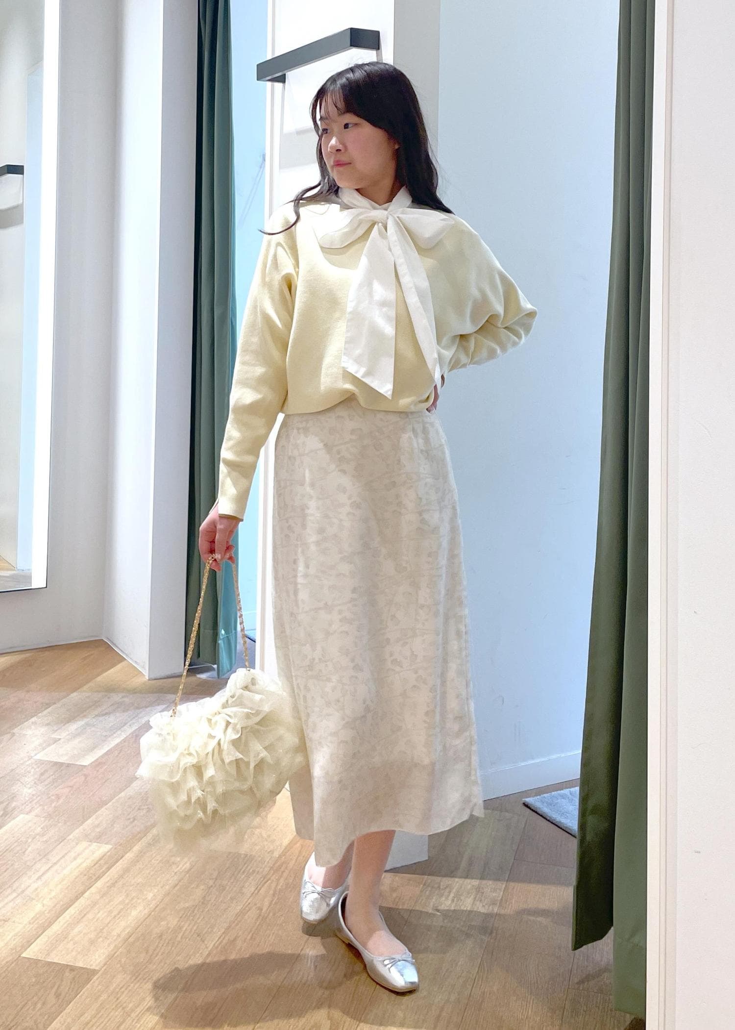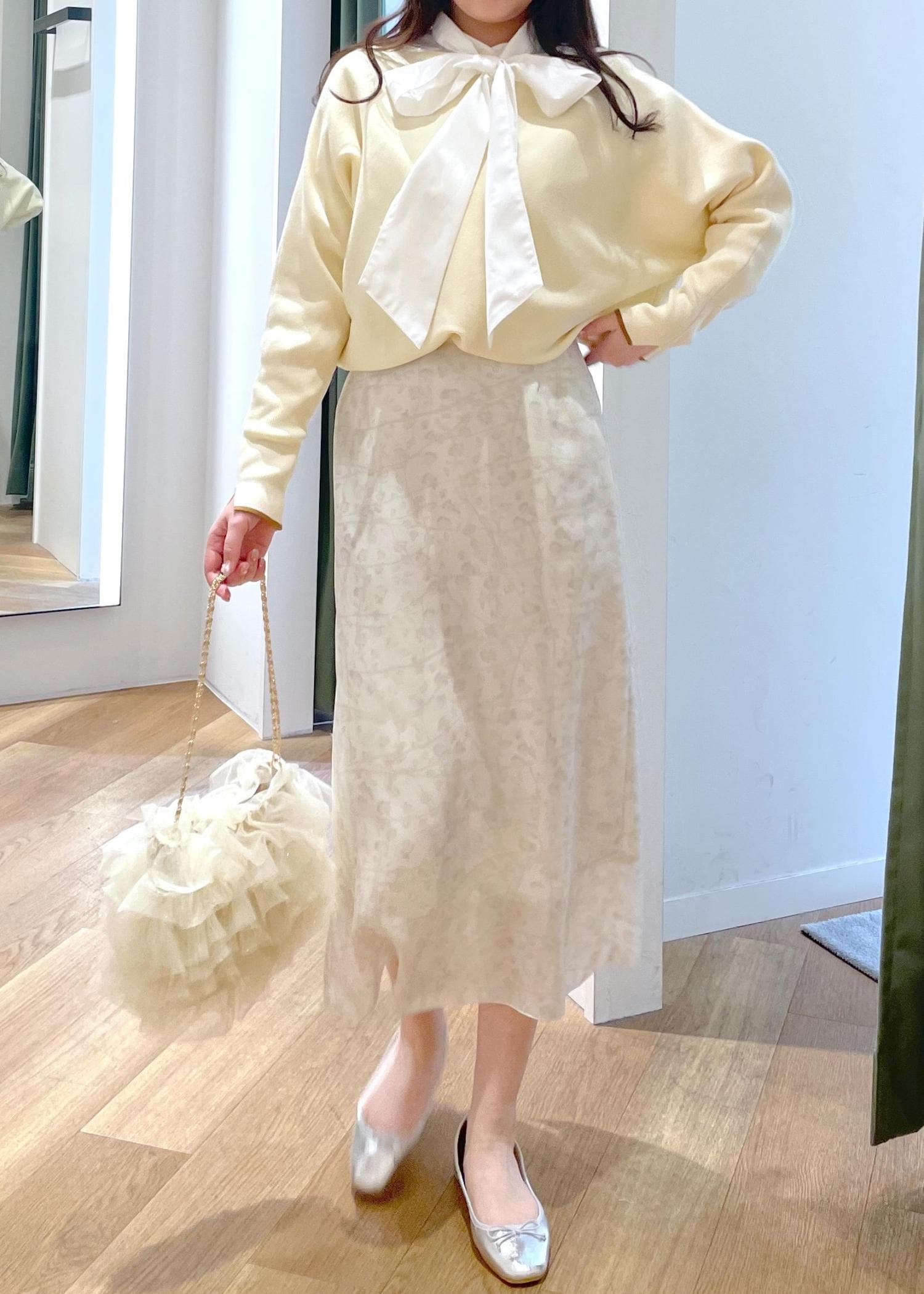 ニットはボウタイブラウスとレイヤードし、甘さをプラスしました。