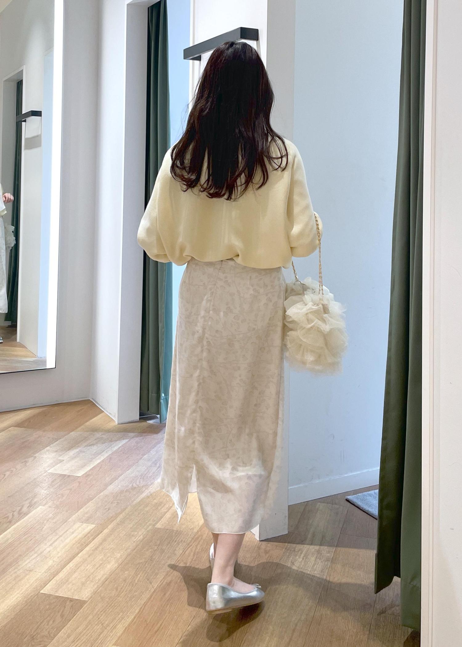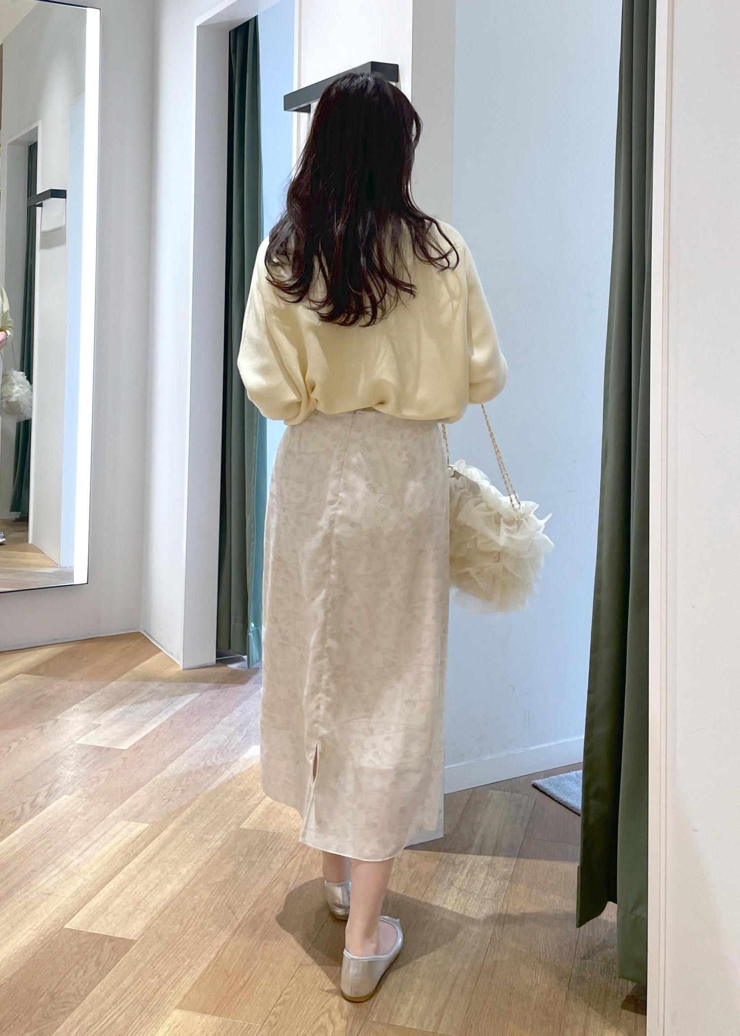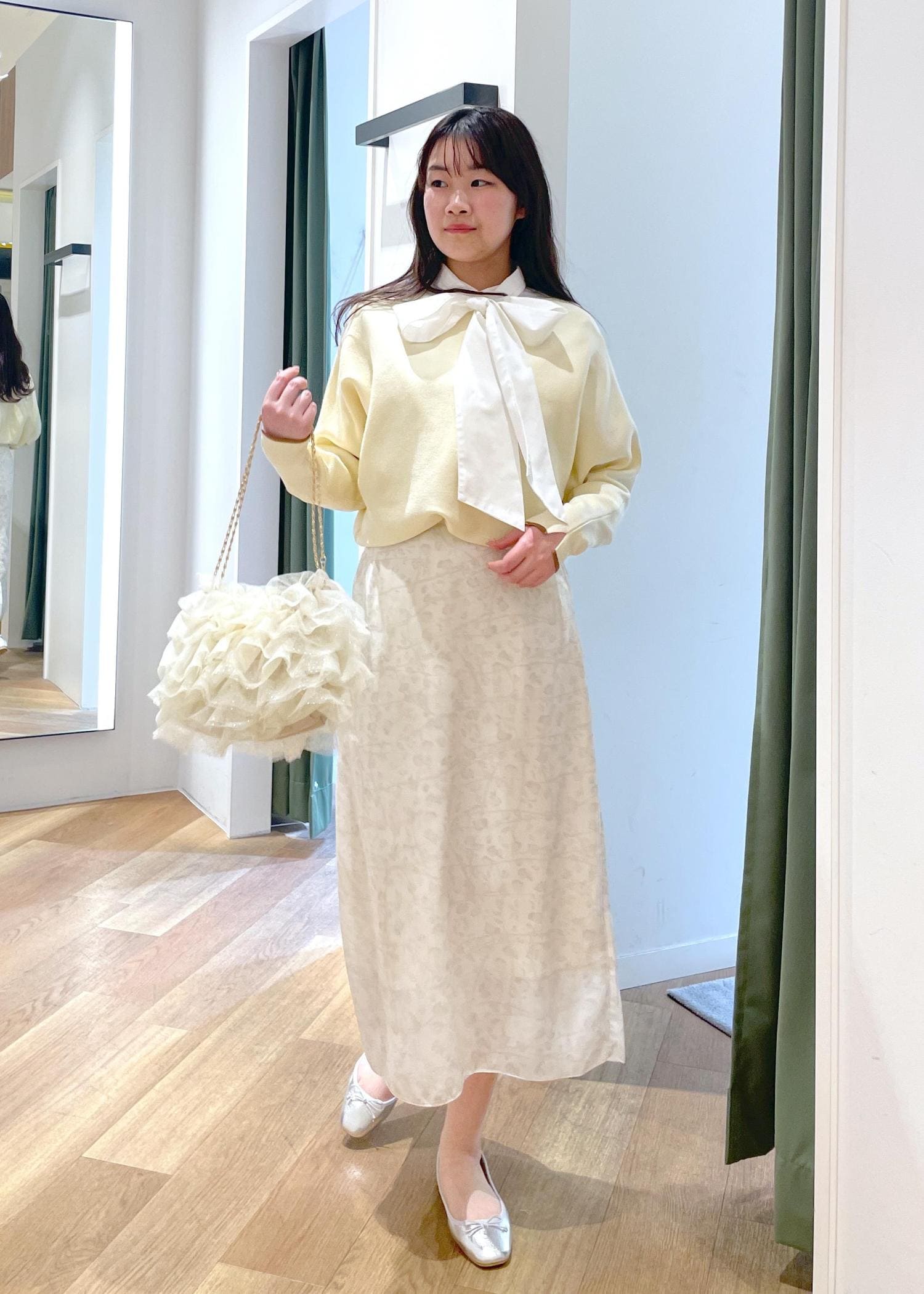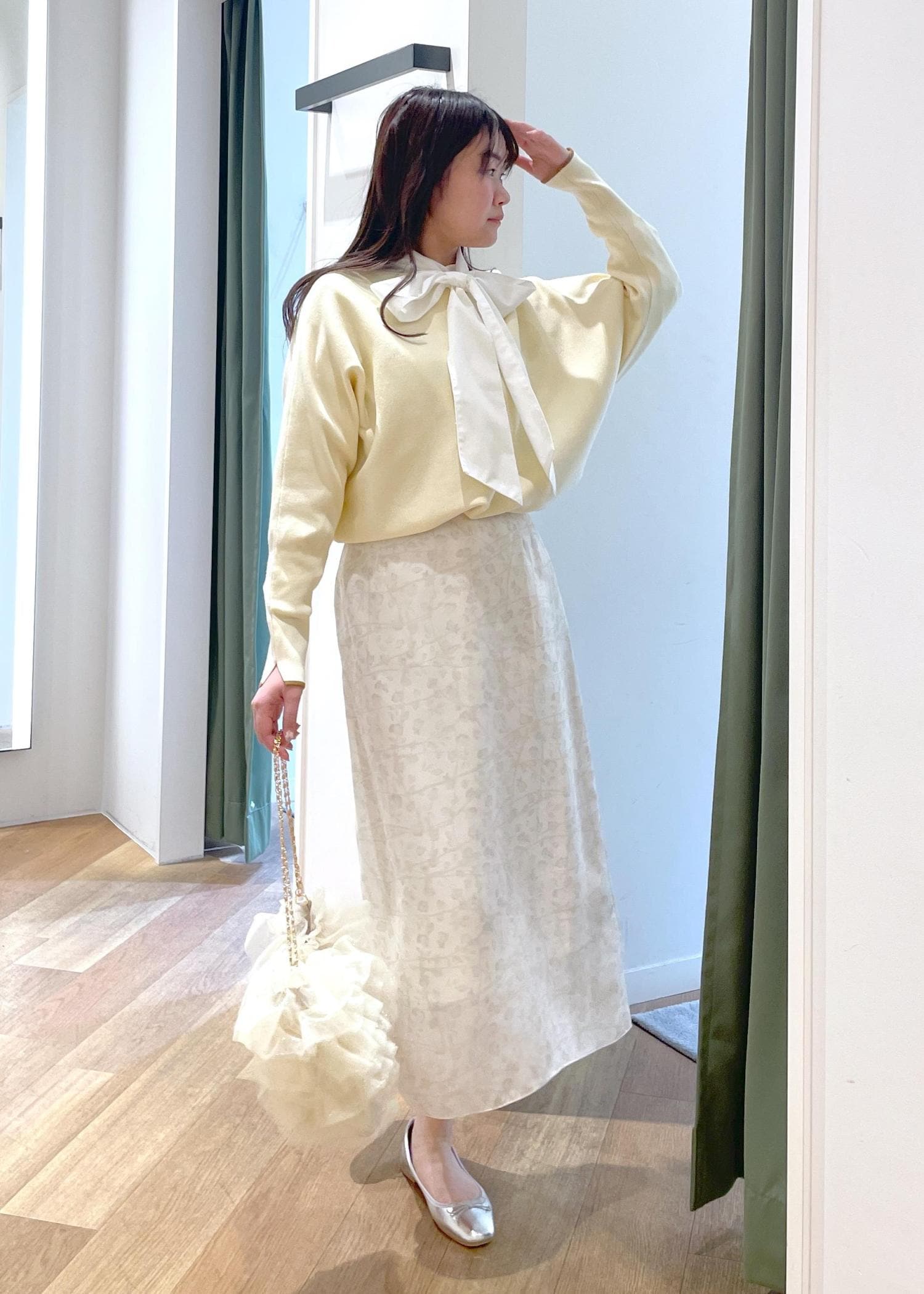 ニットはボウタイブラウスとレイヤードし、甘さをプラスしました。