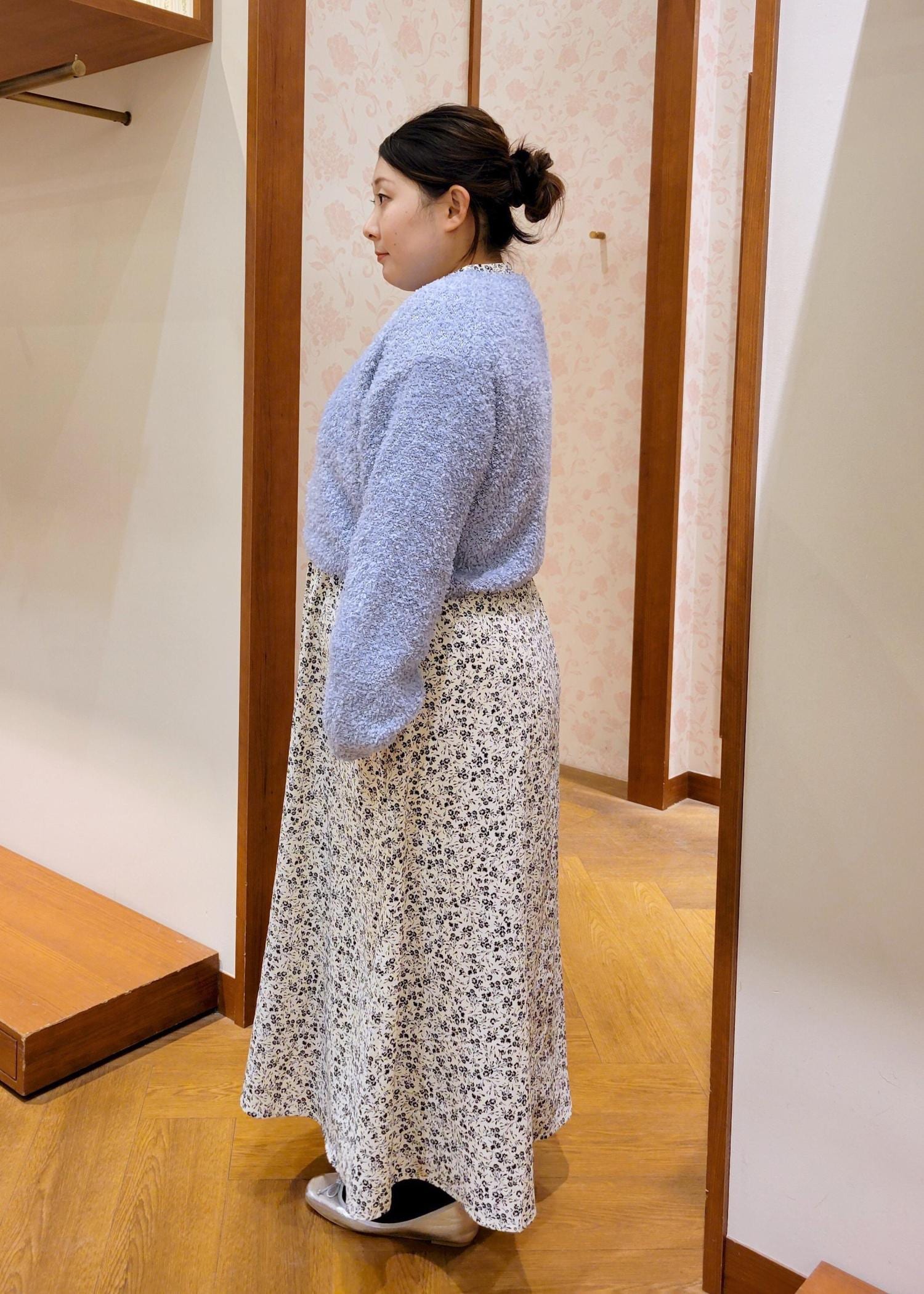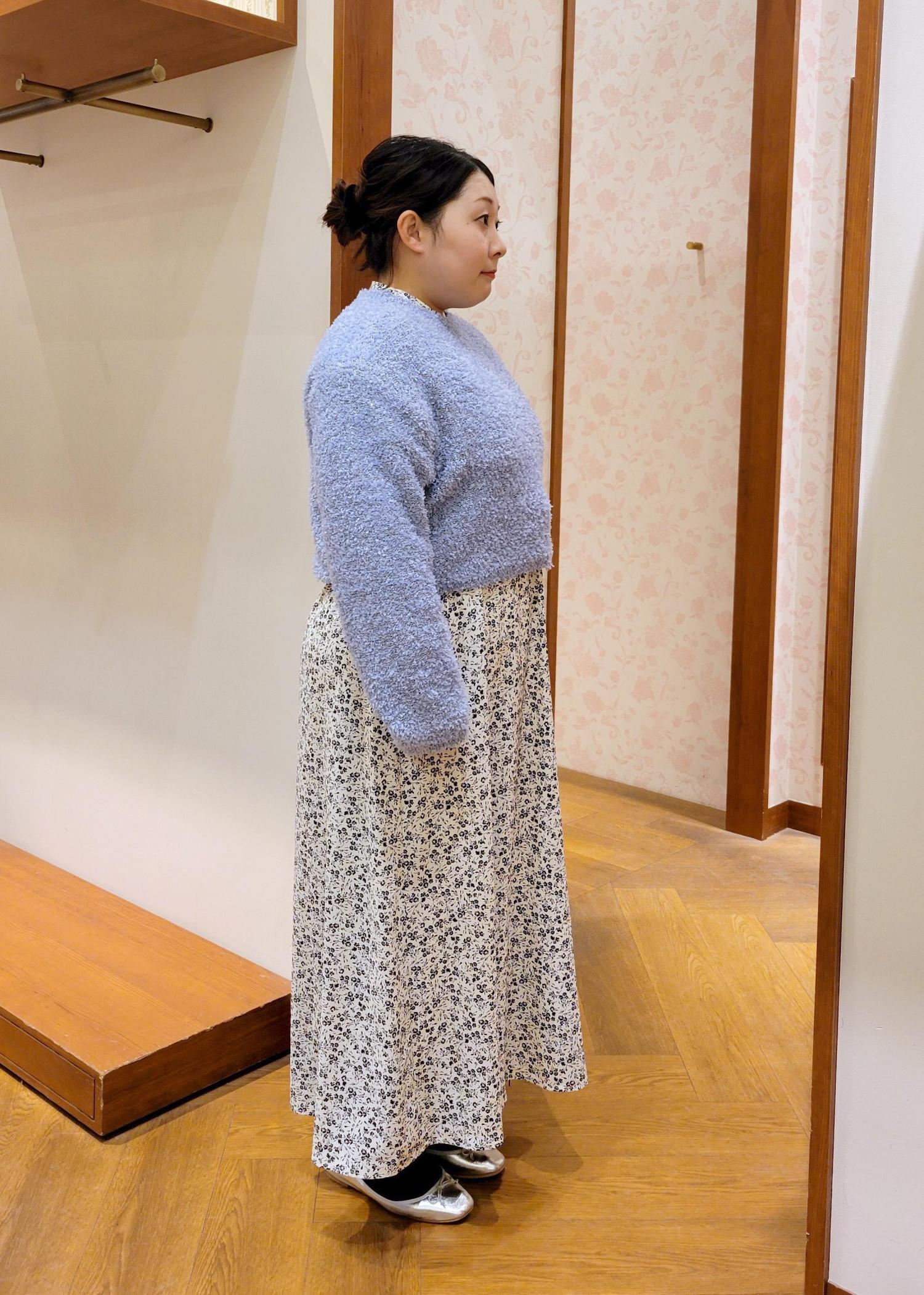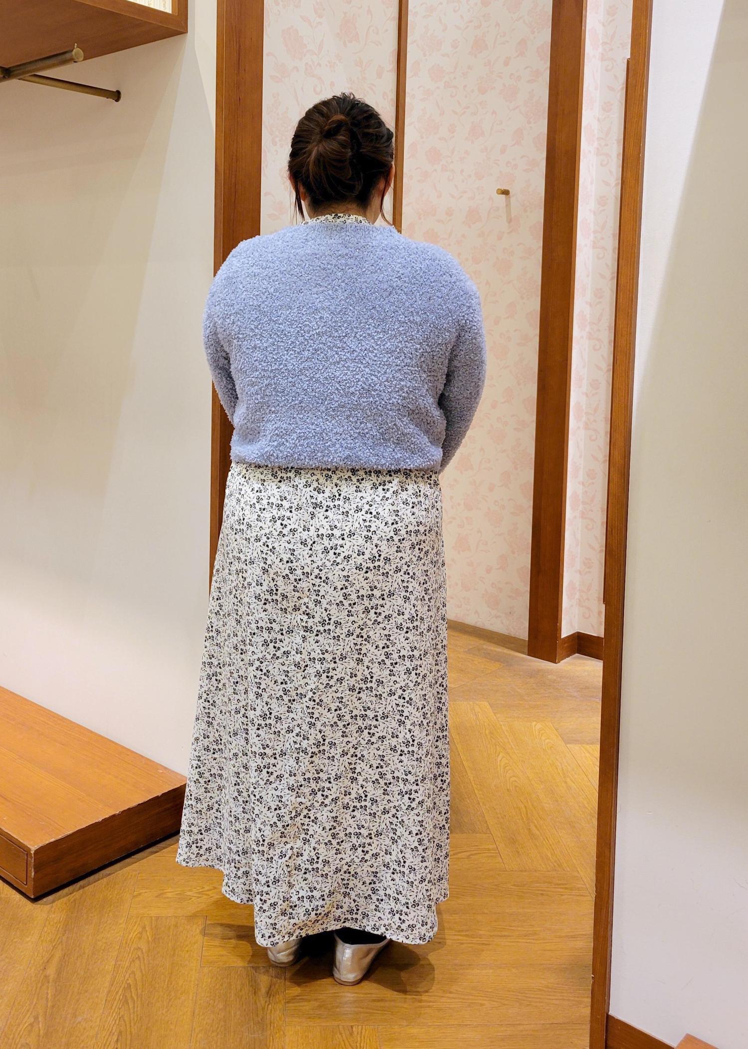 花柄ワンピースの上にモコモコニットを合わせたコーディネートです。ワンピースをスカートのように合わせました!