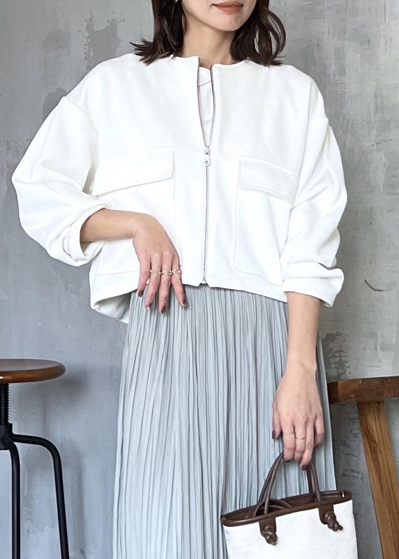 春の軽い羽織におすすめのブルゾンは、幾何学柄のジャガード生地でコーデの主役に◎。