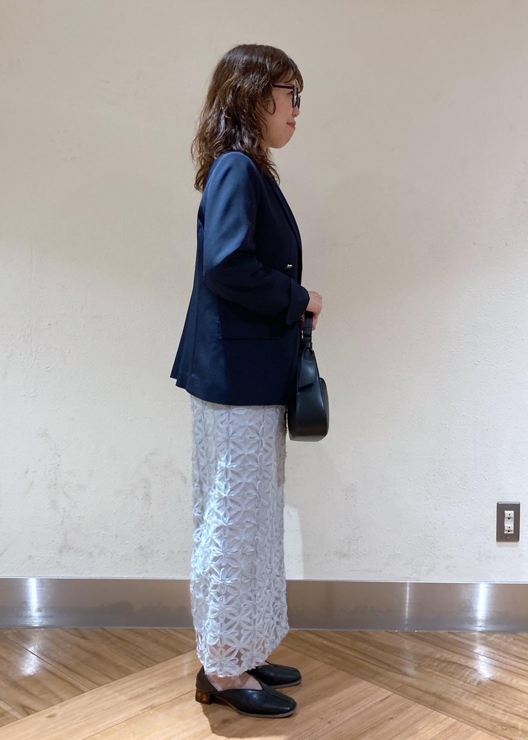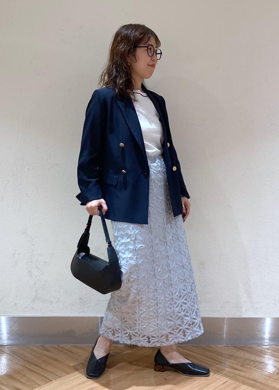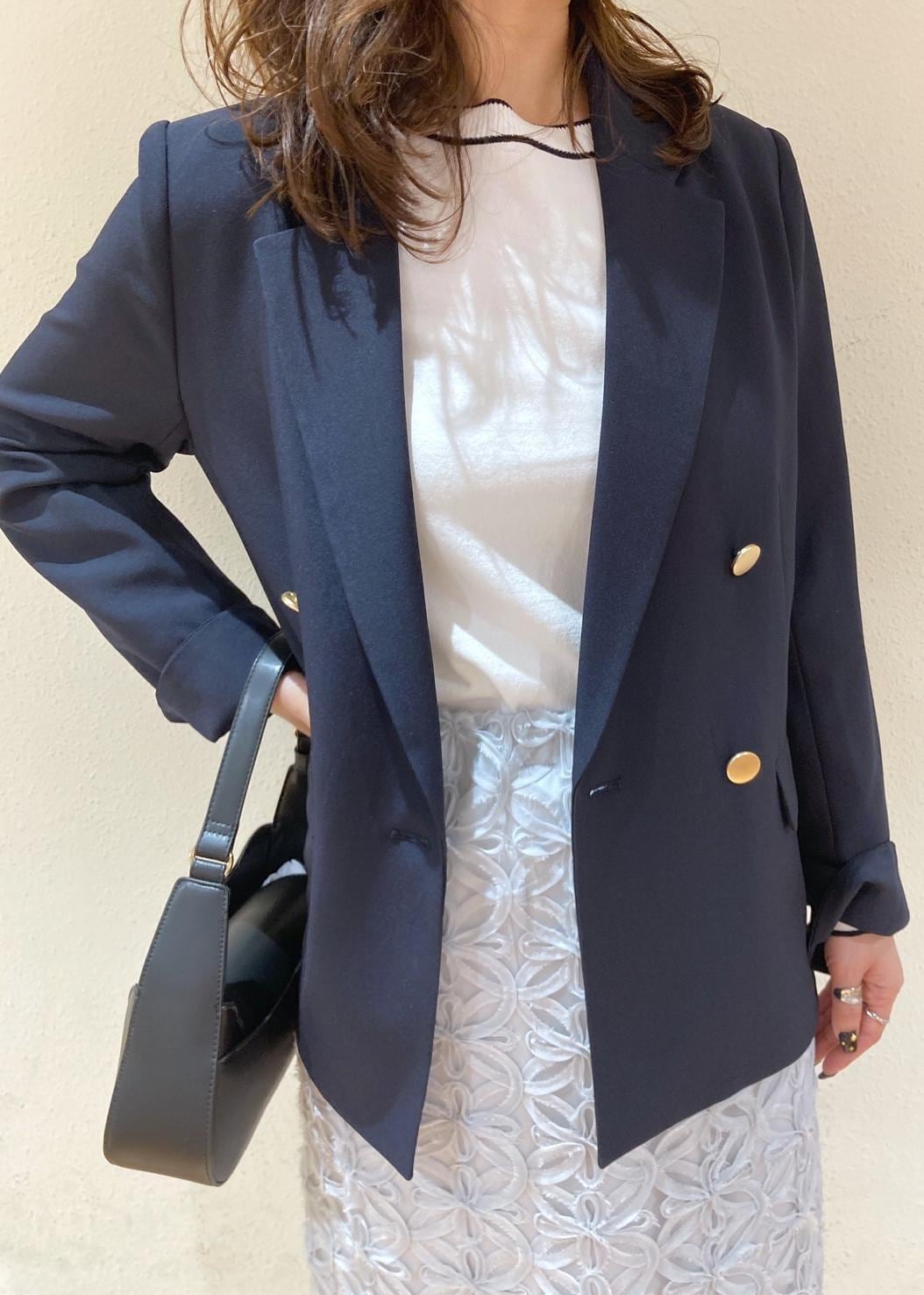 金ボタンジャケットに、レーススカートをあわせてきれいめコーデにしました。