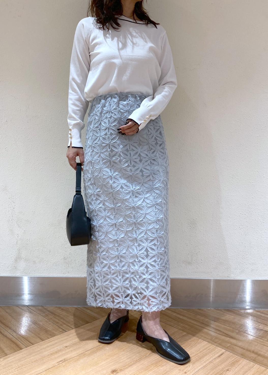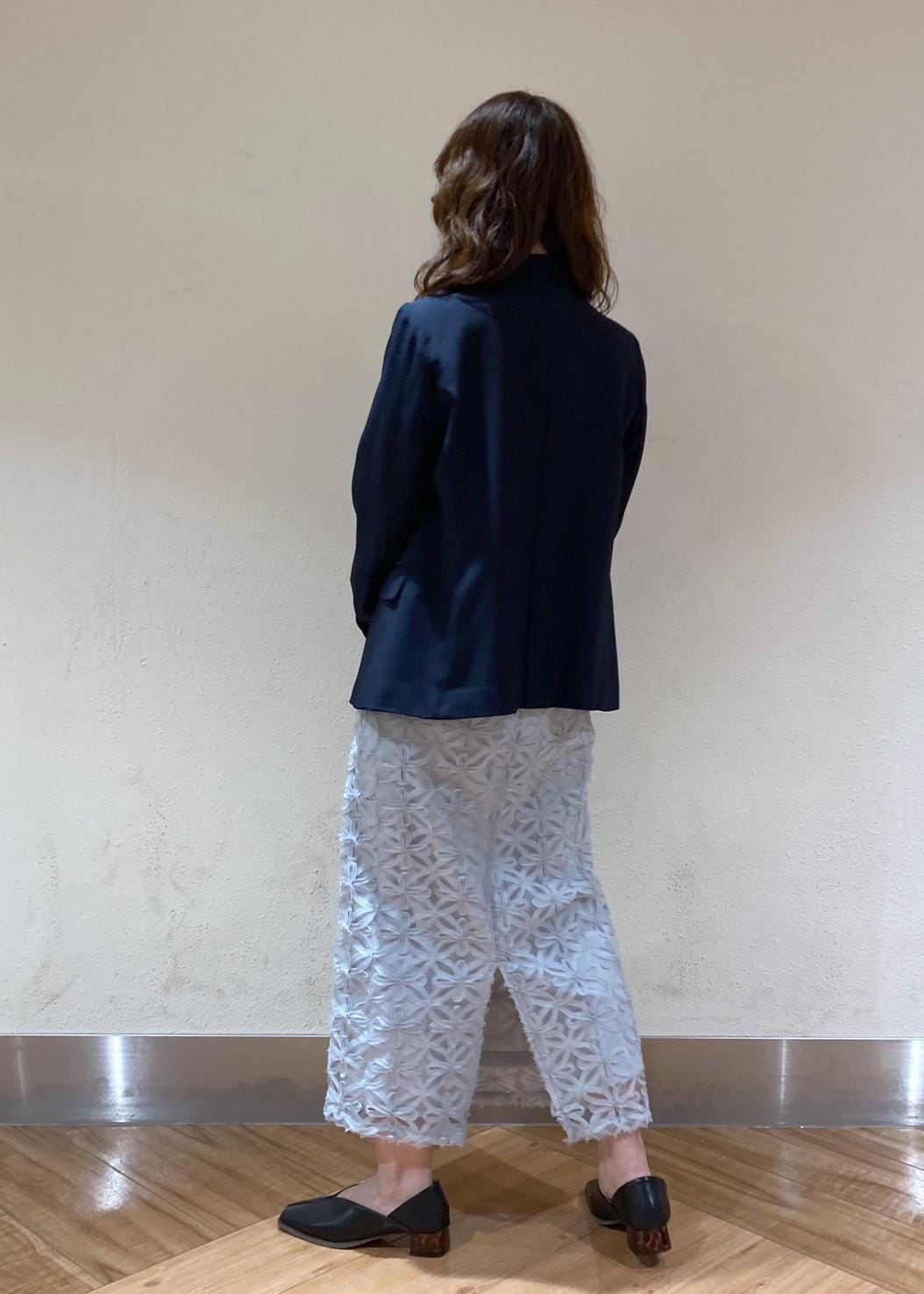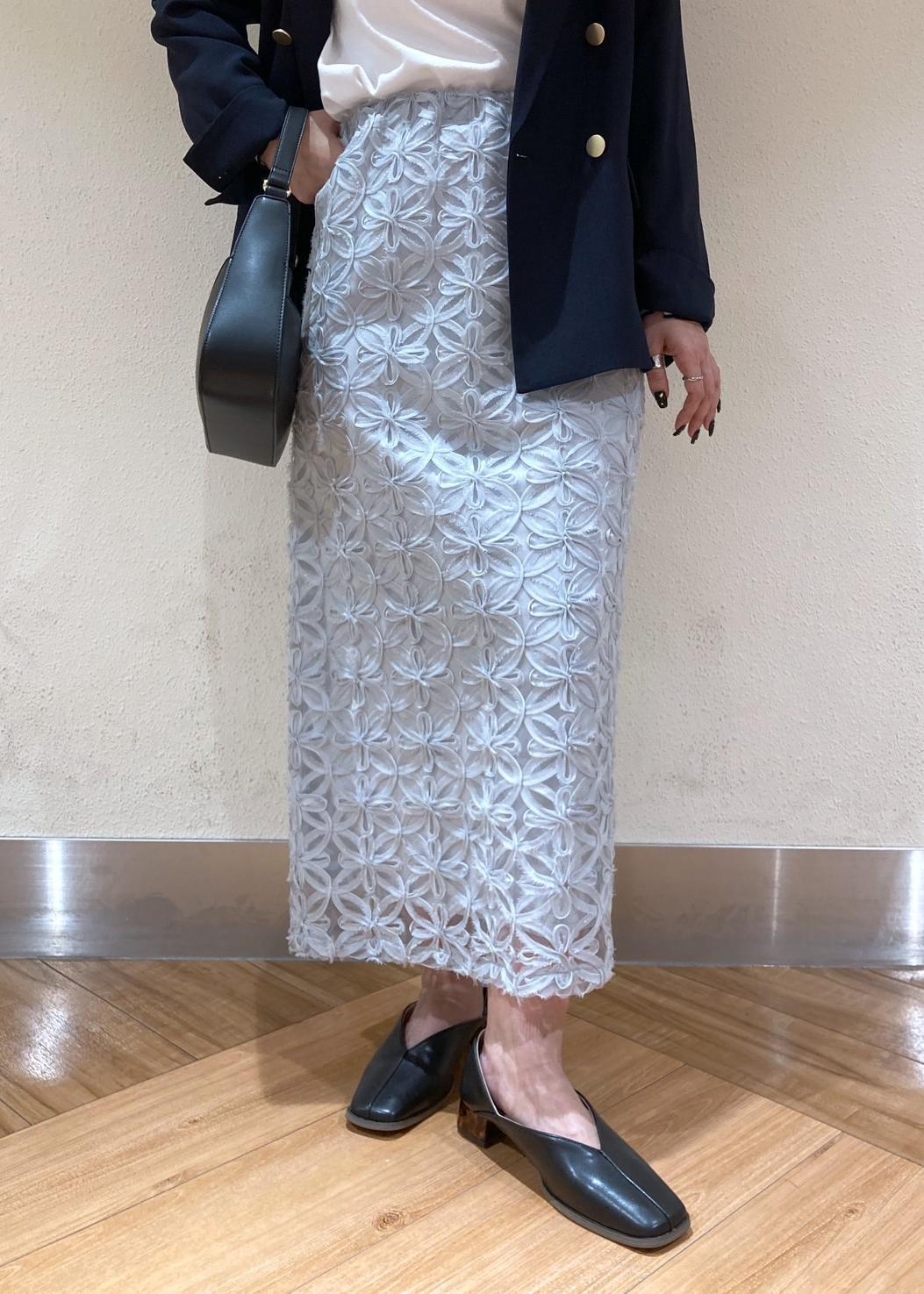 金ボタンジャケットに、レーススカートをあわせてきれいめコーデにしました。