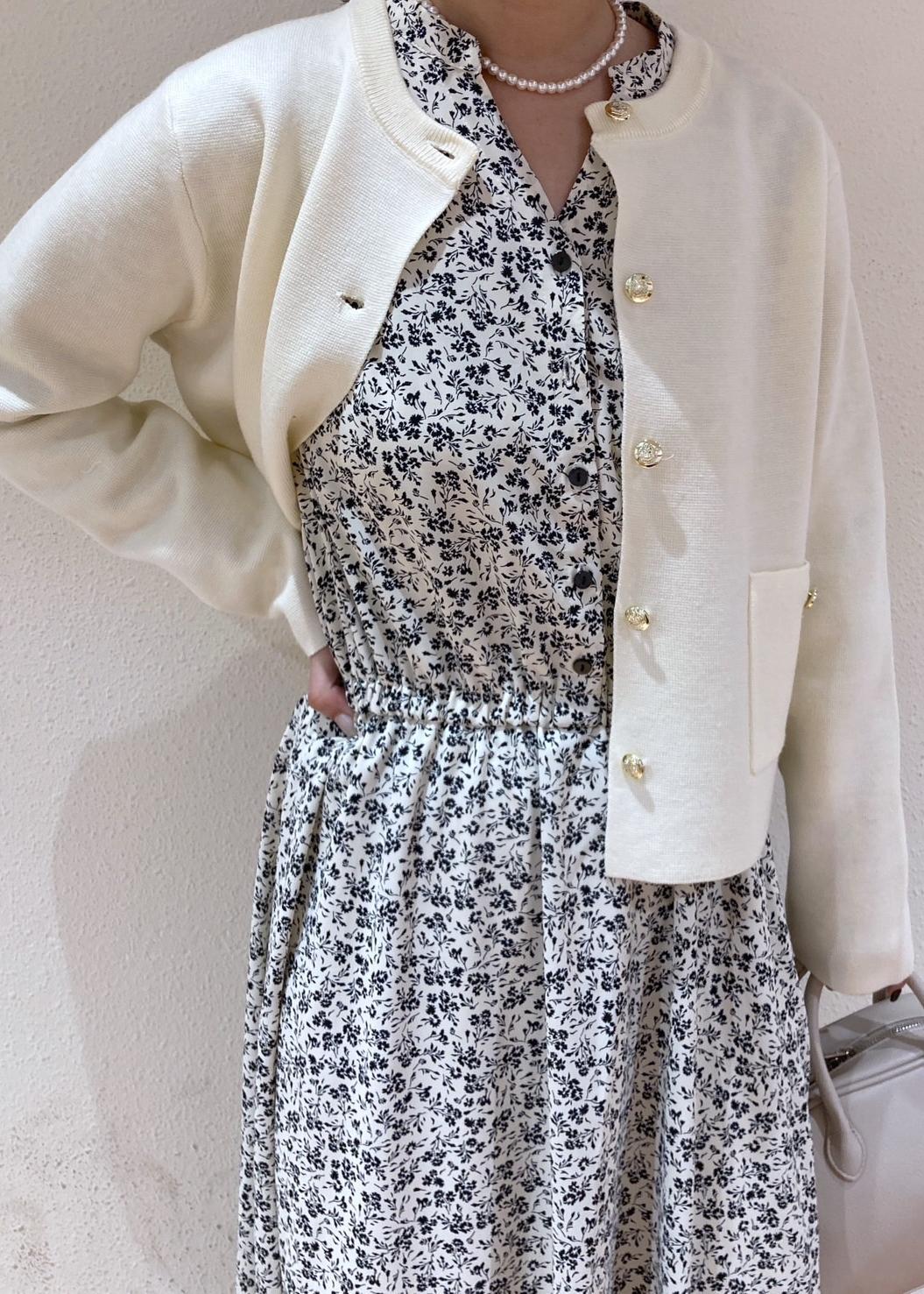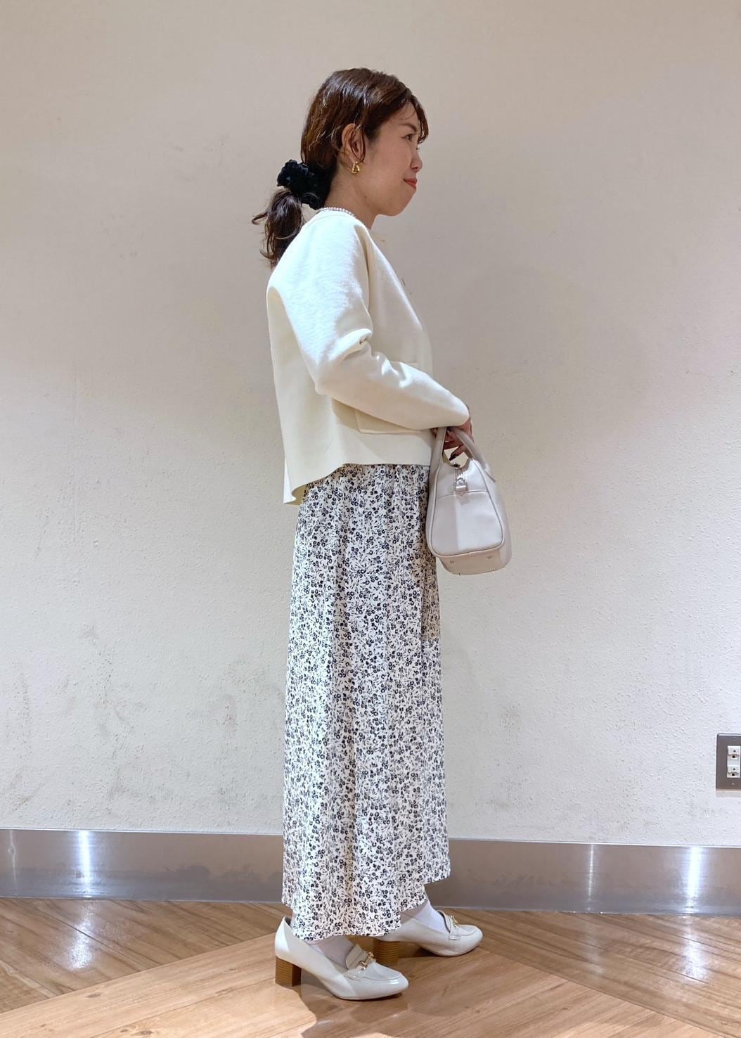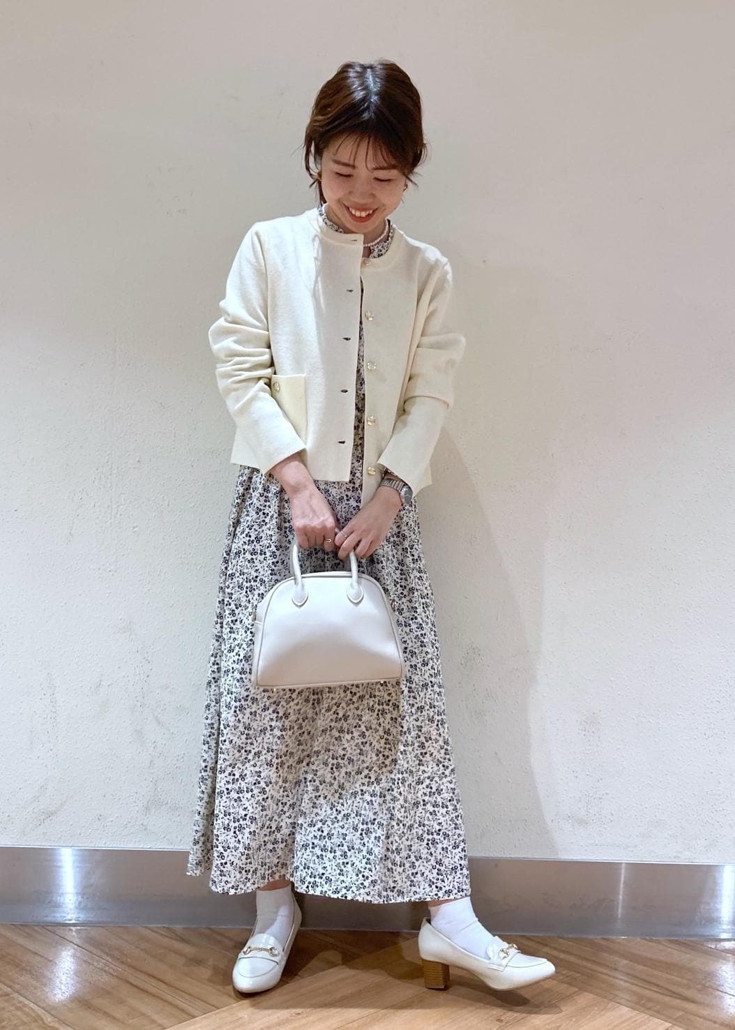 春らしい小花柄ワンピースに、ミラノリブのカーディガンを羽織りました。ホワイトとイエローが一気に春らしく見せてくれます。