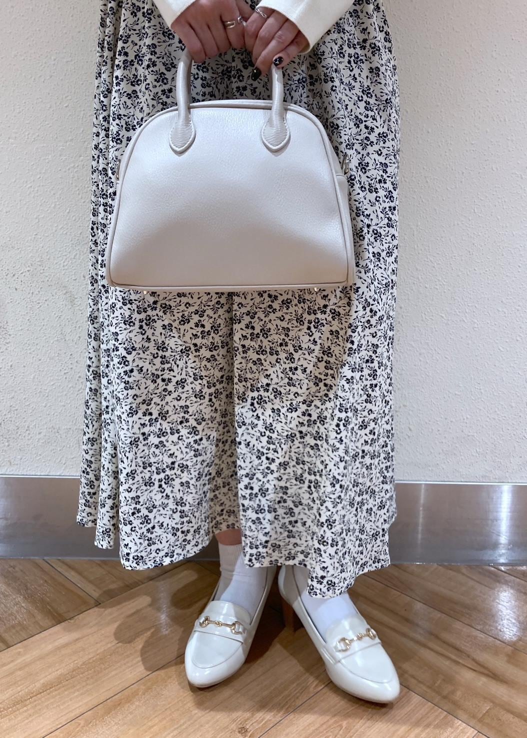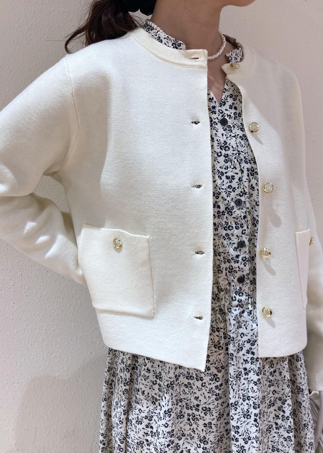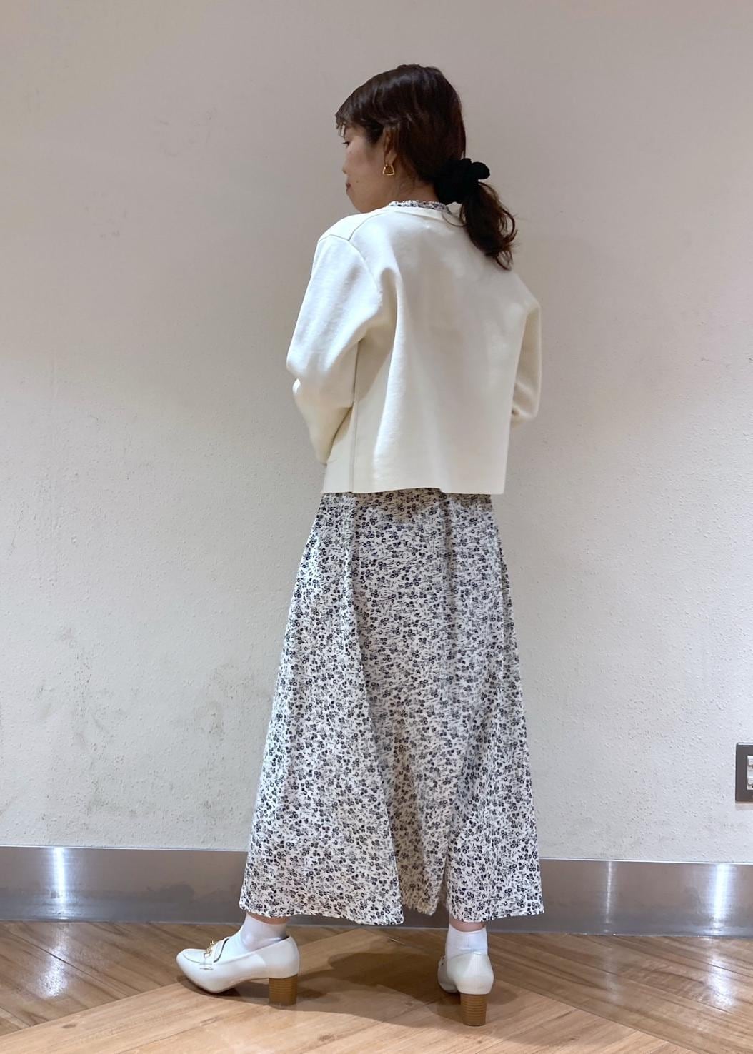 春らしい小花柄ワンピースに、ミラノリブのカーディガンを羽織りました。ホワイトとイエローが一気に春らしく見せてくれます。