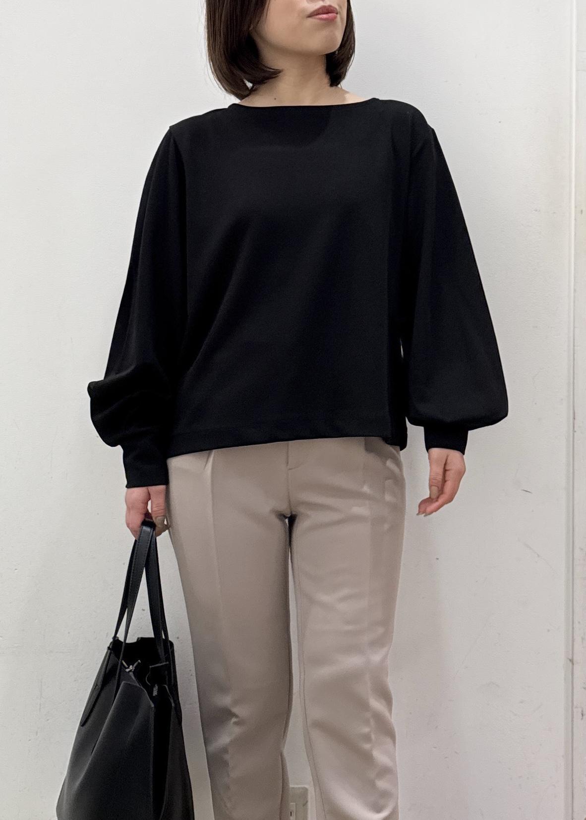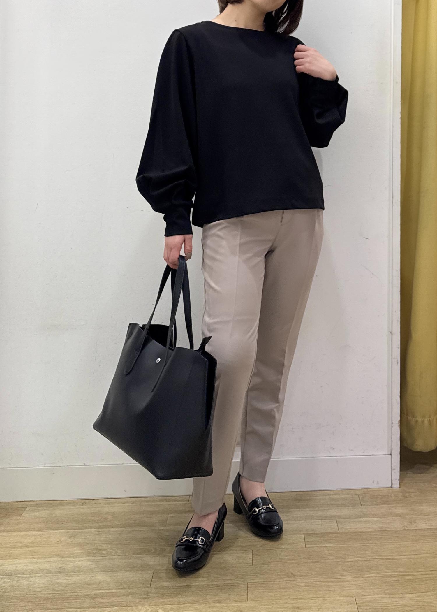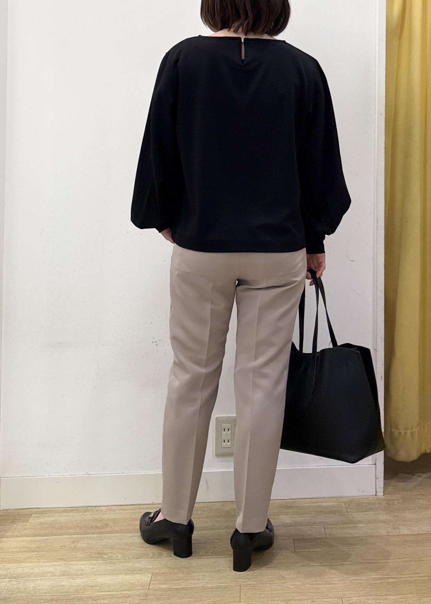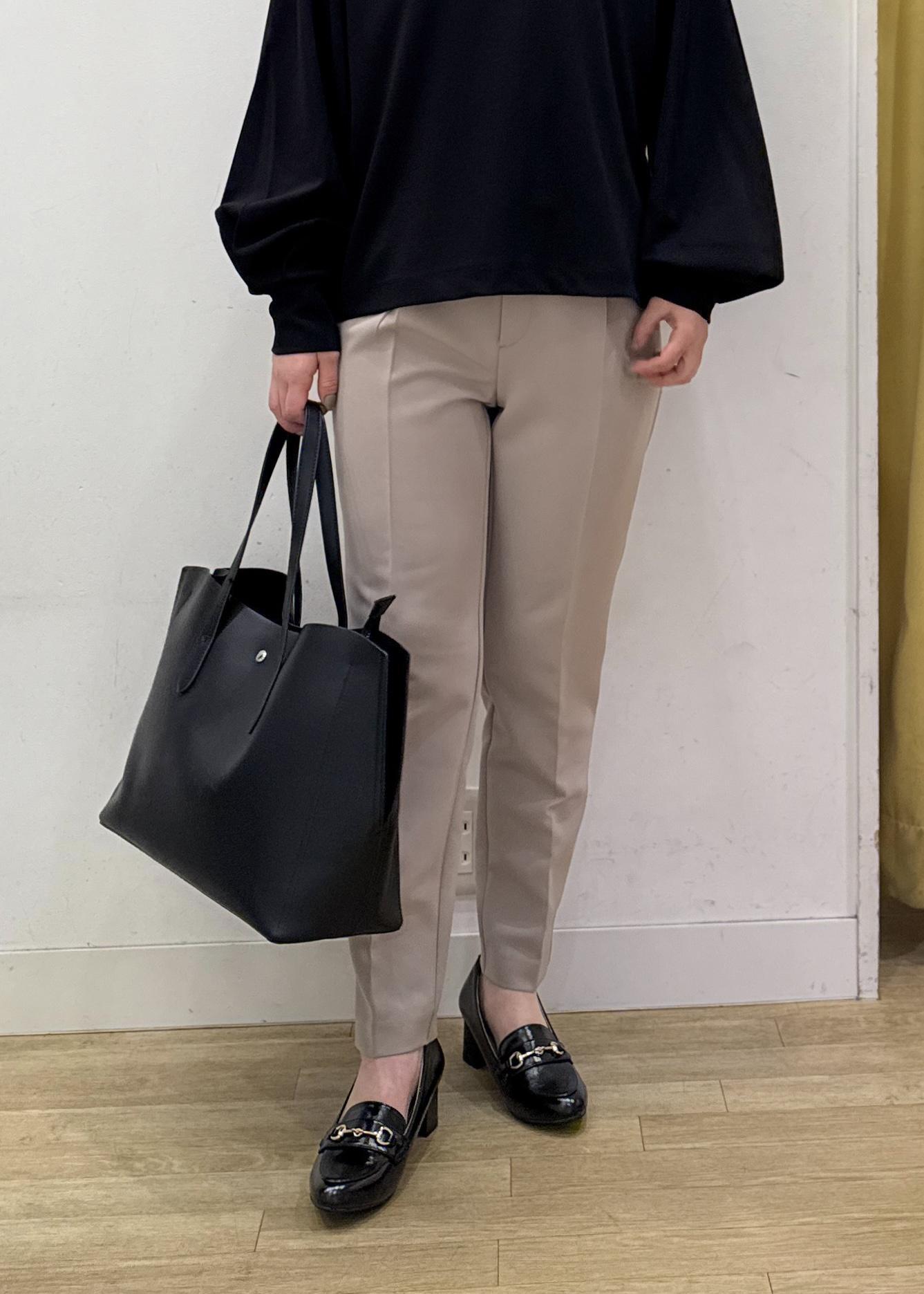 テーパードパンツにブラックのシンプルなカットトップスを合わせた、通勤カジュアルスタイリング☺︎