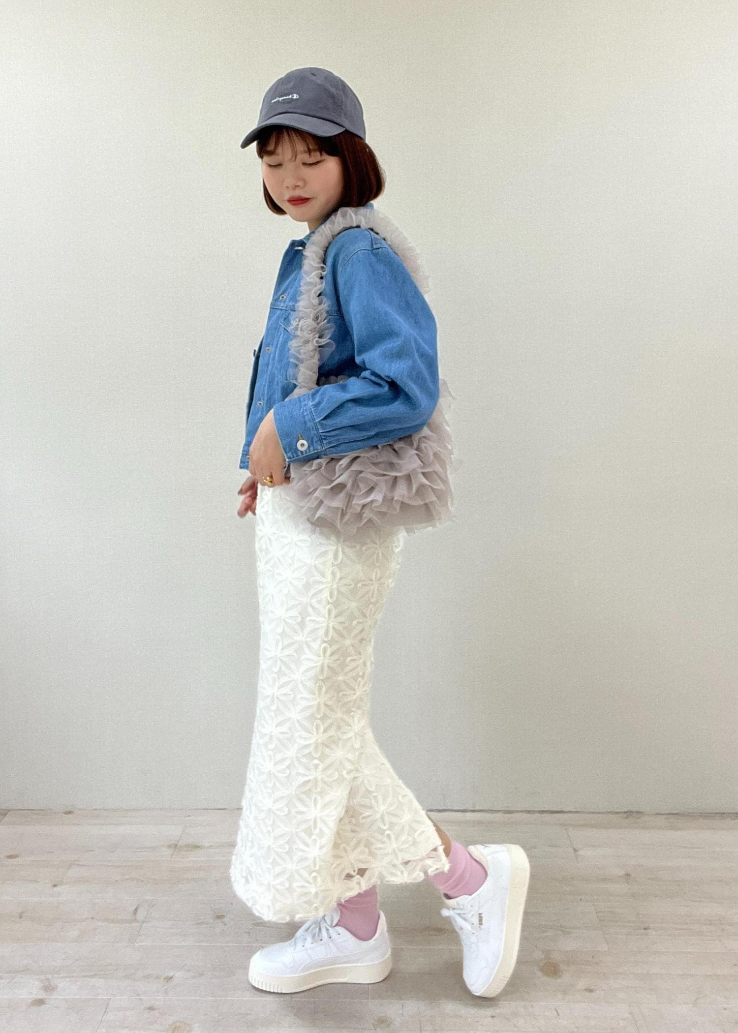 デニムジャケットのカジュアルな雰囲気に合わせるように小物はスニーカーやキャップをプラス◎