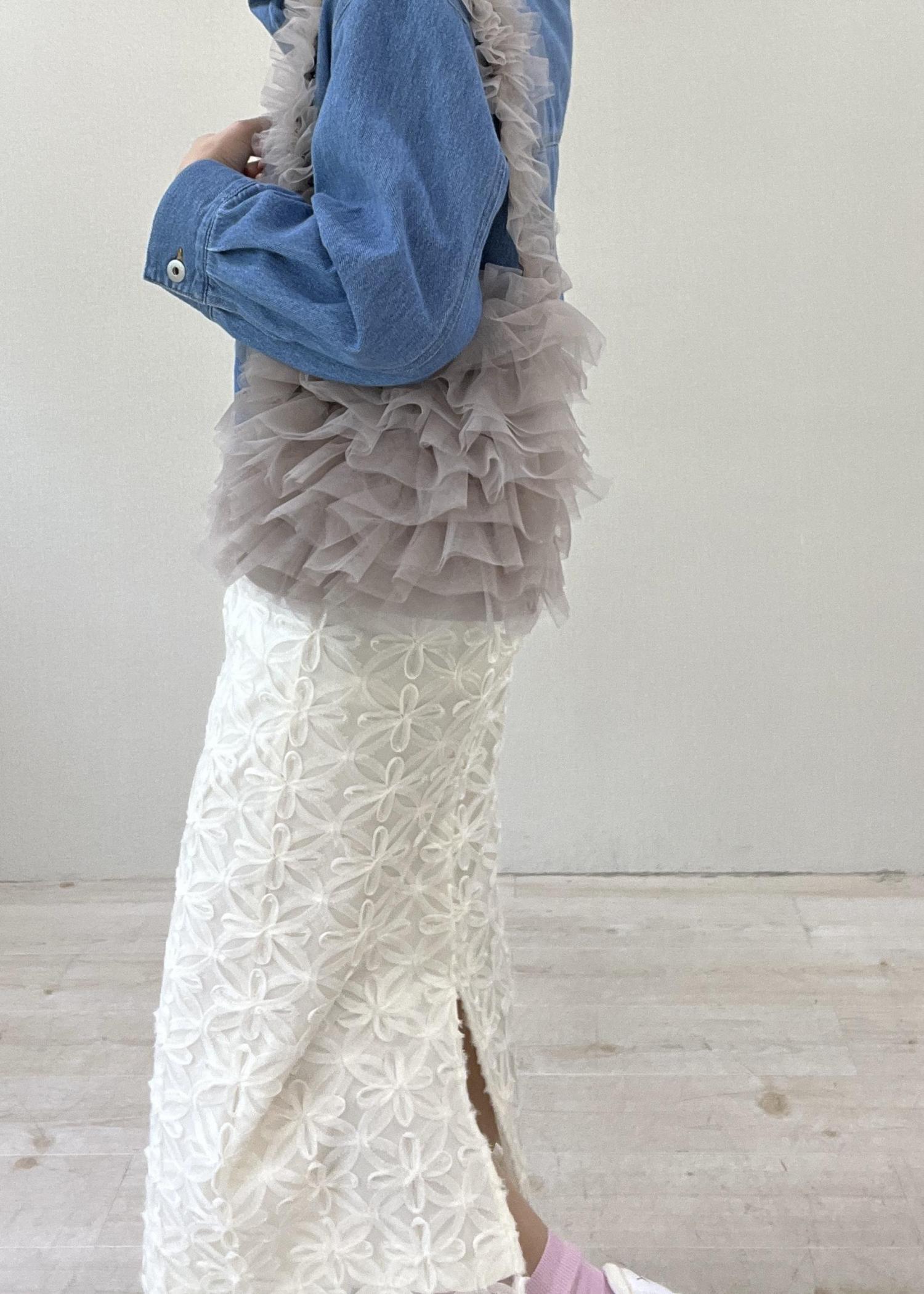 スカートは、立体感のある花柄で華やかさがありますが、ワントーンでスッと馴染みやすいので柄物のトップスと合わせてもケンカする事なくコーディネート出来ました。