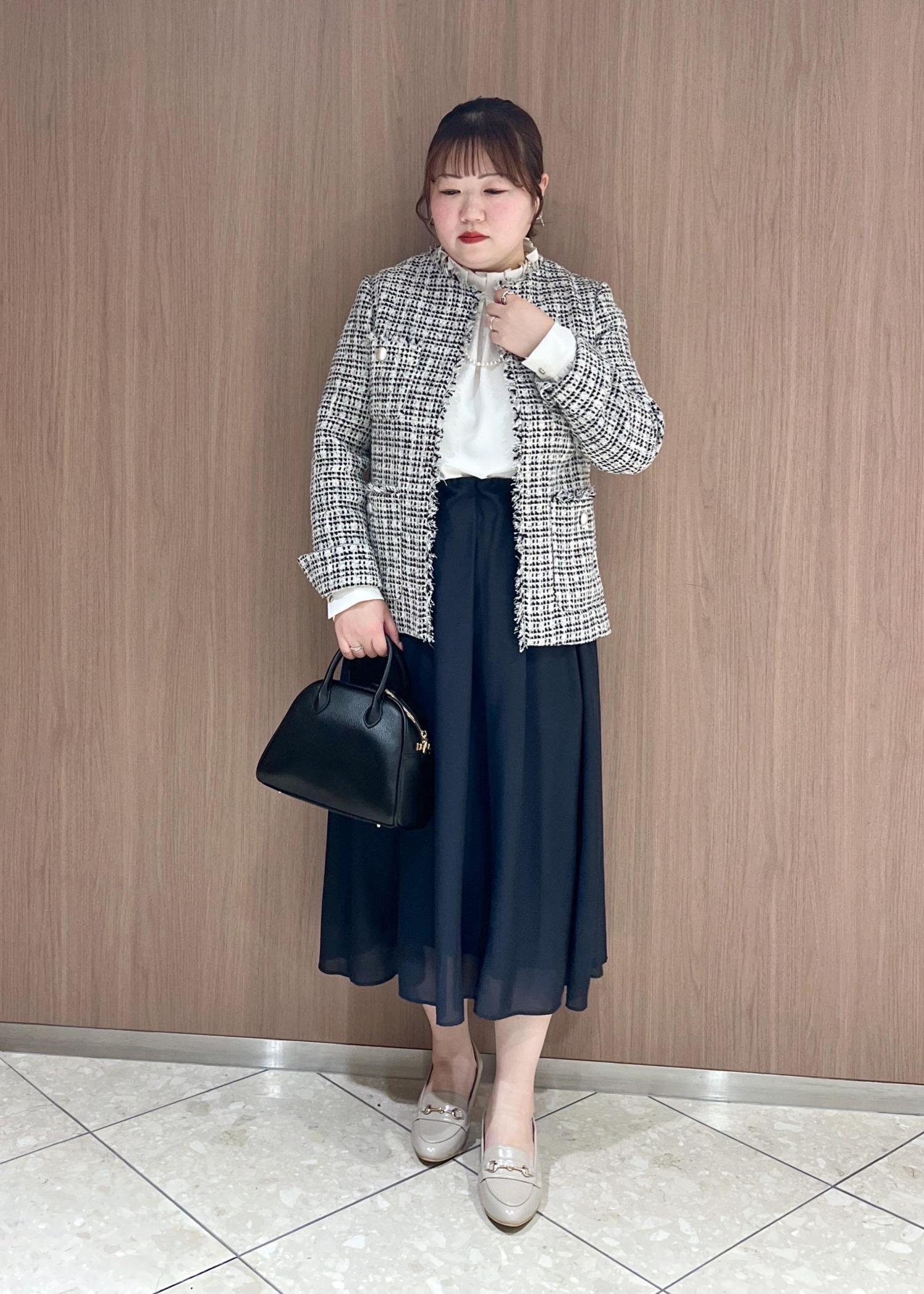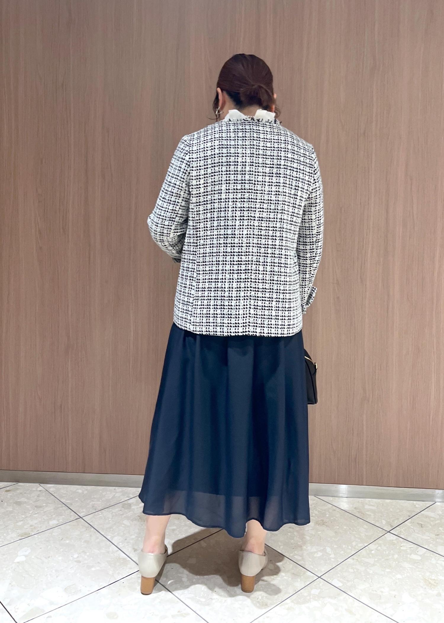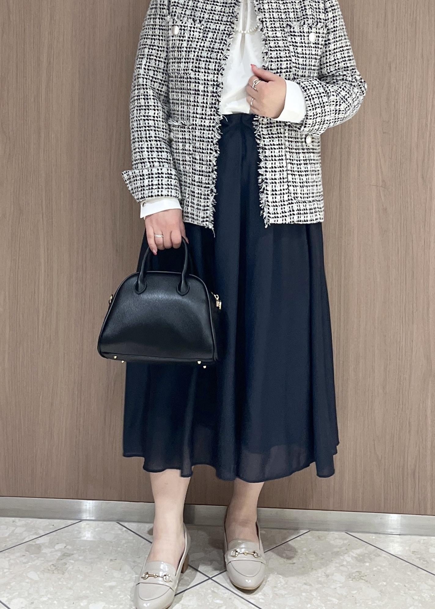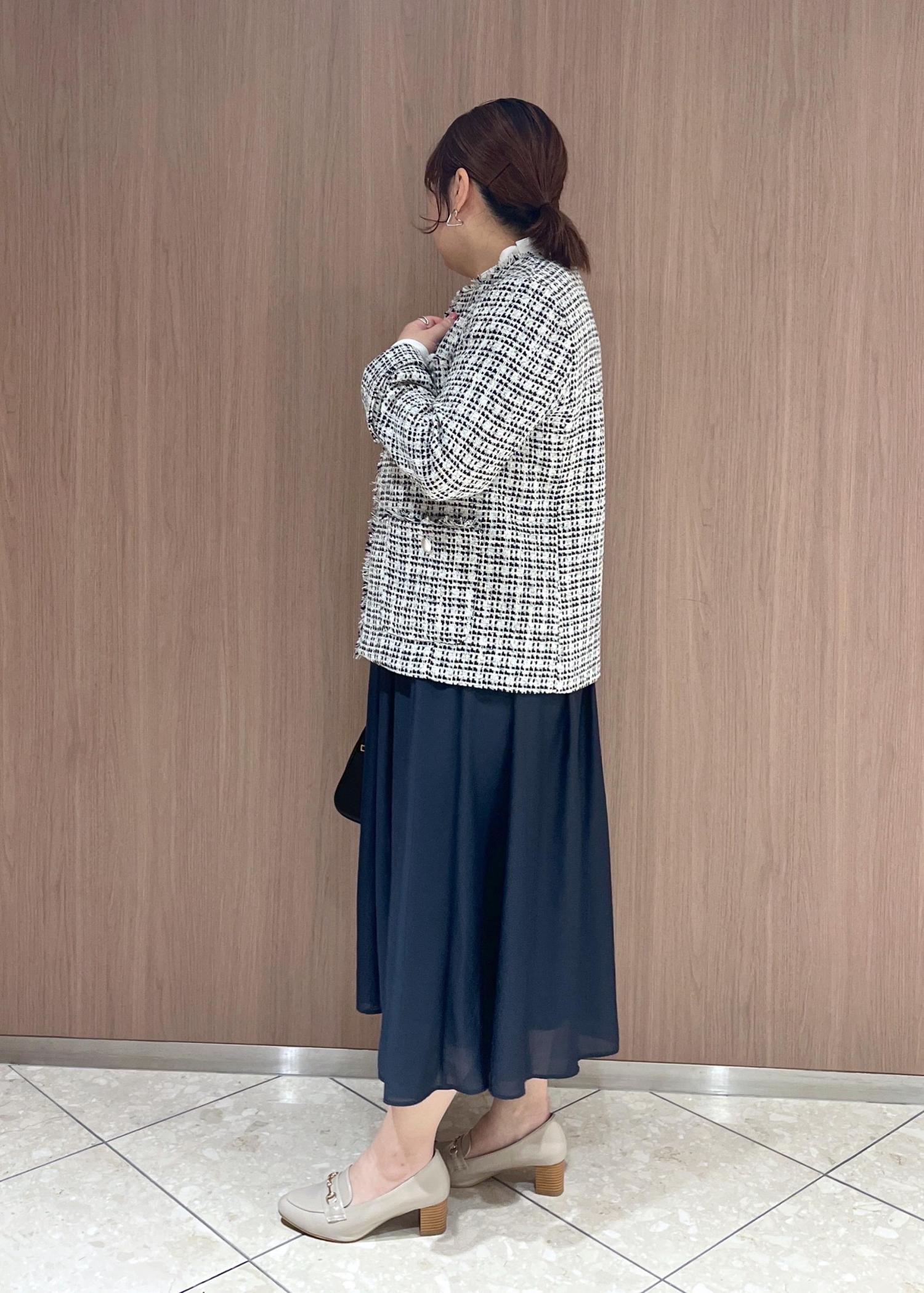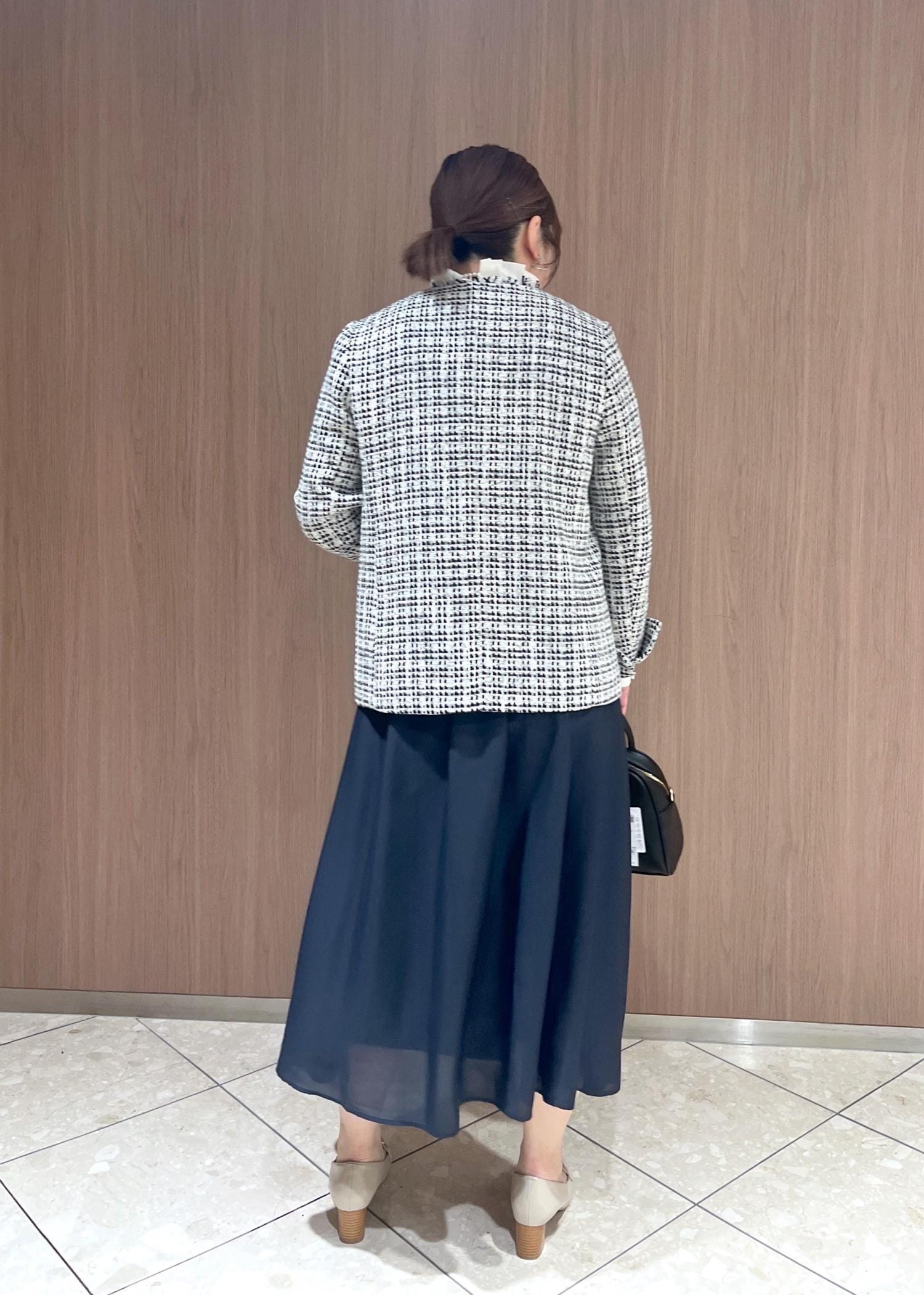 ツイードジャケットをスカートで合わせたセレモニーにもおすすめのコーディネートです。
