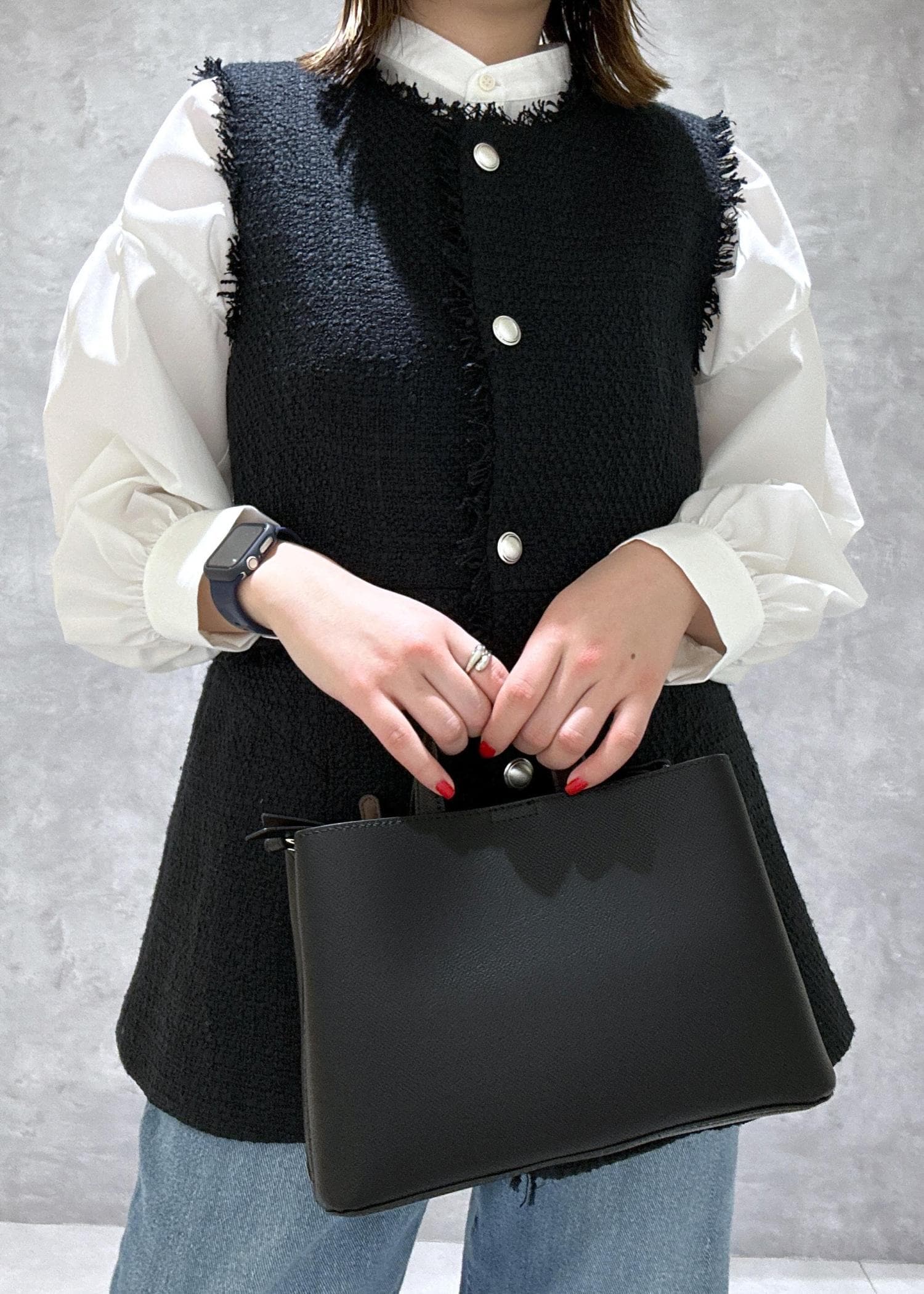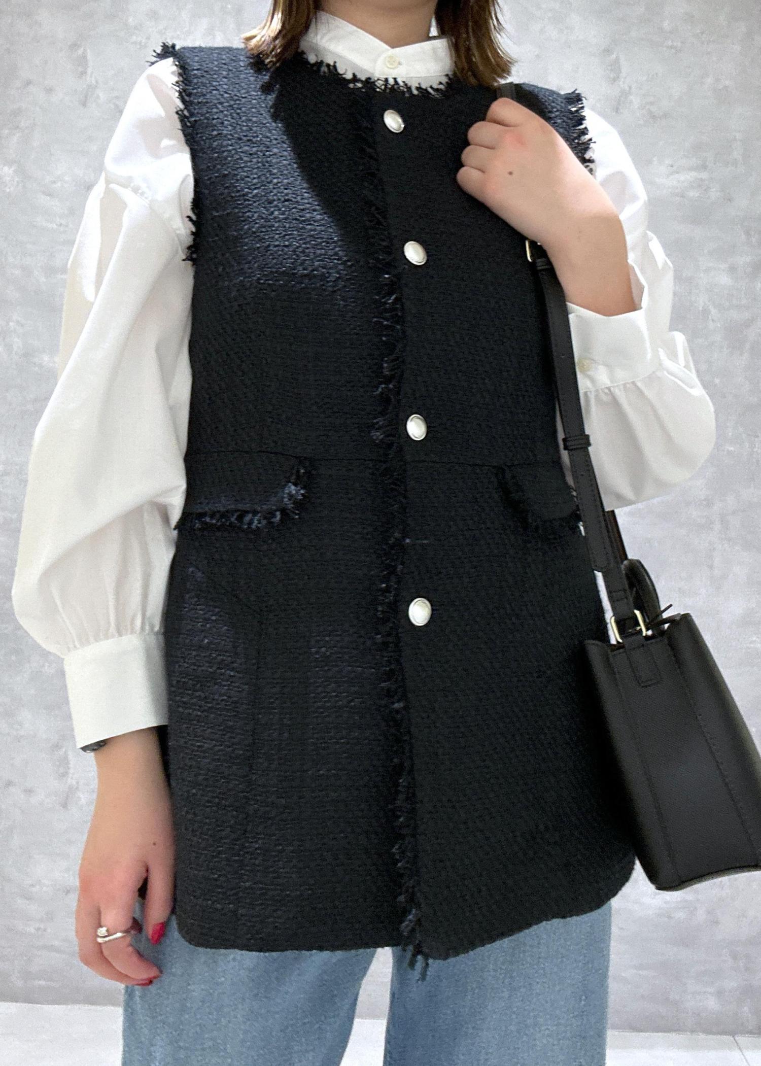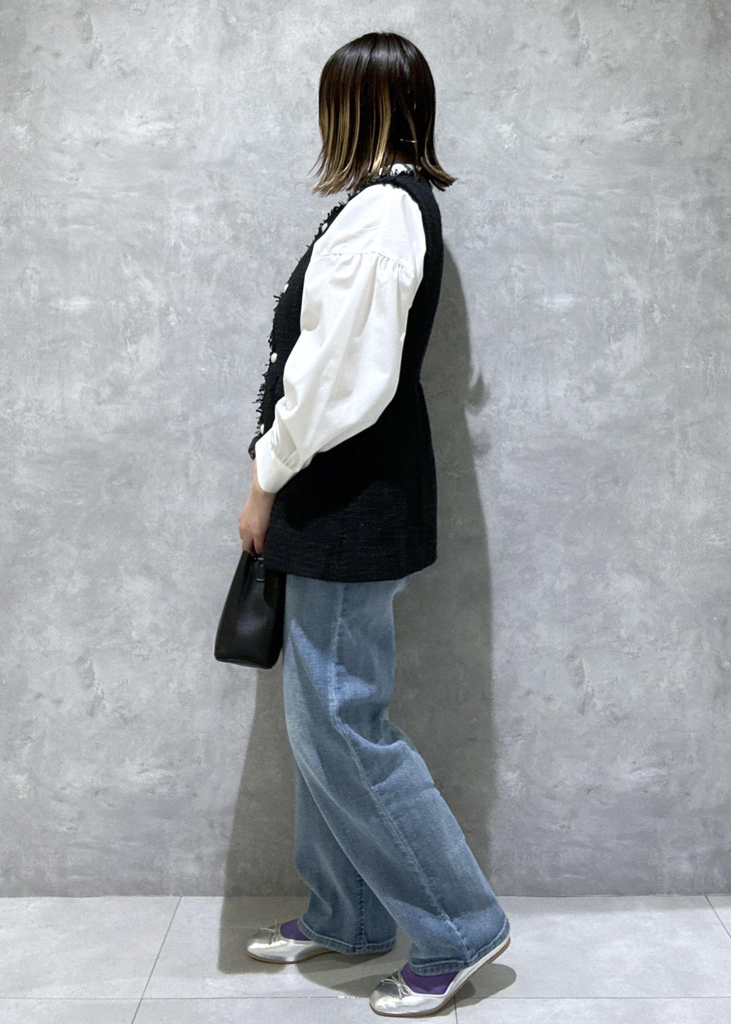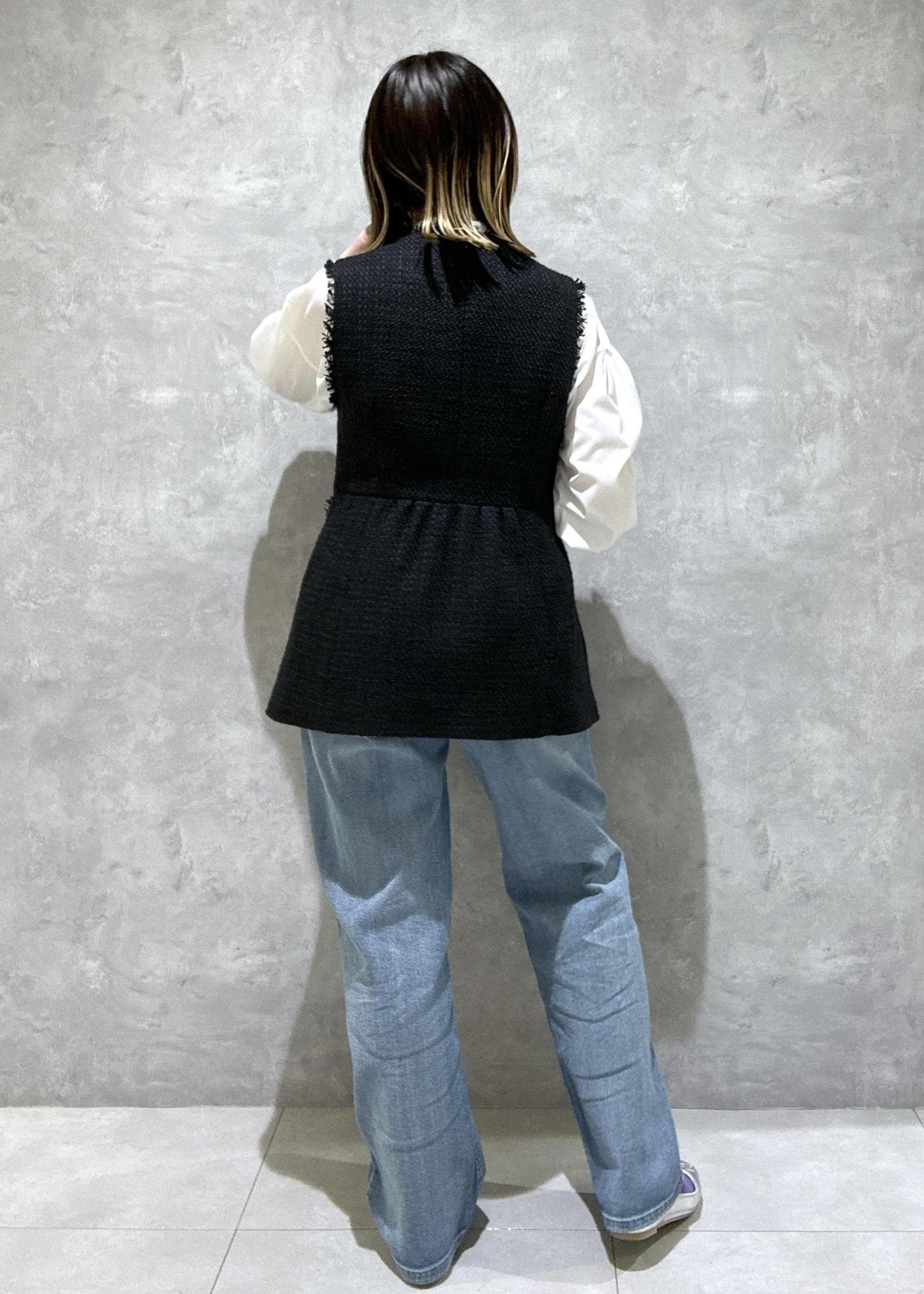 セレモニーなどでお使いいだけるツイードジレですが、デニムと合わせるだけで大人カジュアルなコーデになります!カチッとしすぎず、きれいめに着られます。