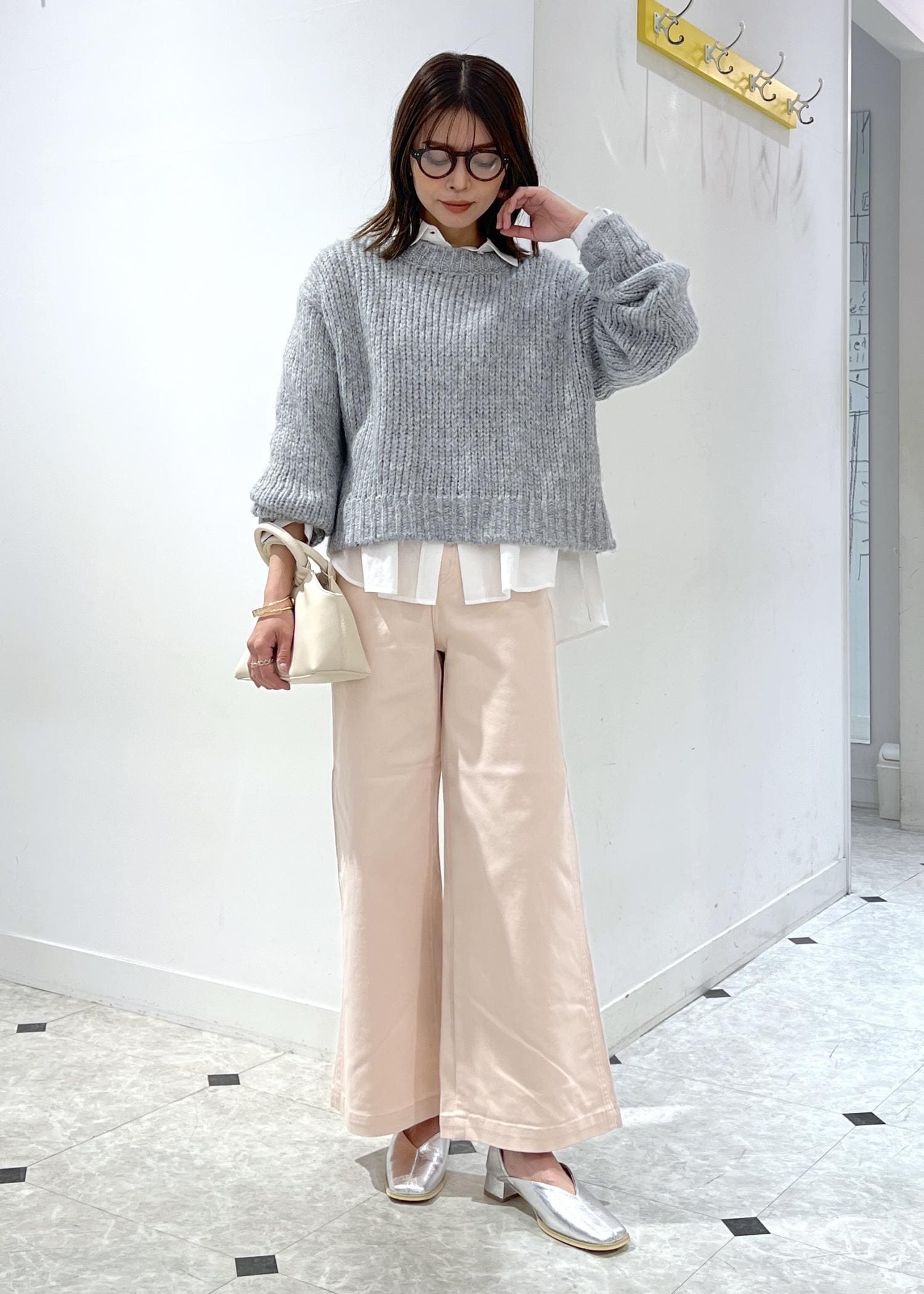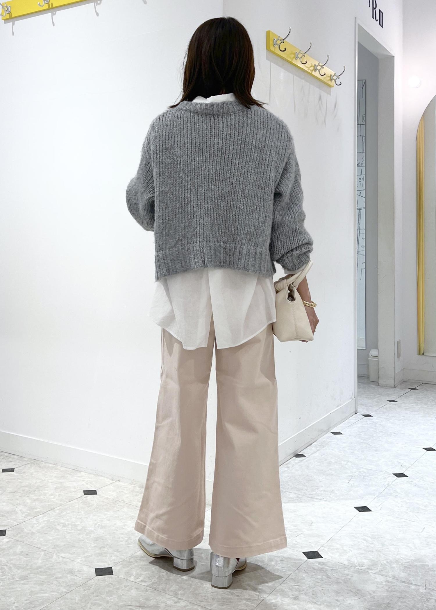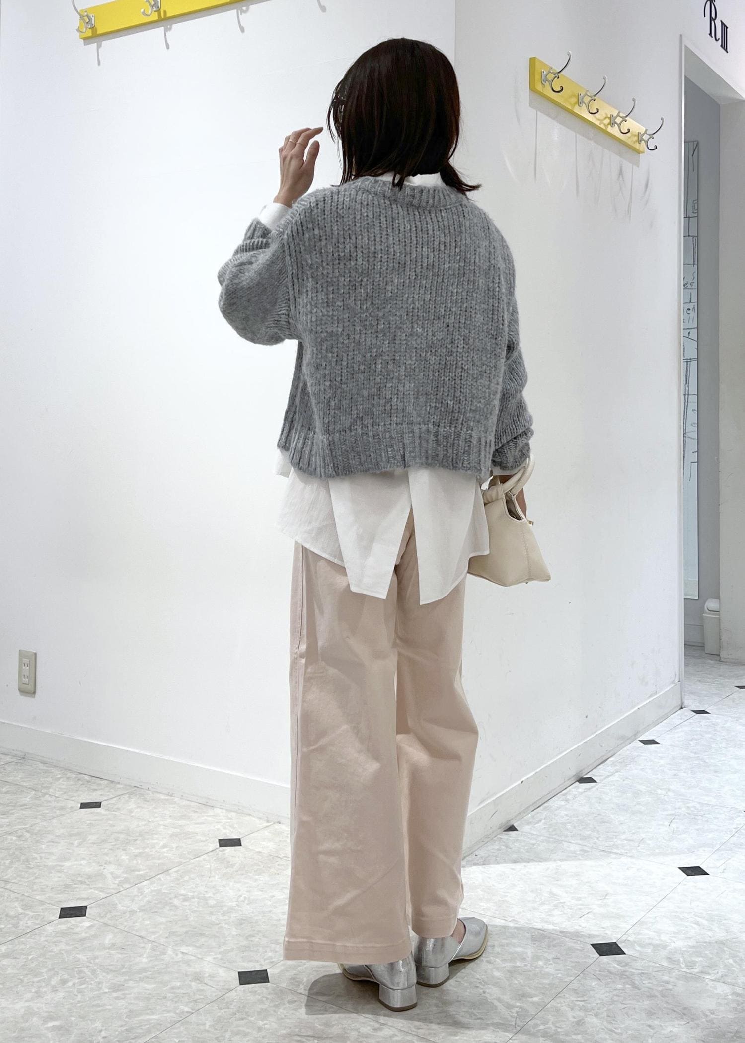 短めの丈感のグレーニットは、シャツをレイヤードして大人っぽさのあるカジュアルコーデに。
