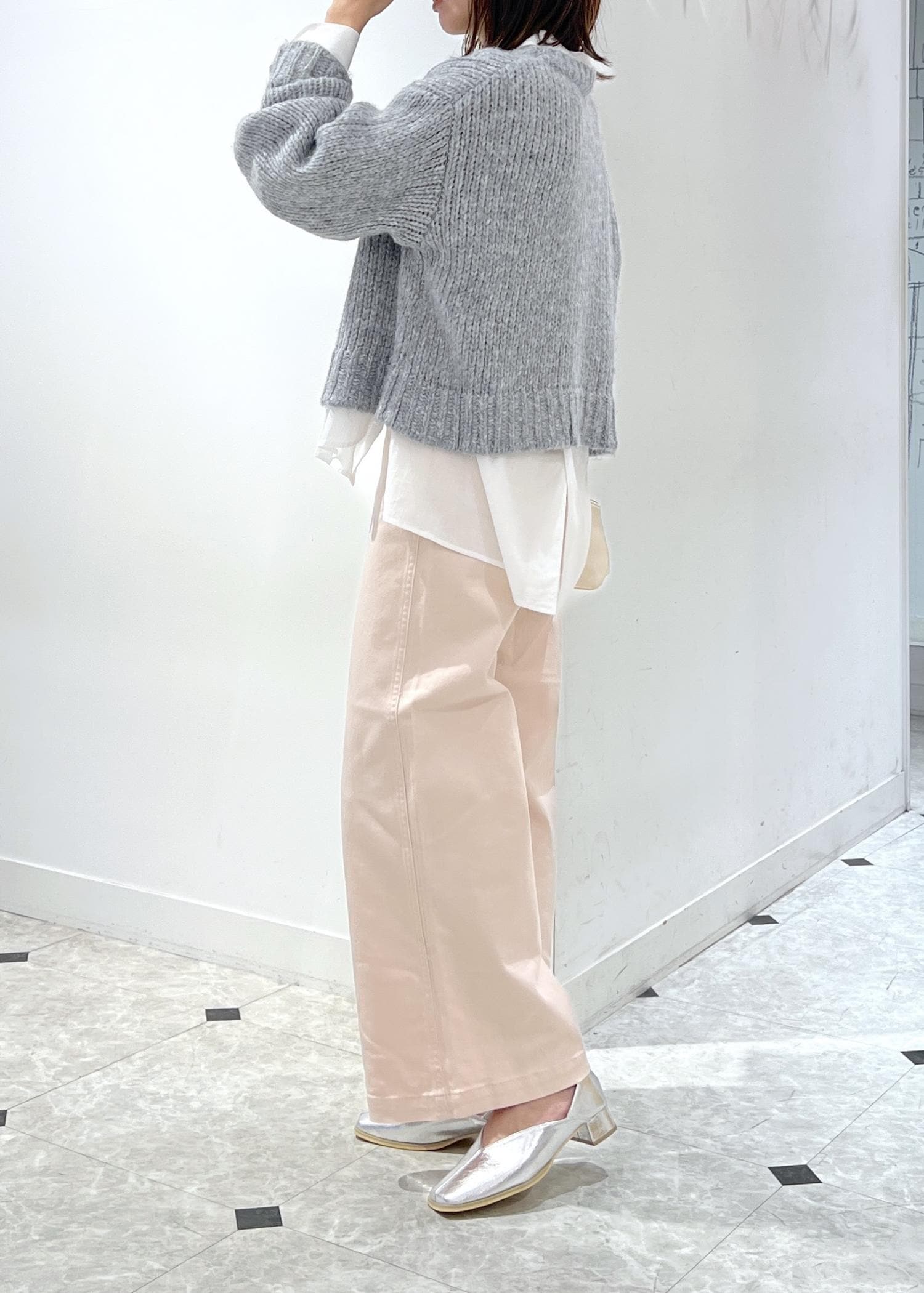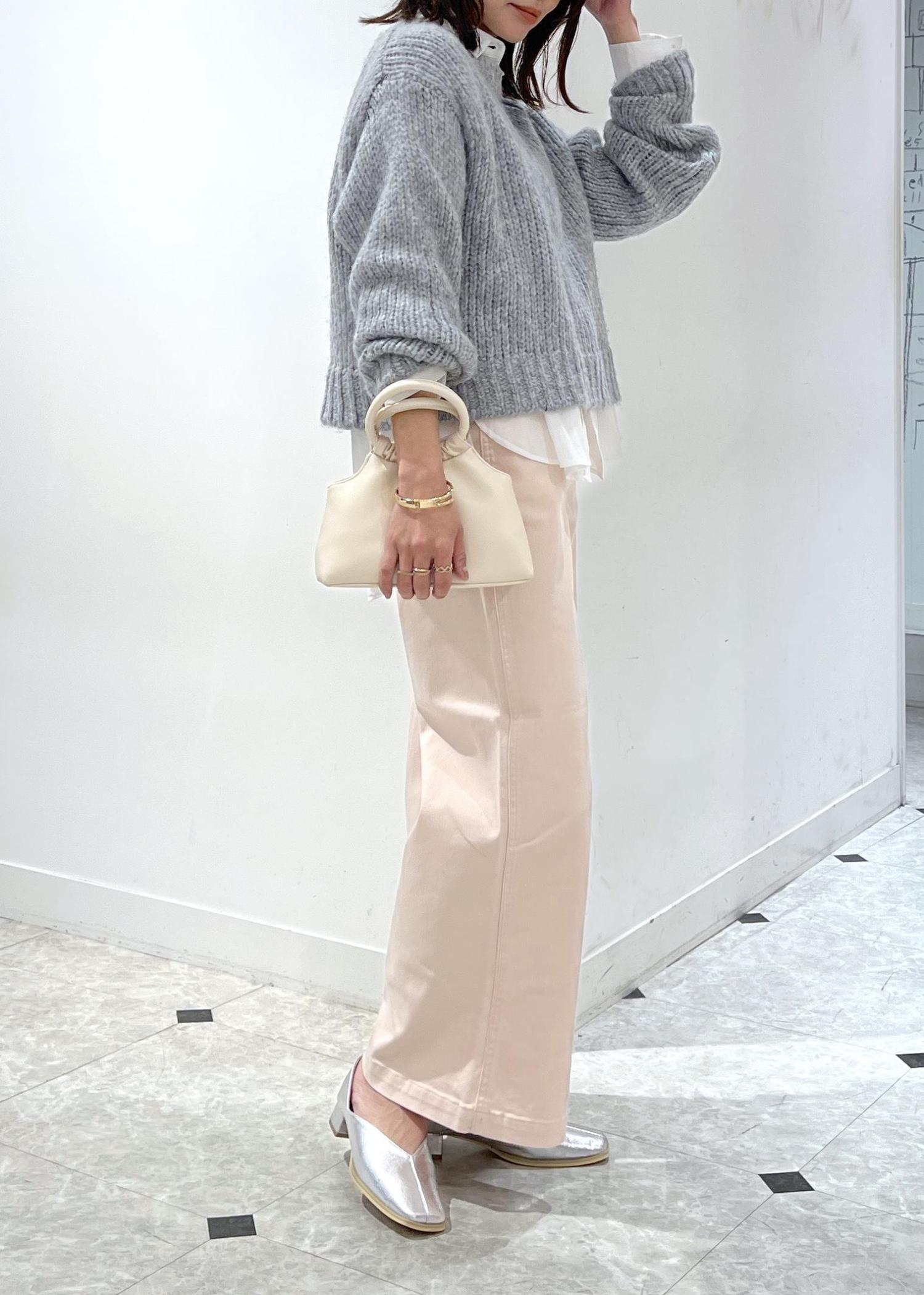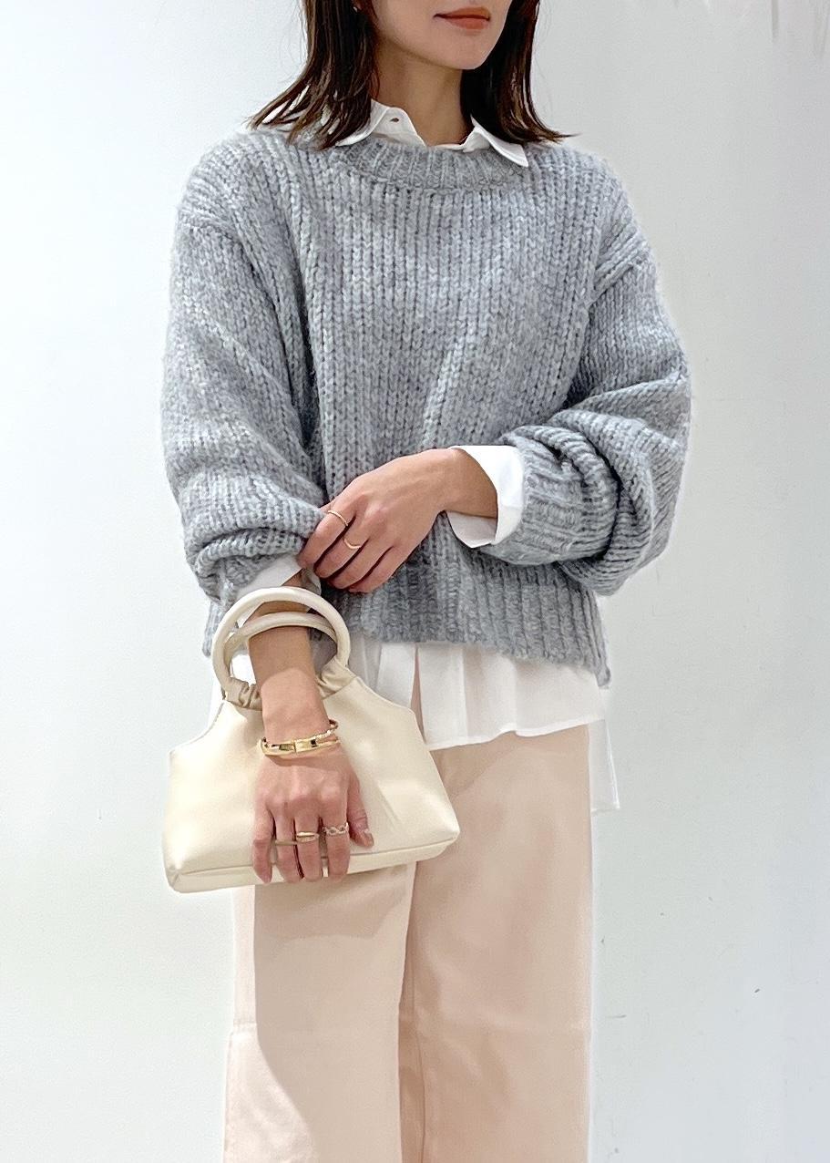 短めの丈感のグレーニットは、シャツをレイヤードして大人っぽさのあるカジュアルコーデに。