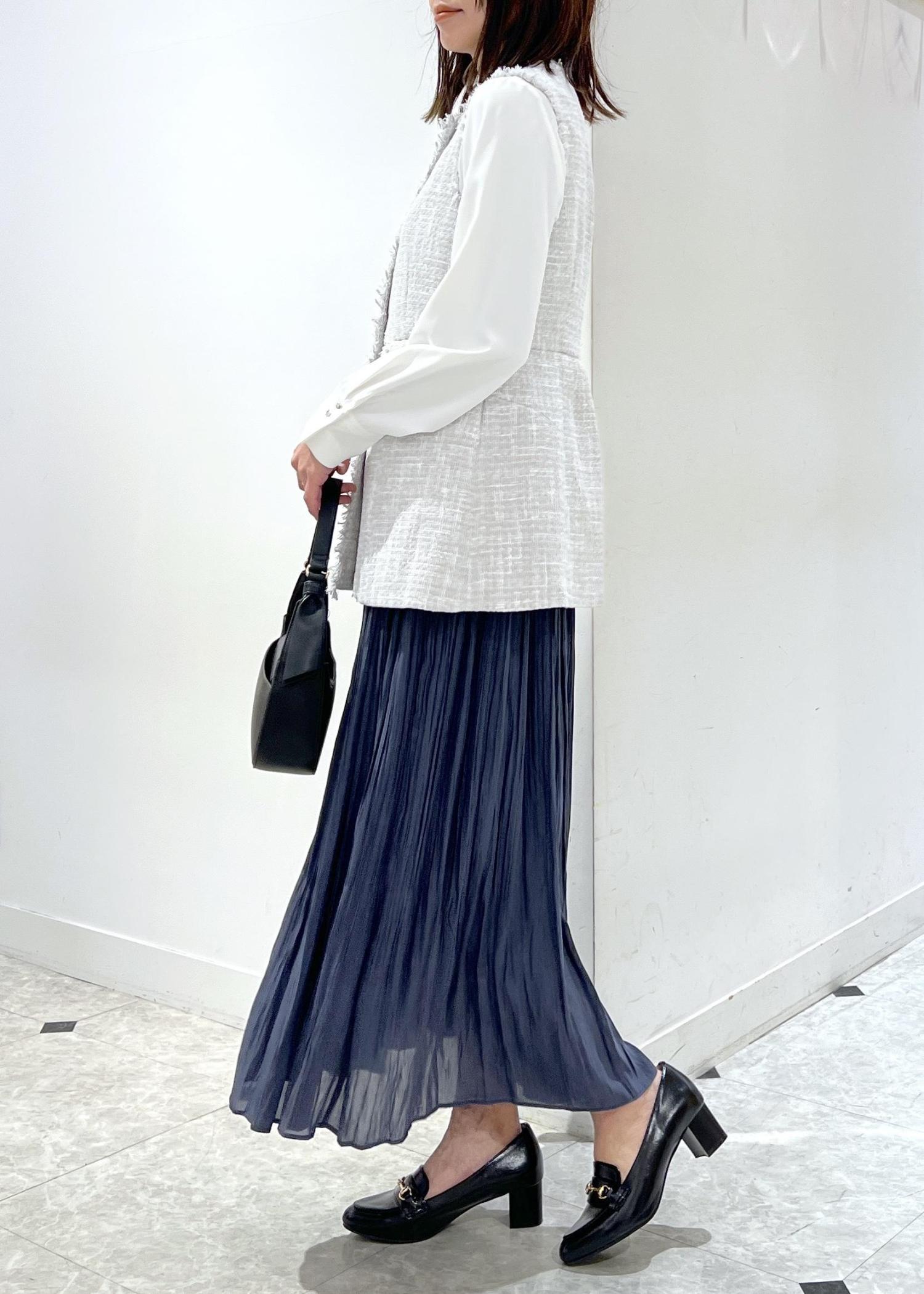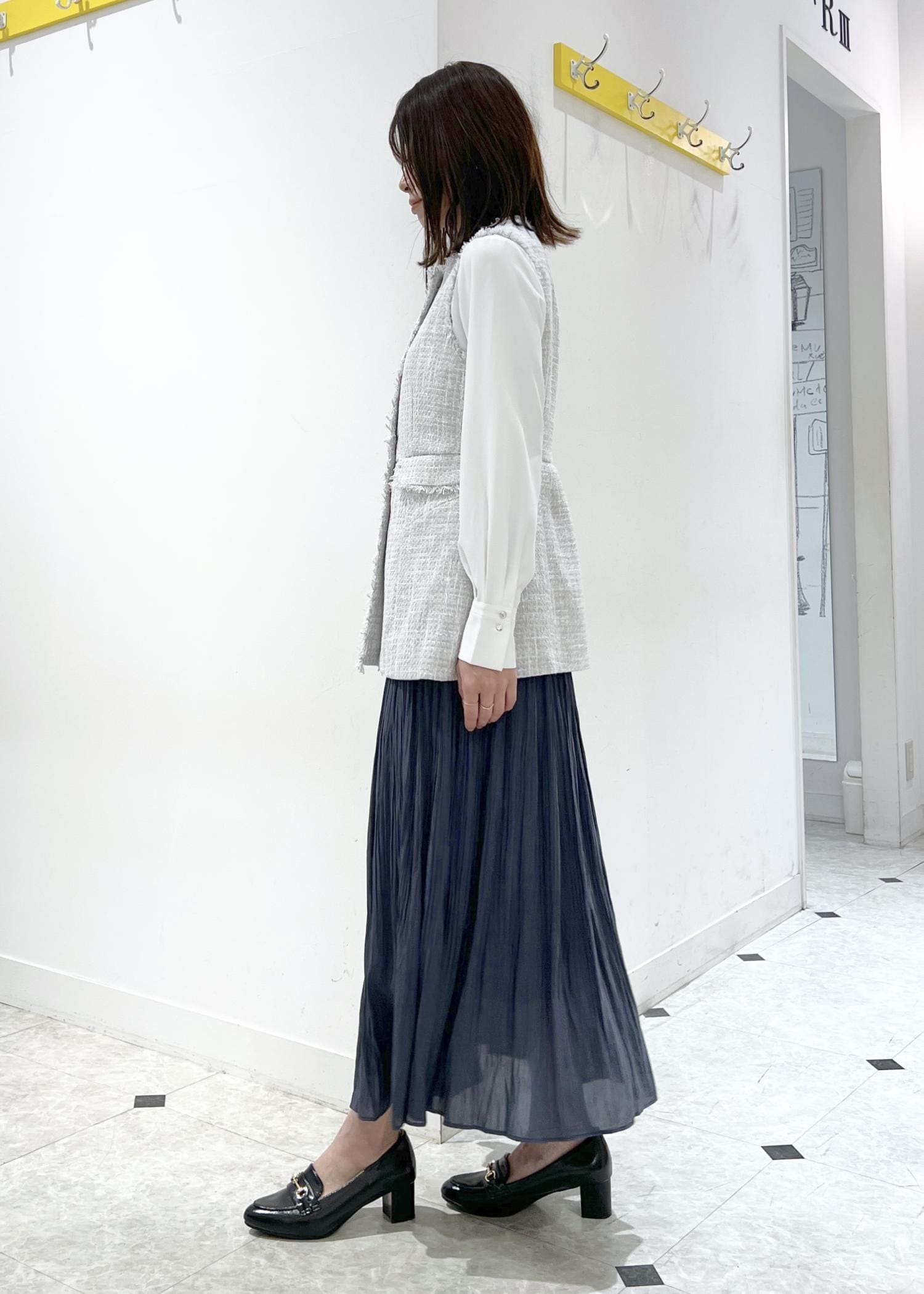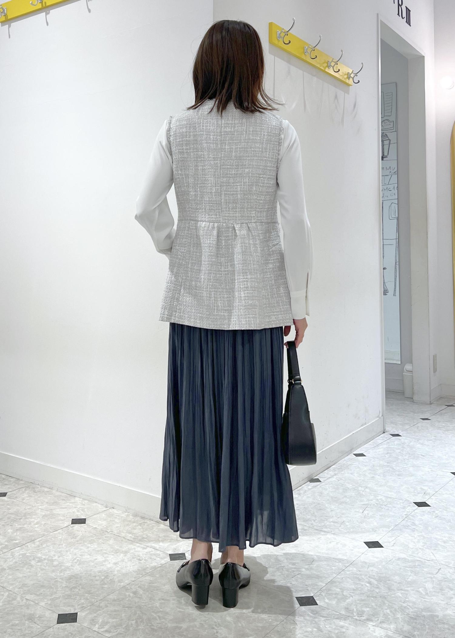 ぺプラム型に切り替えの入ったジレは、落ち感のあるロングスカートを合わせてセレモニーコーデに。