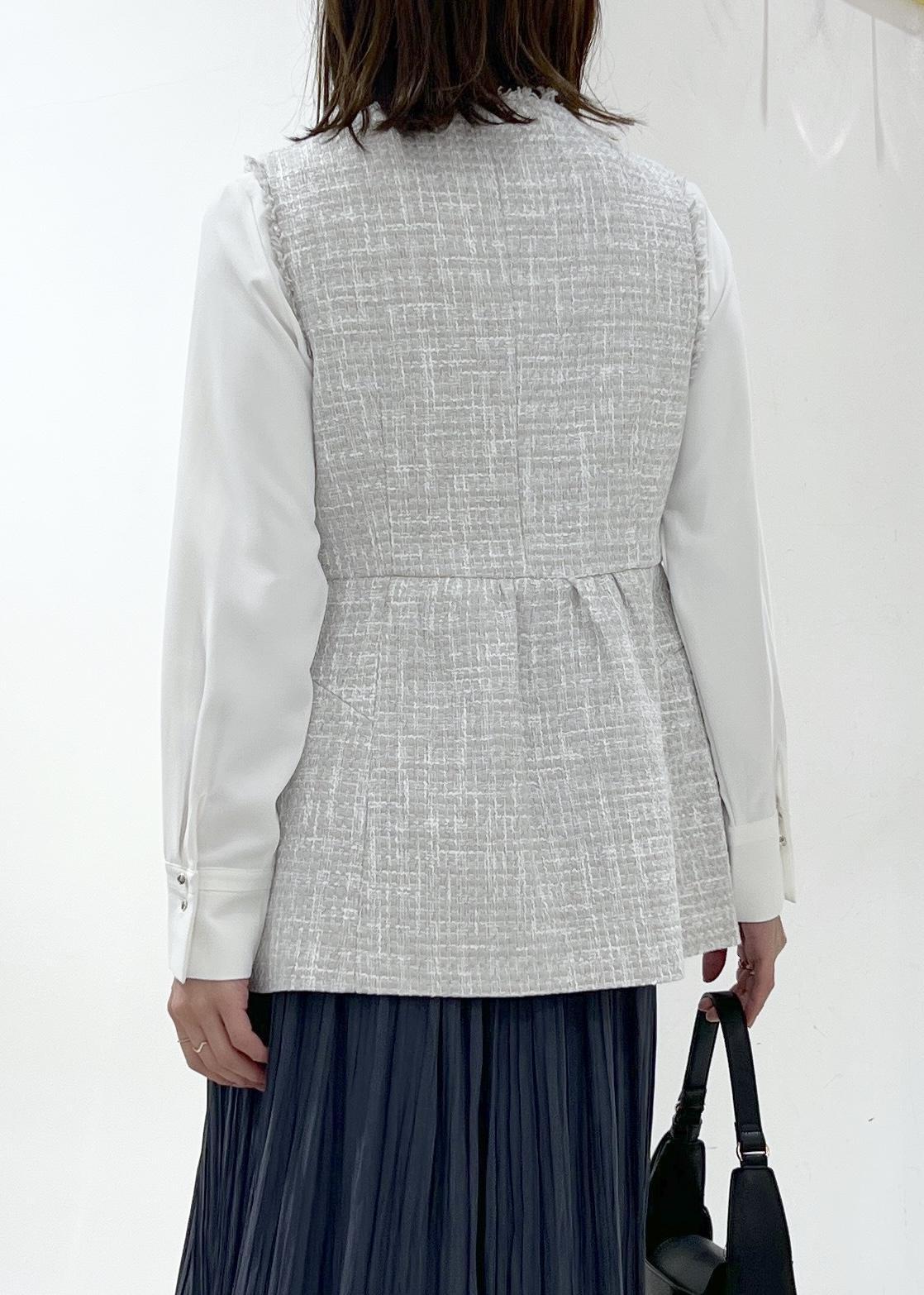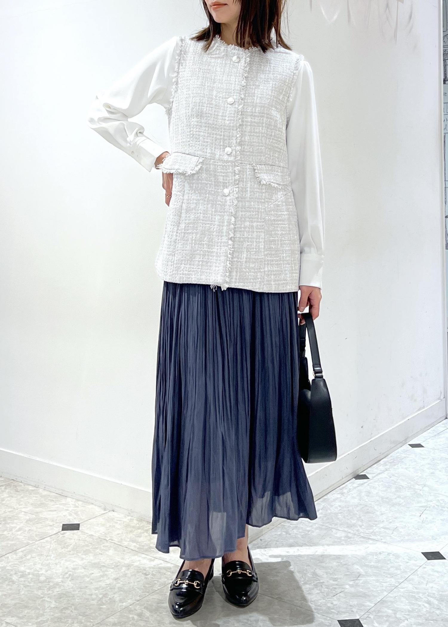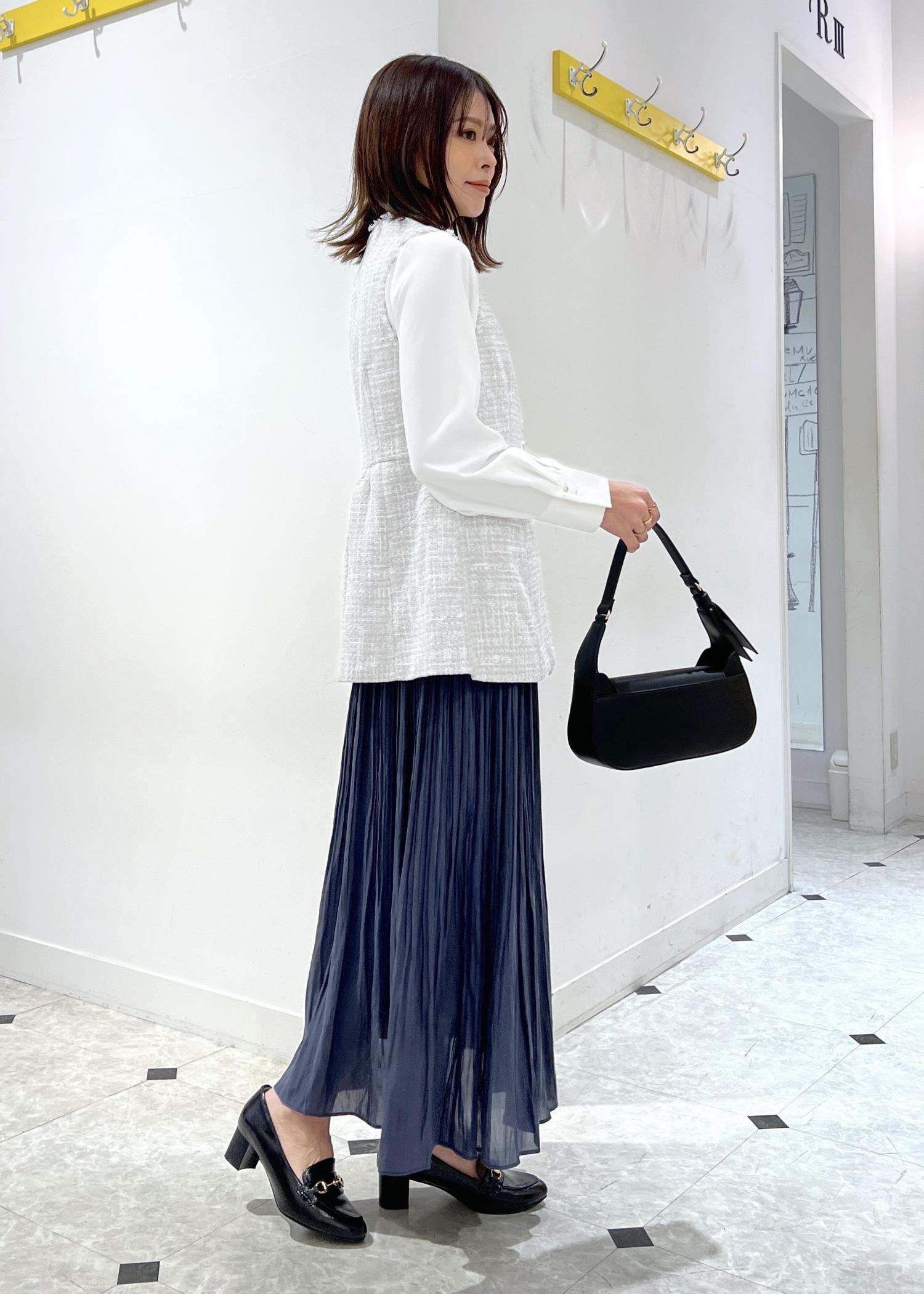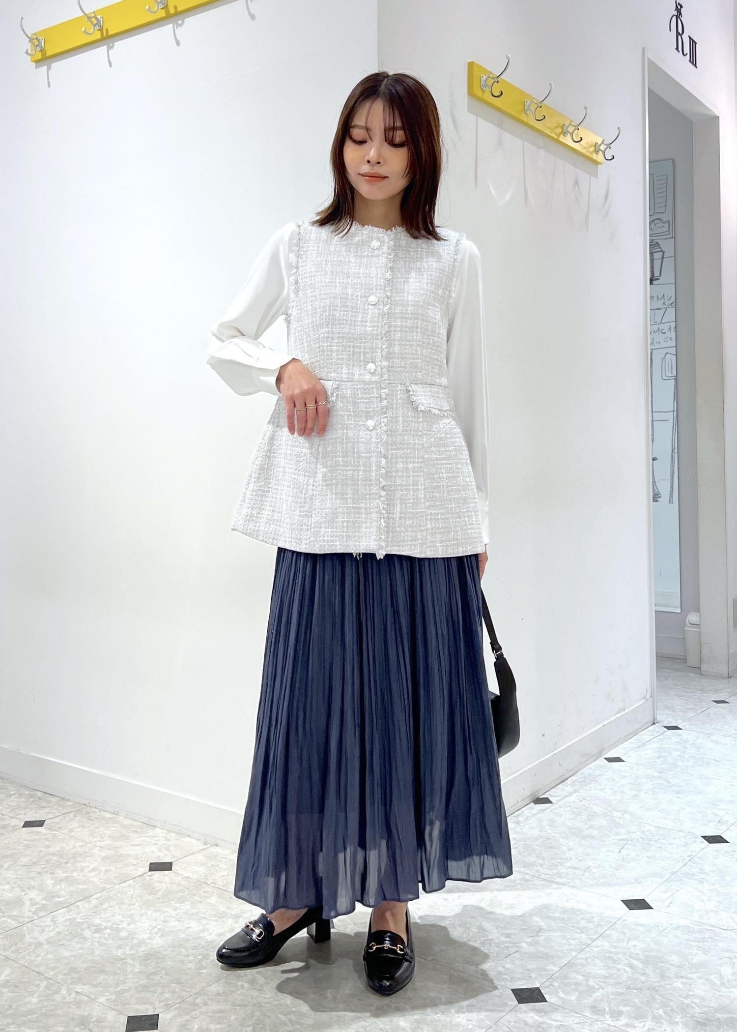 ぺプラム型に切り替えの入ったジレは、落ち感のあるロングスカートを合わせてセレモニーコーデに。