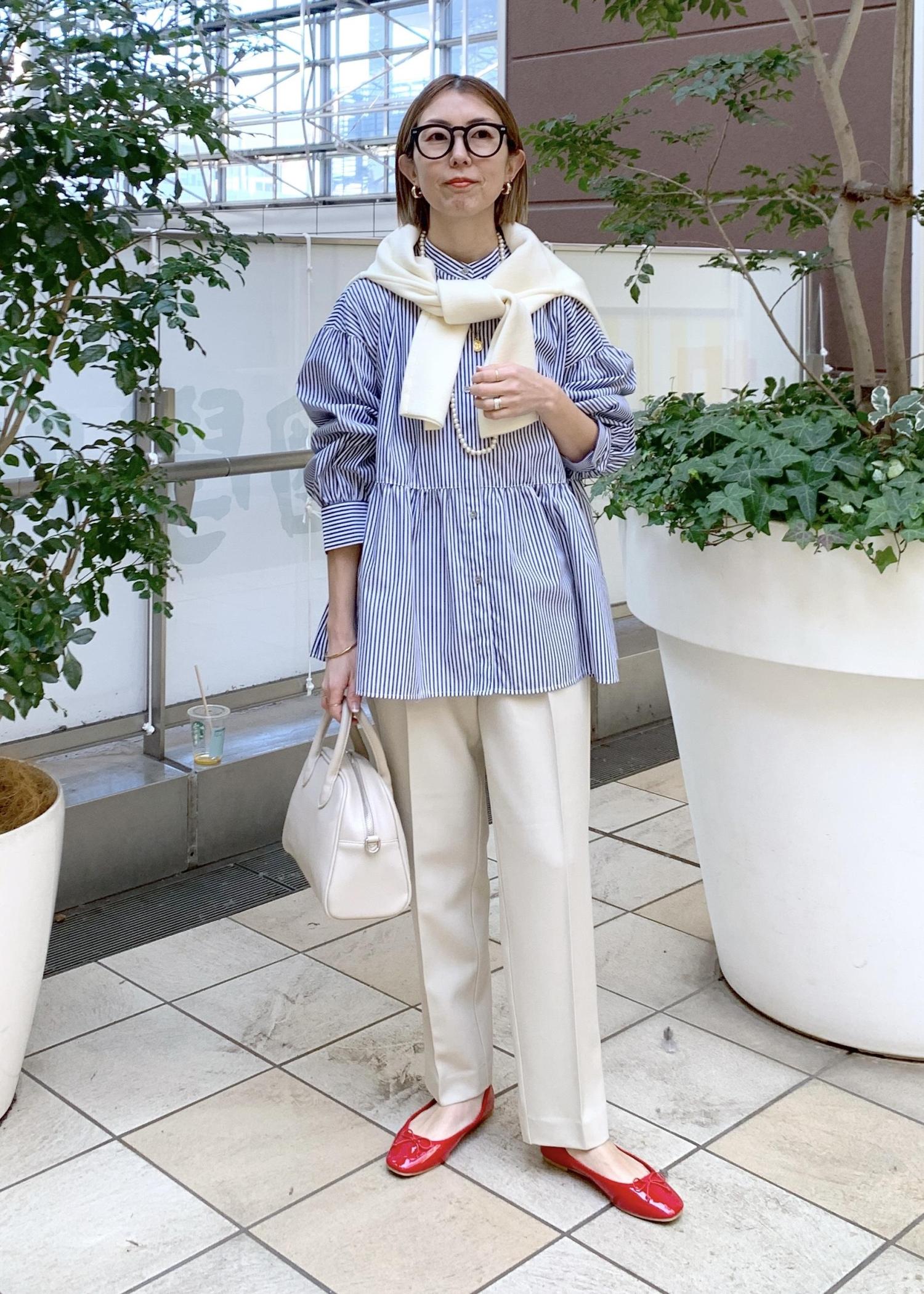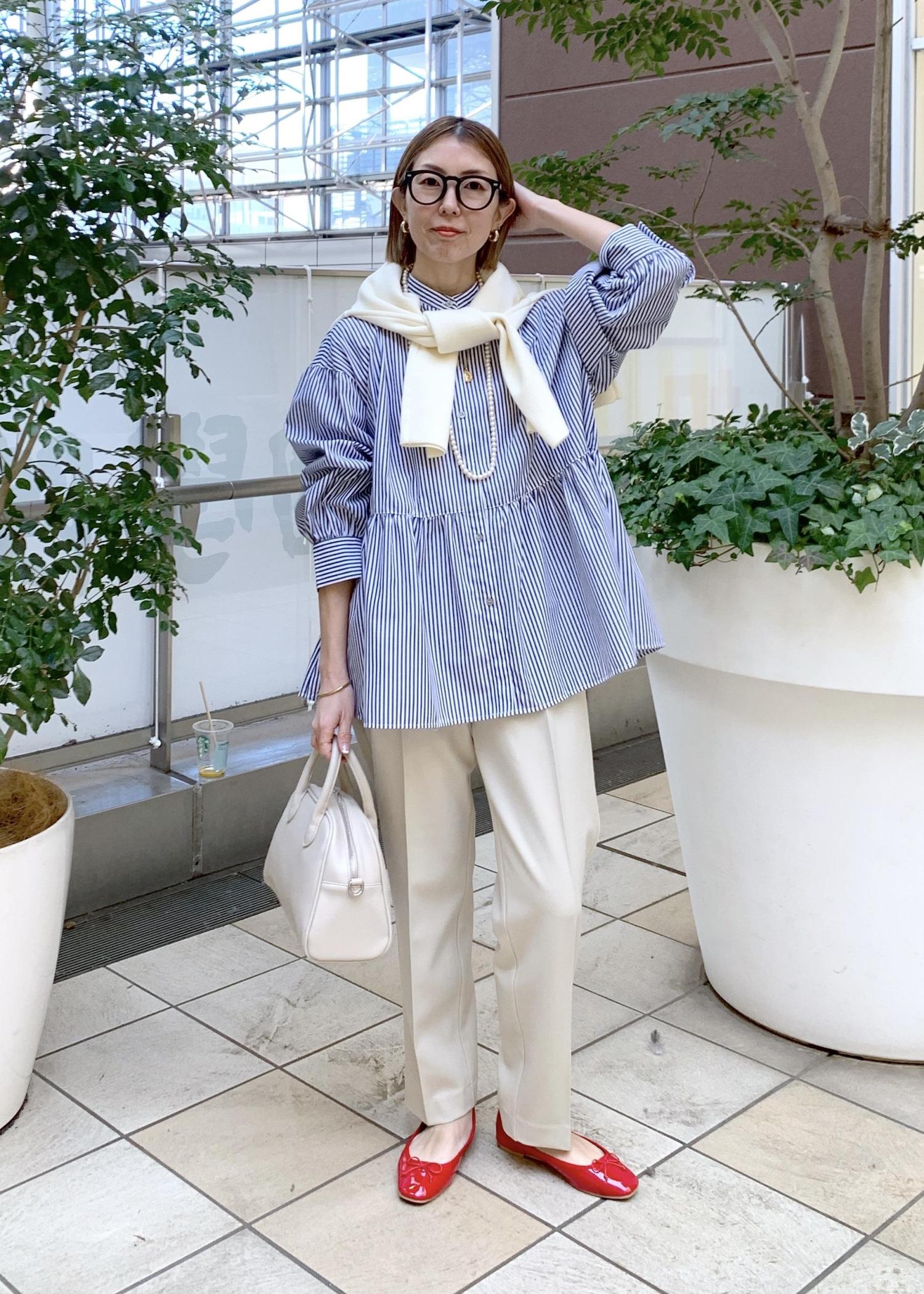 ウエスト周りがスッキリとしたシルエットで脚長効果があり、スタイルアップ見えで低身長さんにおすすめ。
