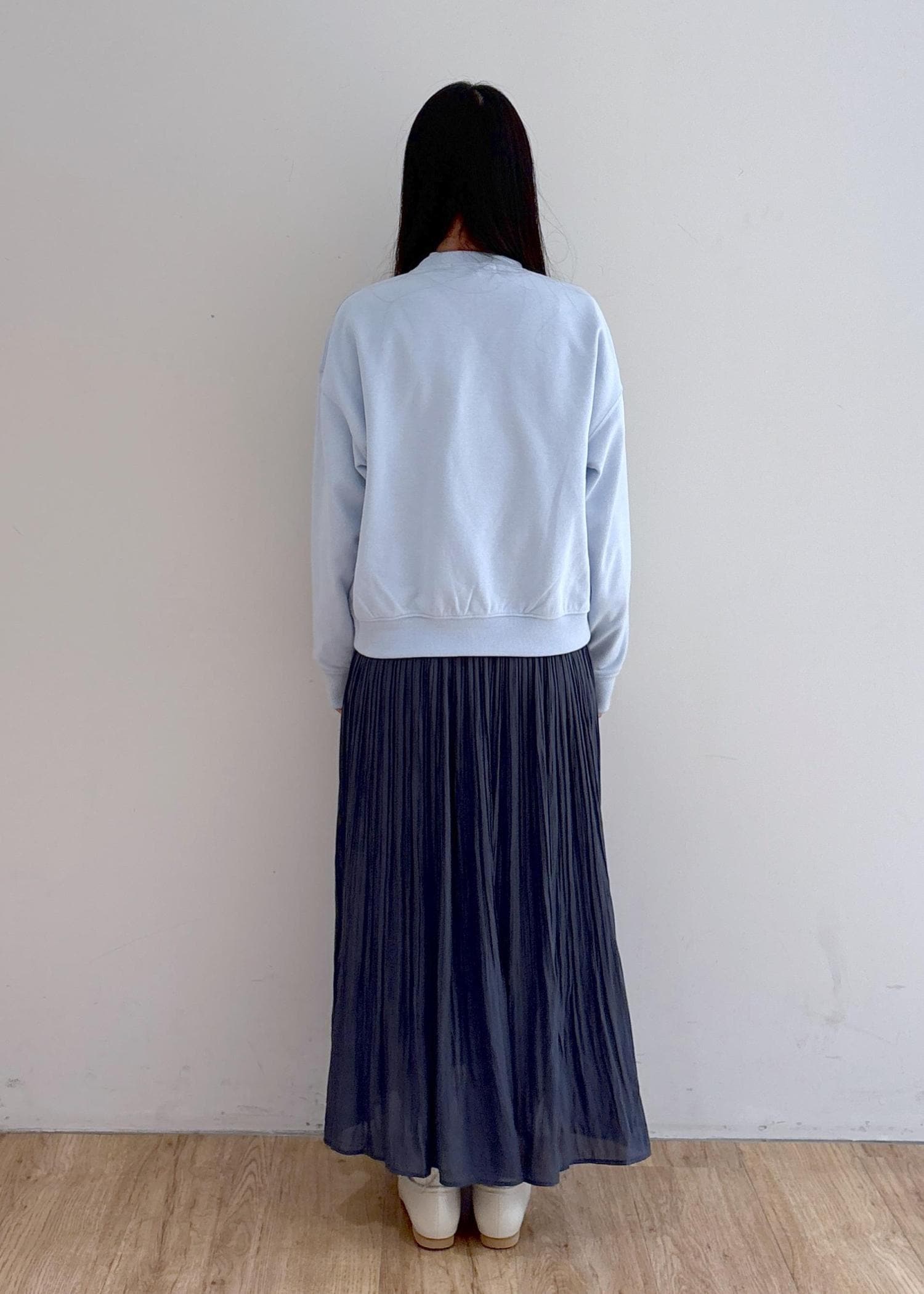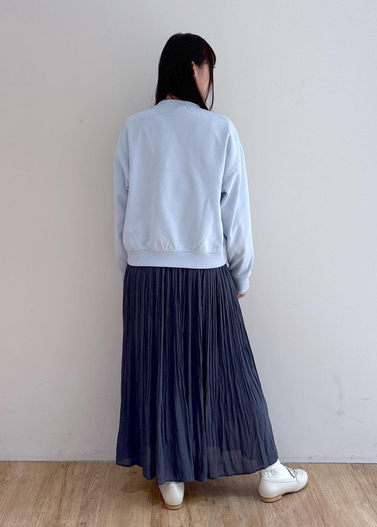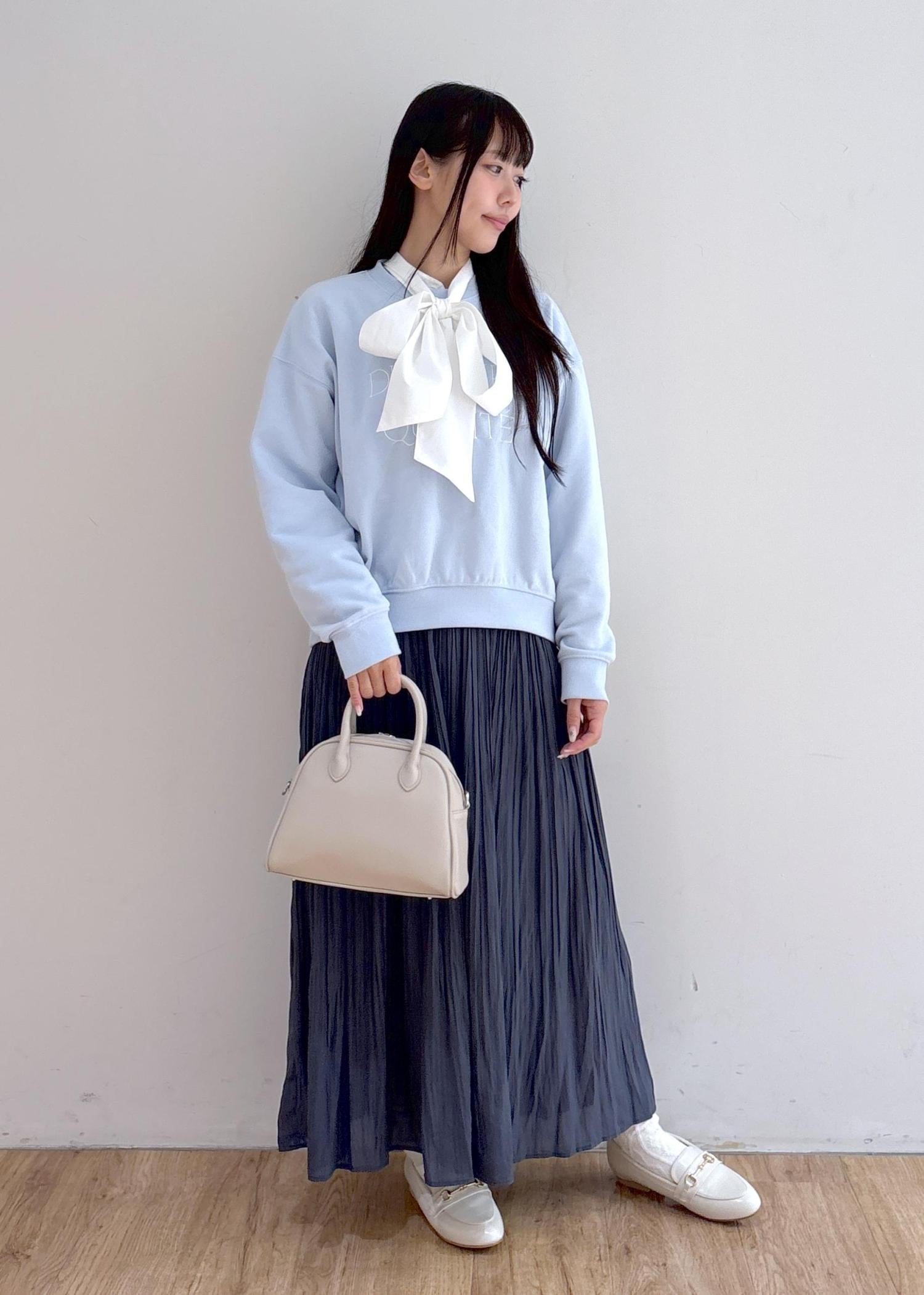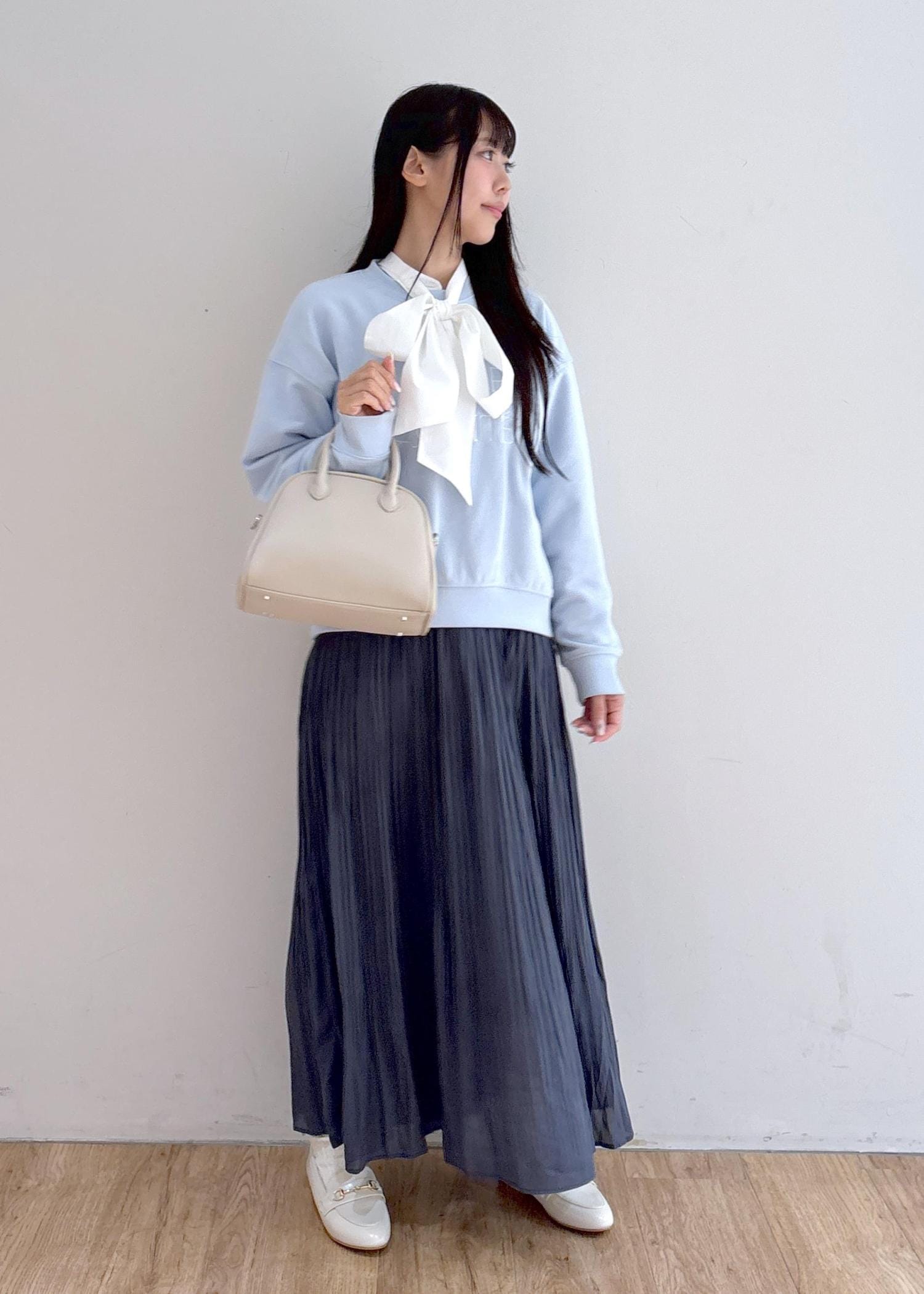 カジュアルなスウェットとフェミニンな楊柳プリーツスカートを合わせたミックスコーデです!