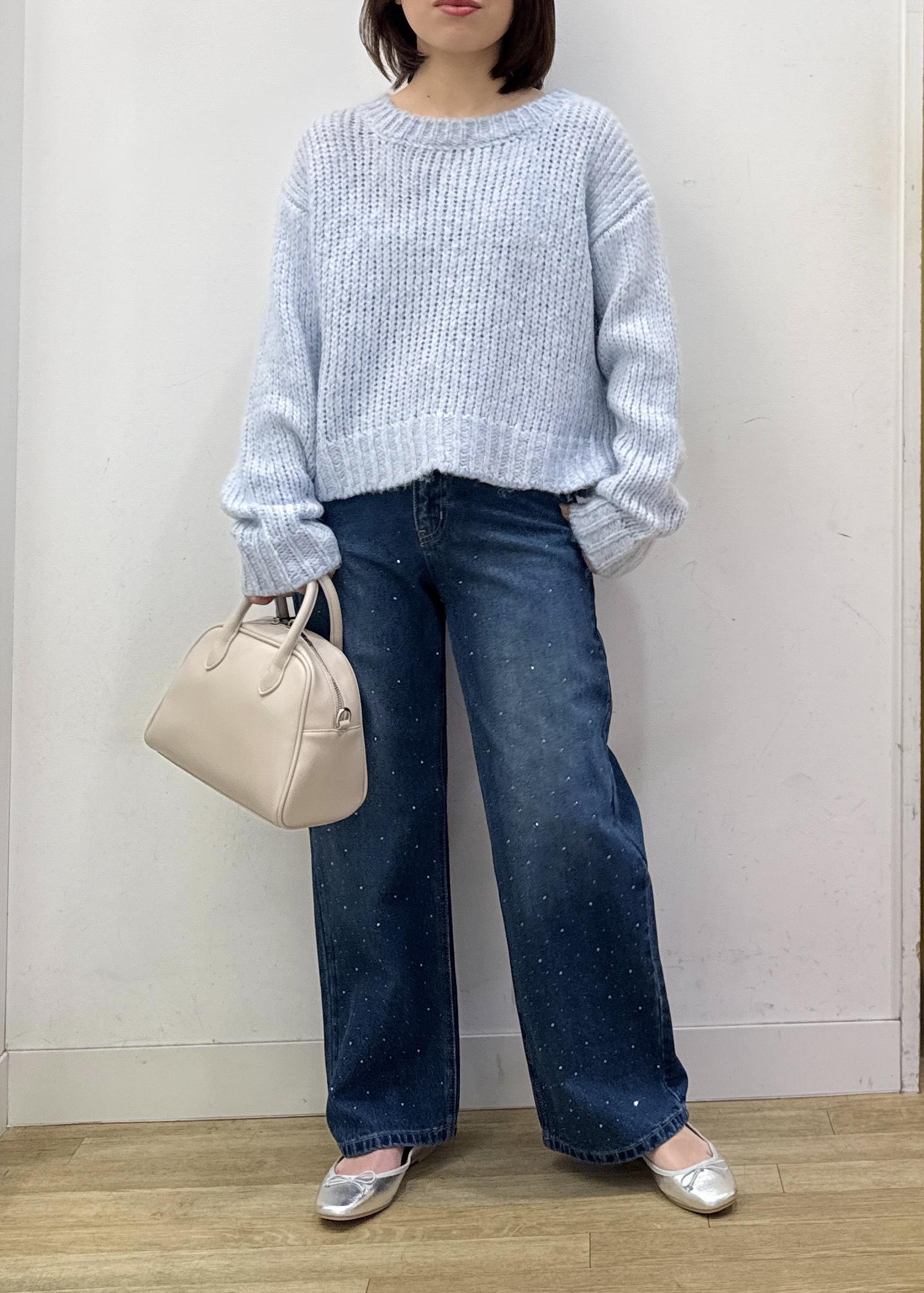 デニムと合わせたシンプルなコーディネートですが、デニムのビジューのキラキラがオシャレ感を出してくれるのでオススメです☺︎