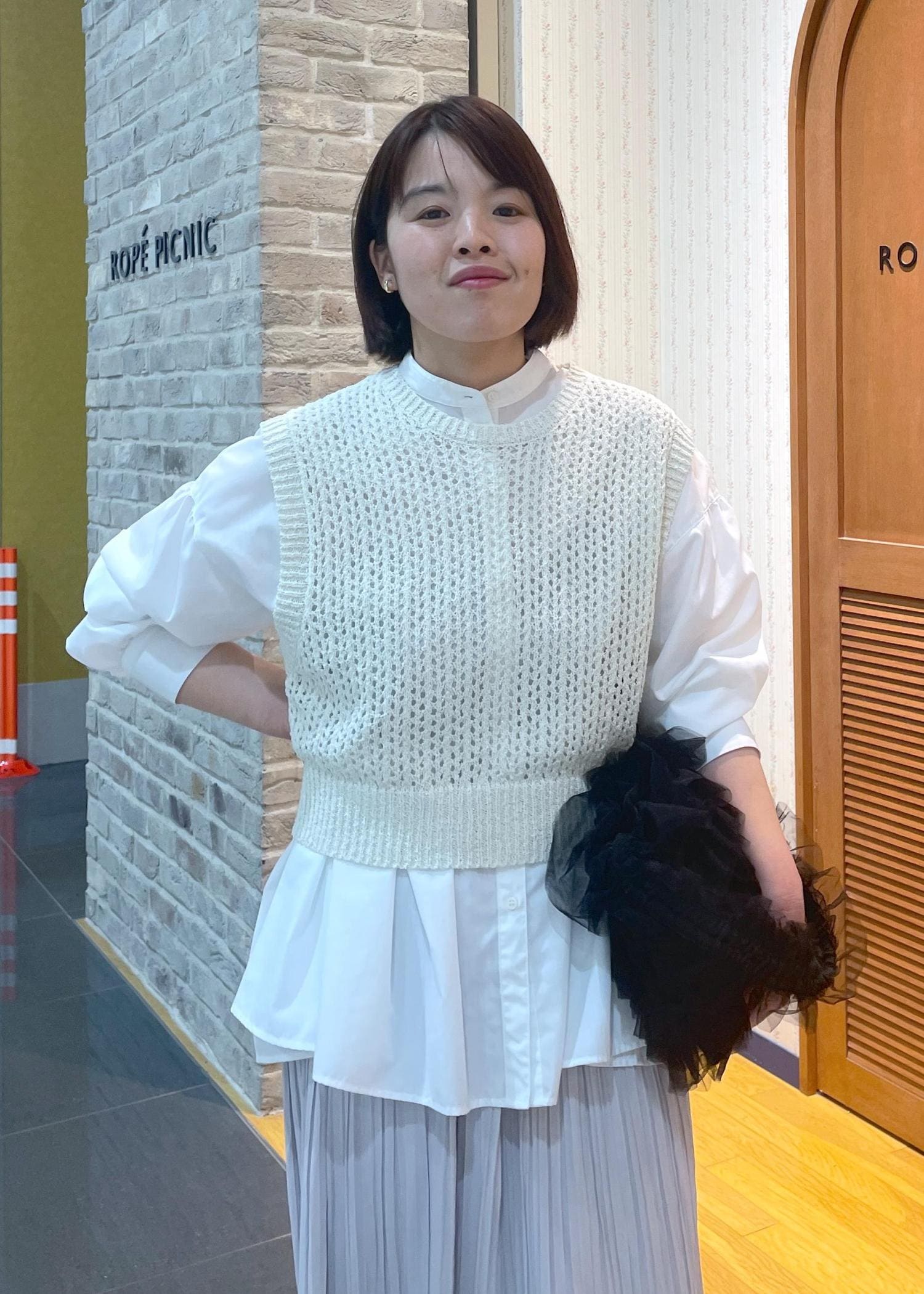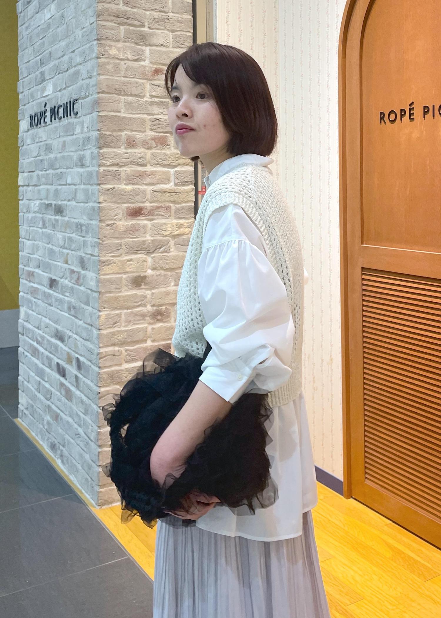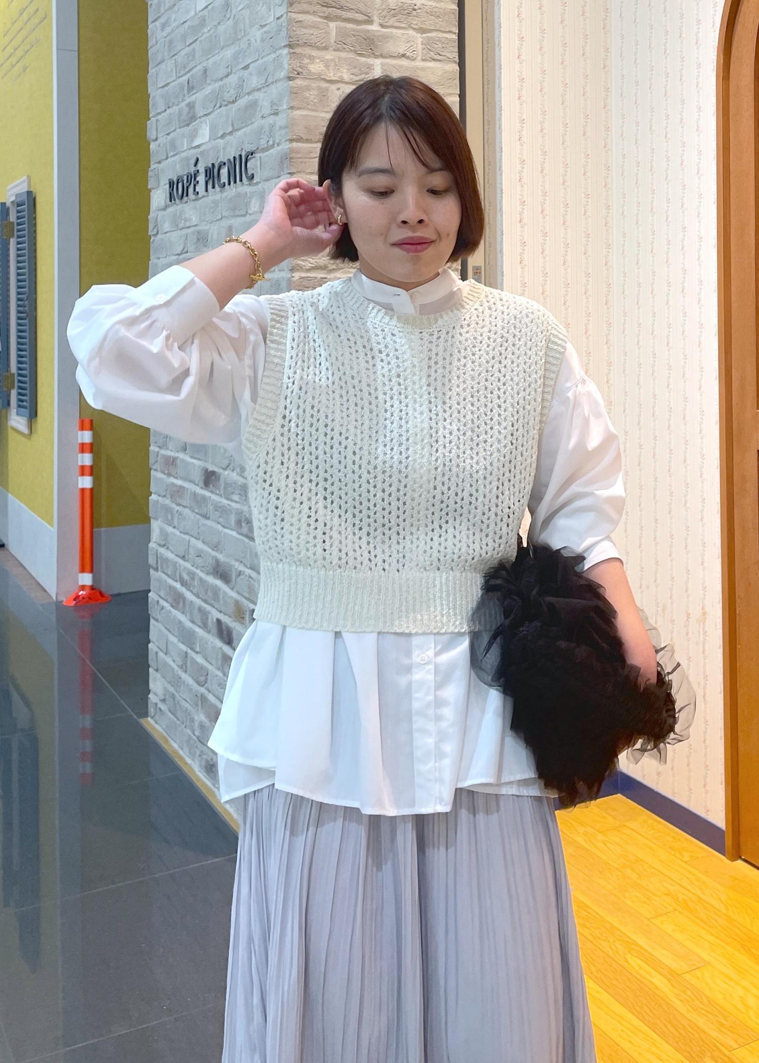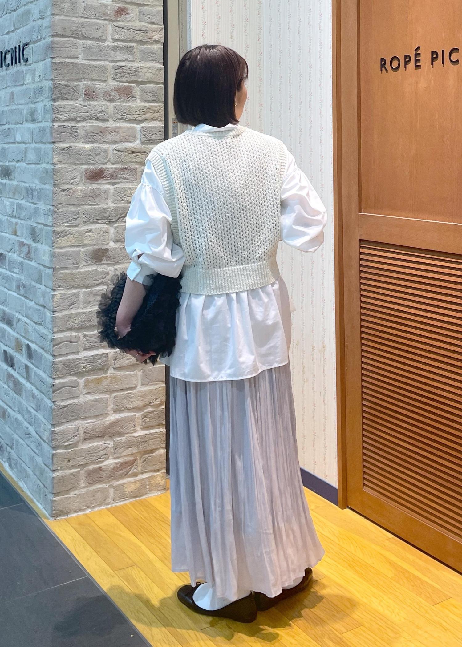 ゆるっとしたスタイルなので、シャツの上からニットベストを重ねてメリハリのあるスタイルに◎