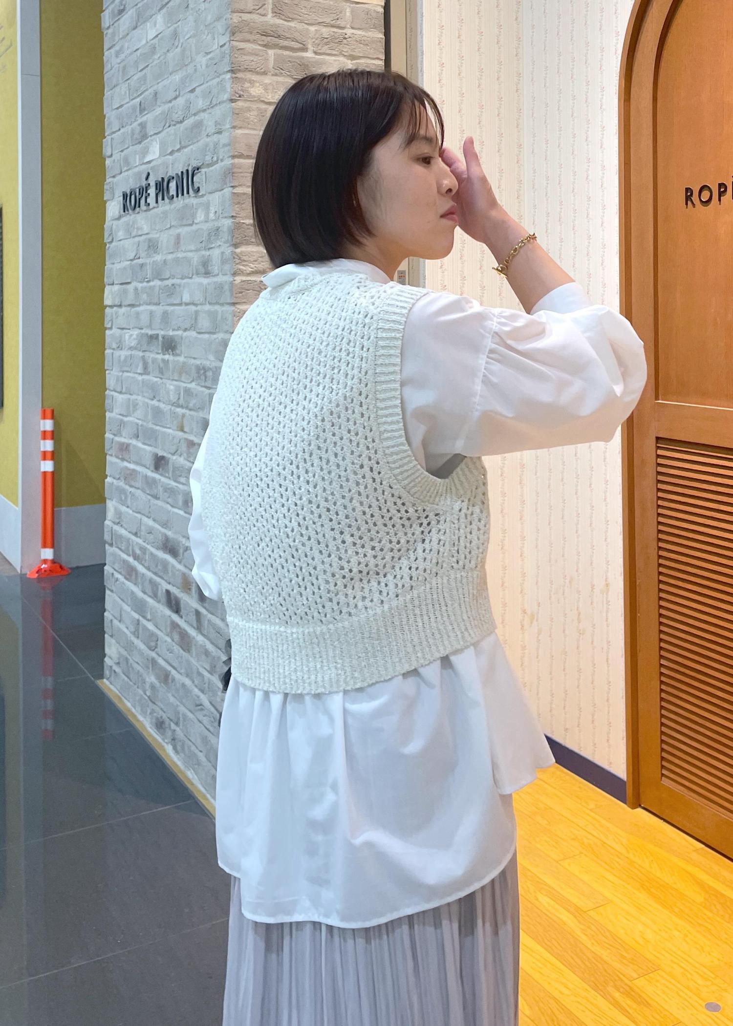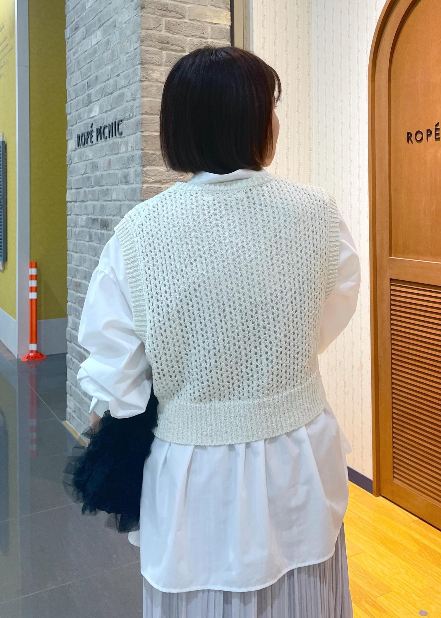 透かし編みが軽やかな印象のニットベストです。着丈はウエストくらいのコンパクトめな丈感なので、すっきりお召し頂けます。身頃は程良くゆとりがあり、裾はリブで少しきゅっとするのでメリハリが出ます。少しラメ感があり合わせるだけでお洒落見えを叶えてくれるアイテムです。