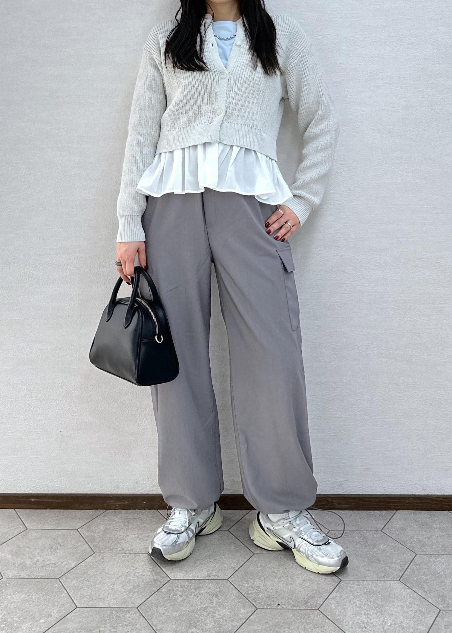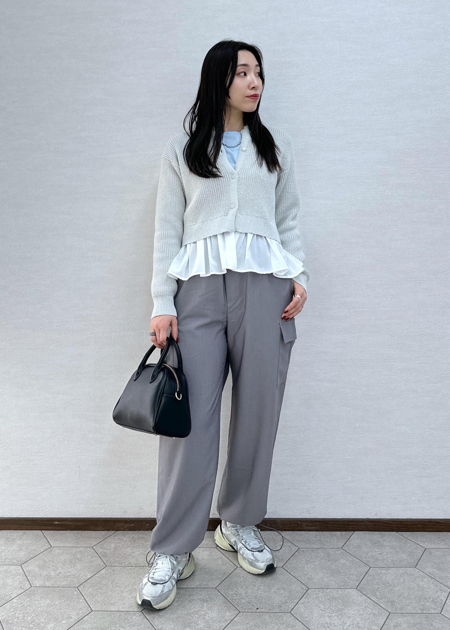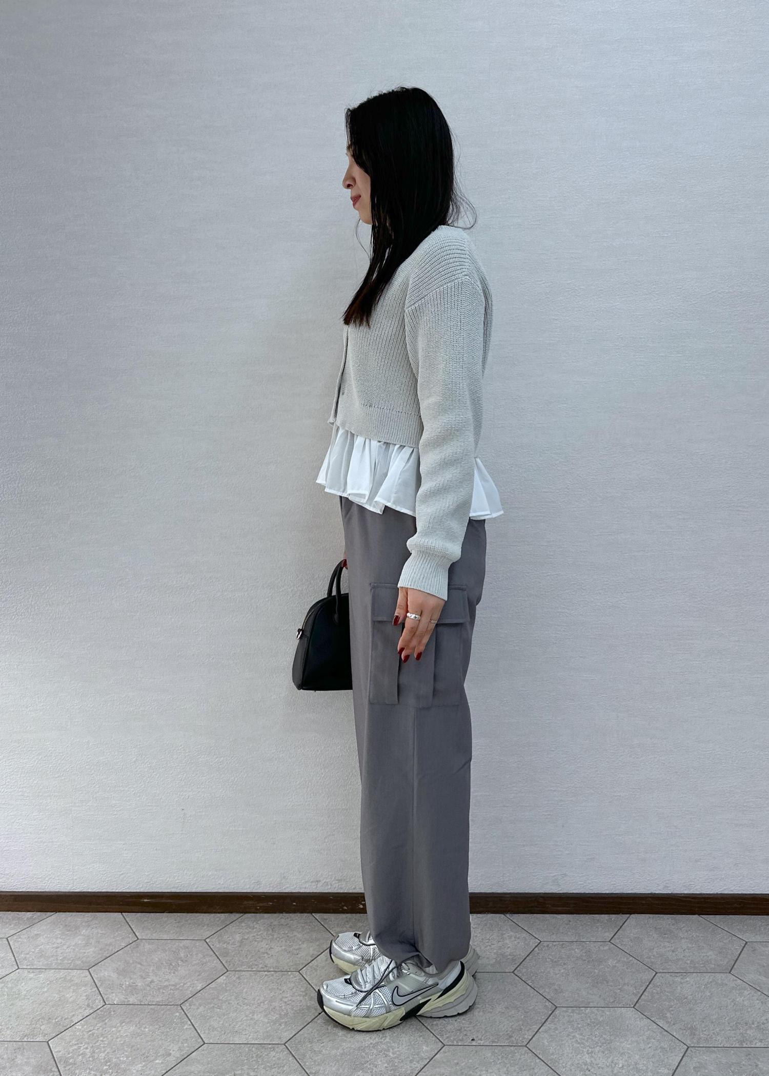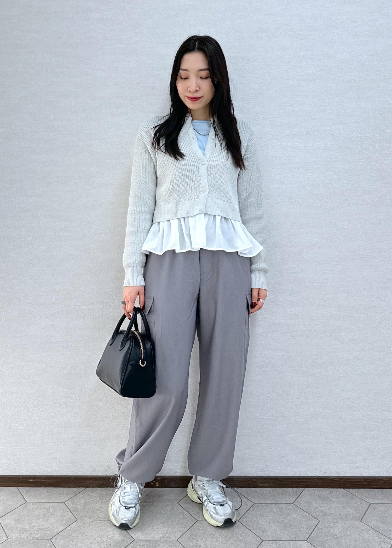 フリルのついたカーディガンで甘さをプラスし、カーゴパンツとスニーカーでカジュアルダウンしました。