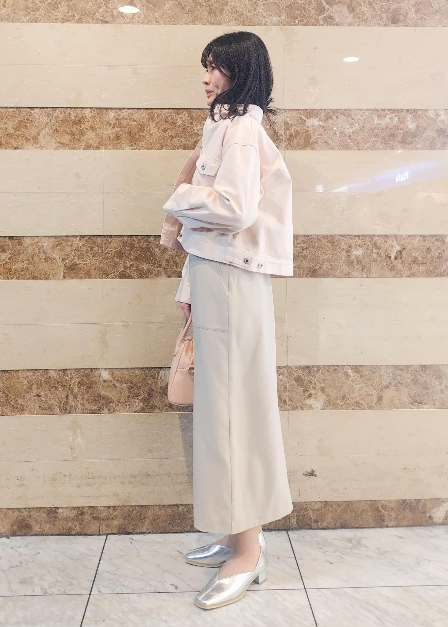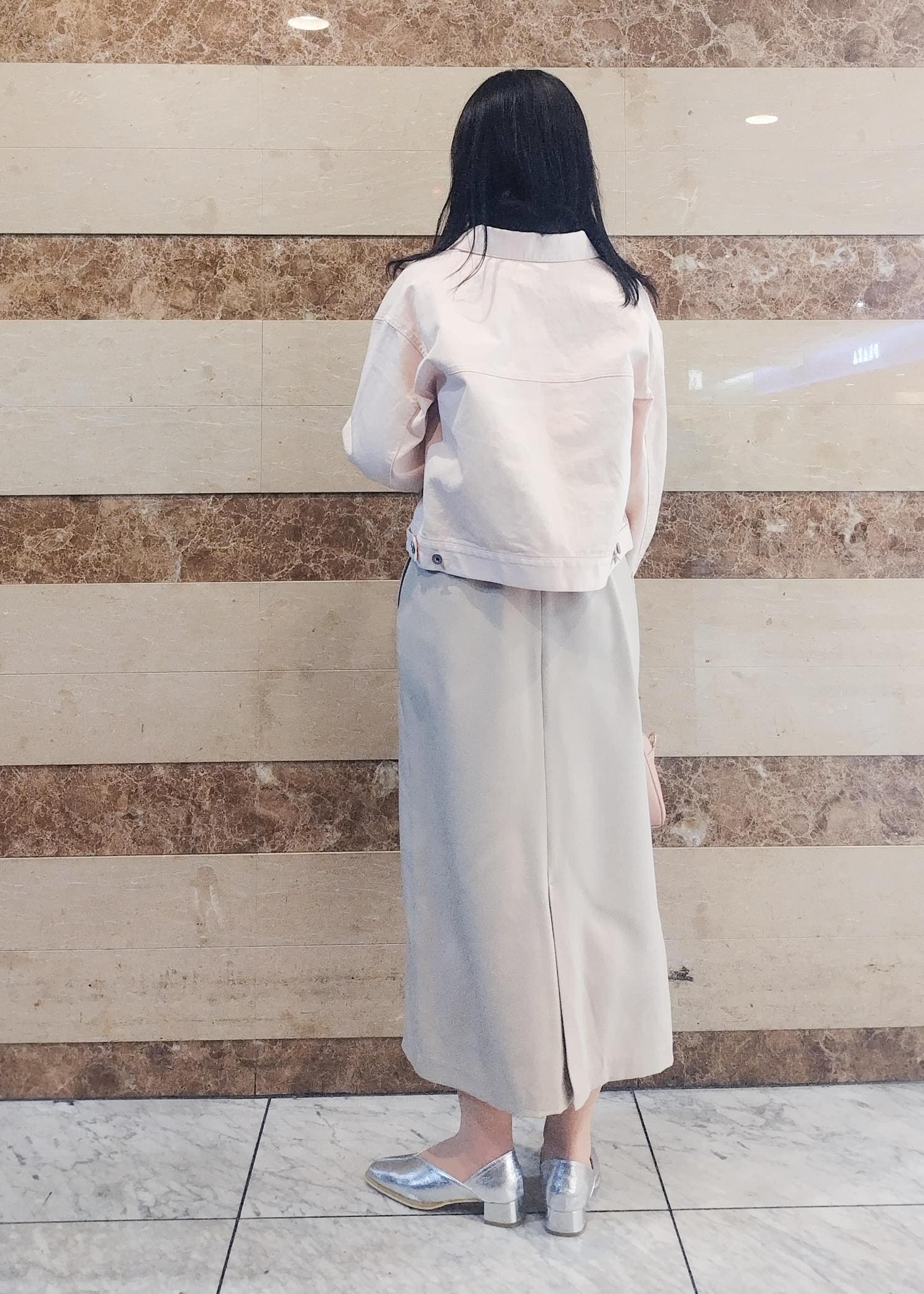 ピンクと言っても様々ですが、このデニムジャケットは薄いピンクなので主張しすぎず取り入れやすいカラーです。