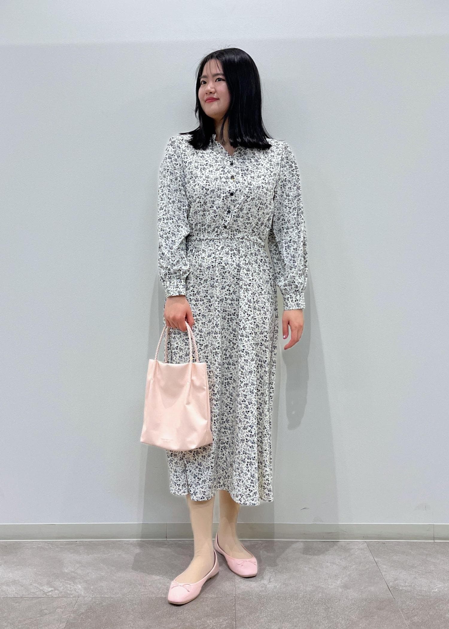 花柄ワンピースにピンクのバッグやシューズを合わせてフェミニンな春っぽいコーディネートにしました。