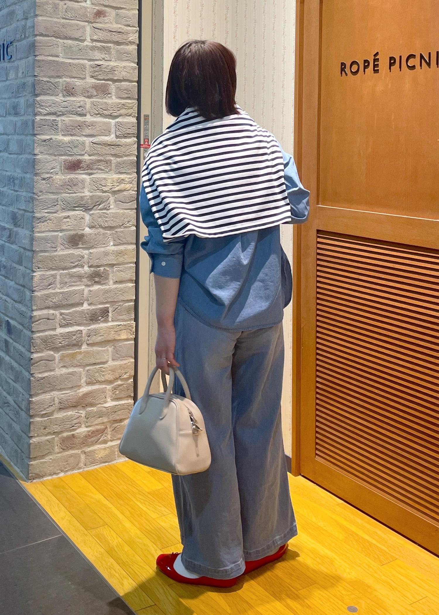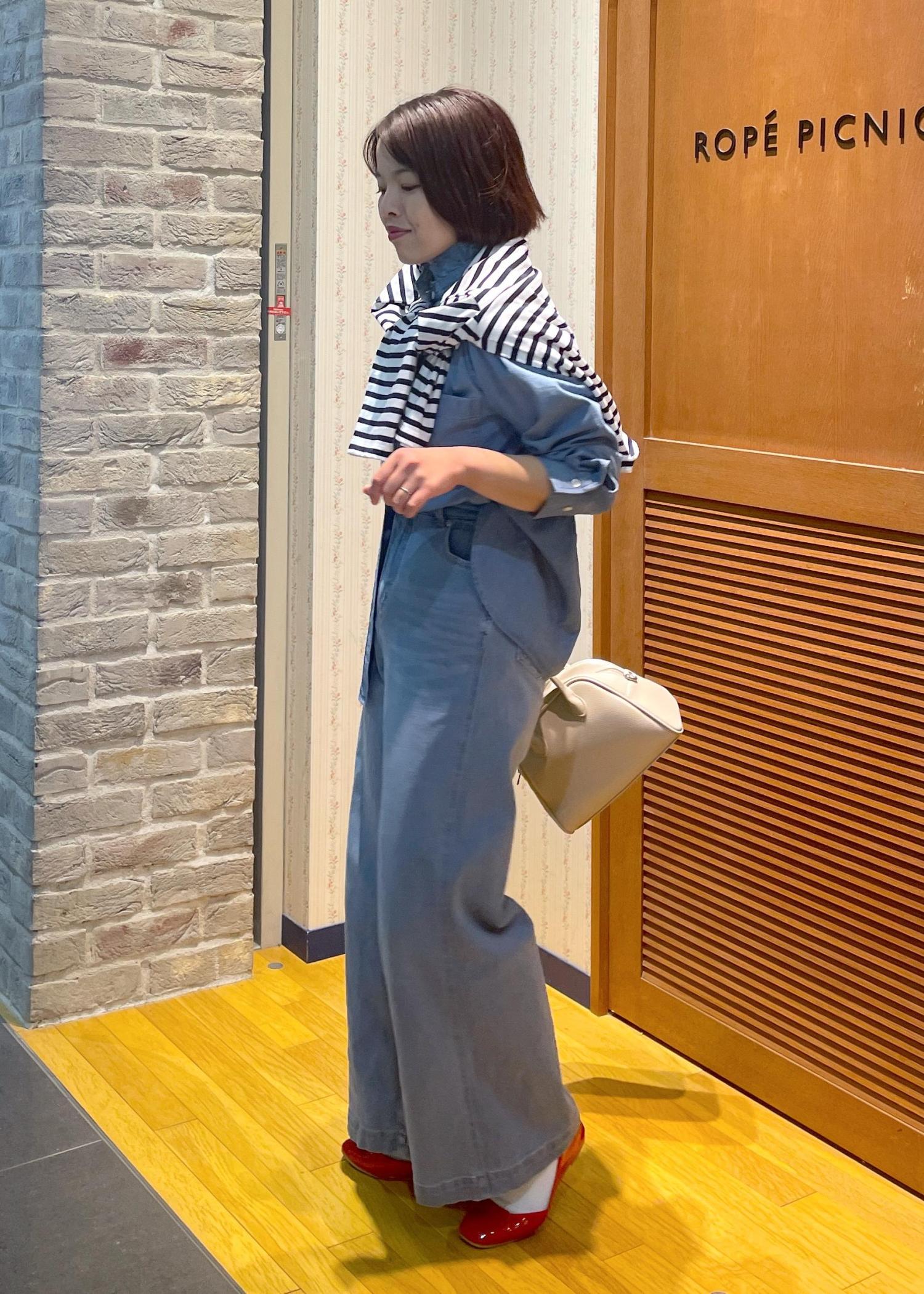 ROPÉ PICNIC【ウエスト革命デニム】ウエストシェイプデニムワイドパンツサックス / 38¥4,543レビューデニム特有の硬さがあまり無く、柔らかな生地感です。ハイウエストのデニムで、ウエストは薄手のカットソーやブラウスをインできるくらいの余裕がありました。着丈は159cmでフラットシューズでギリギリ擦らない長さです。