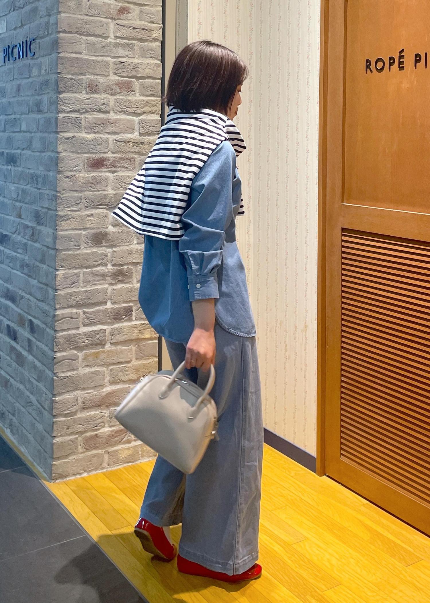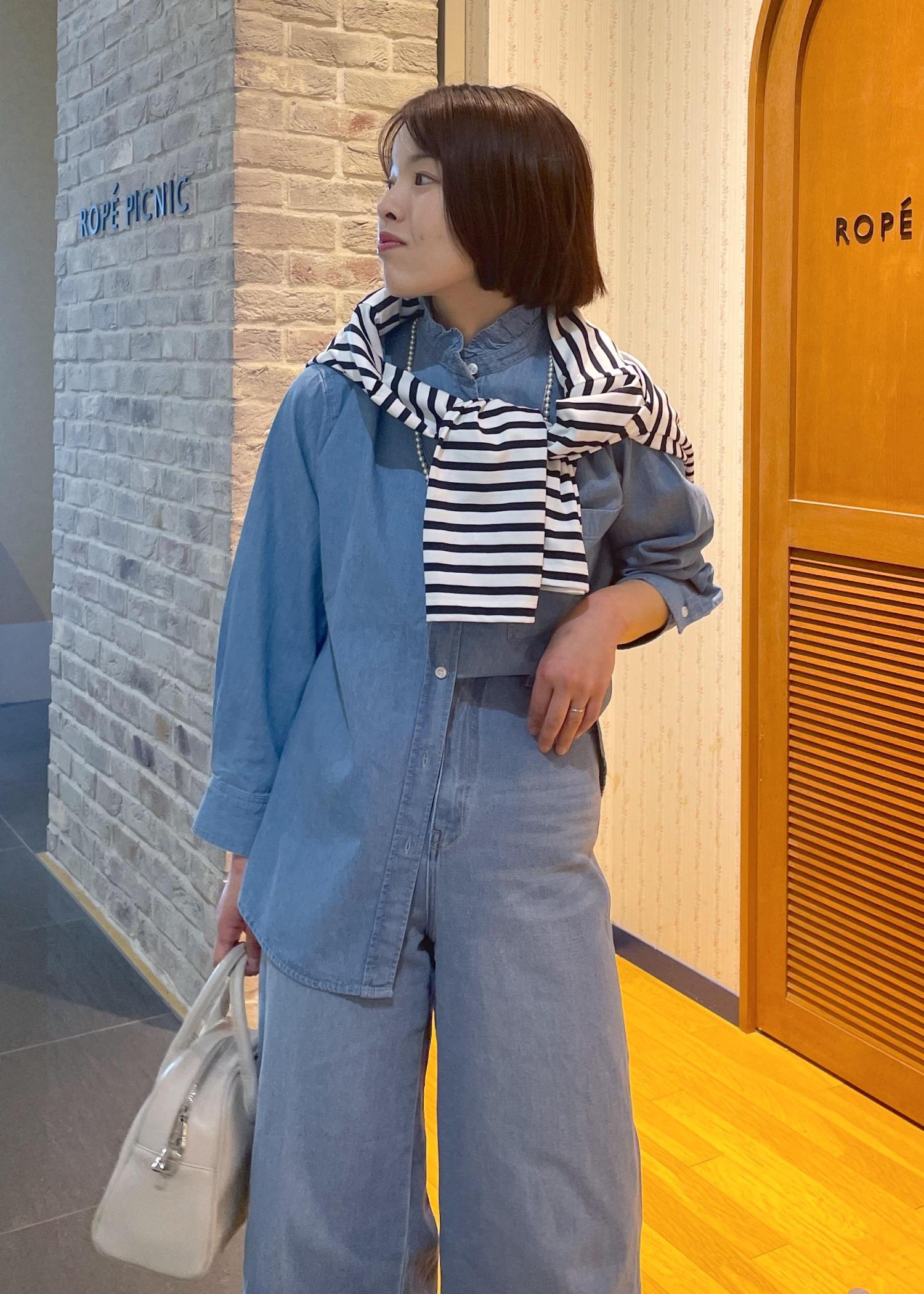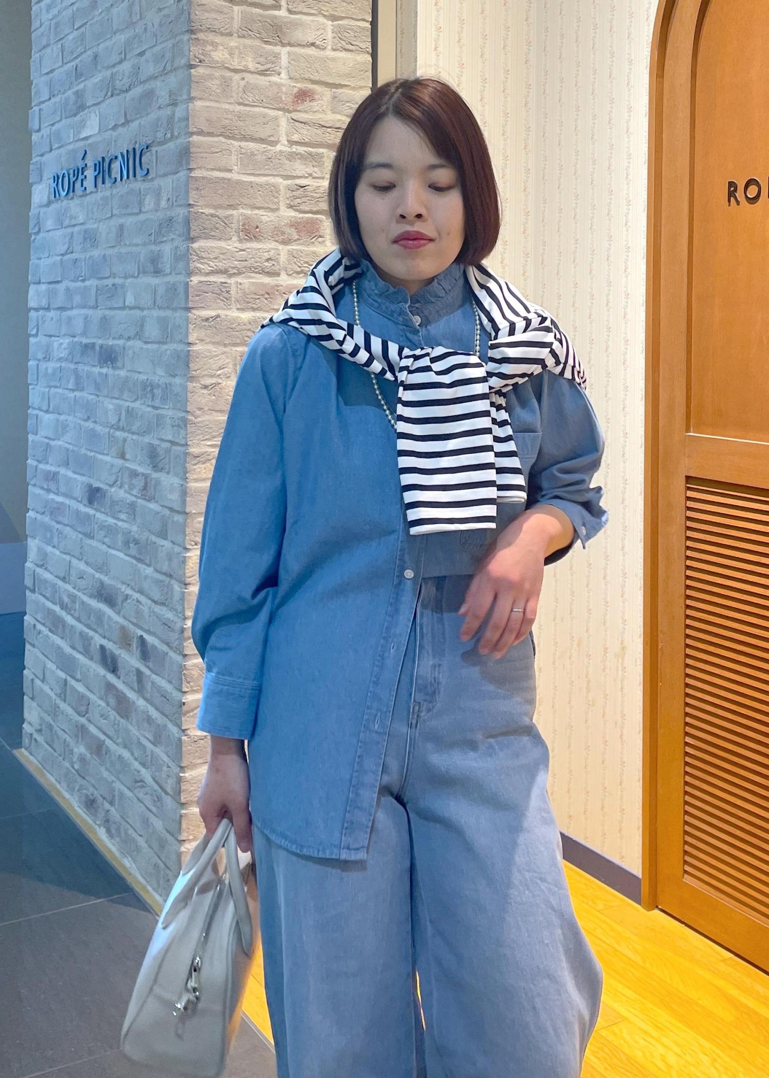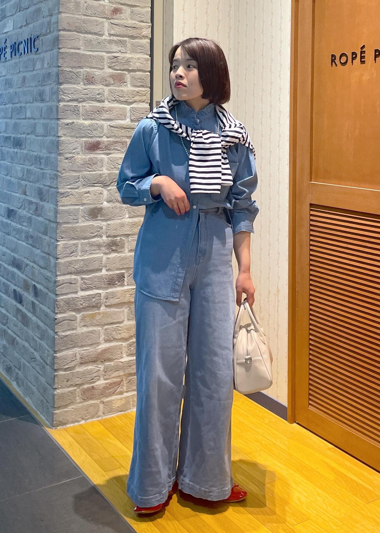 フリルカラーが女性らしいデニムシャツに、同色系のワイドデニムを合わせてセットアップ風のスタイルに◎