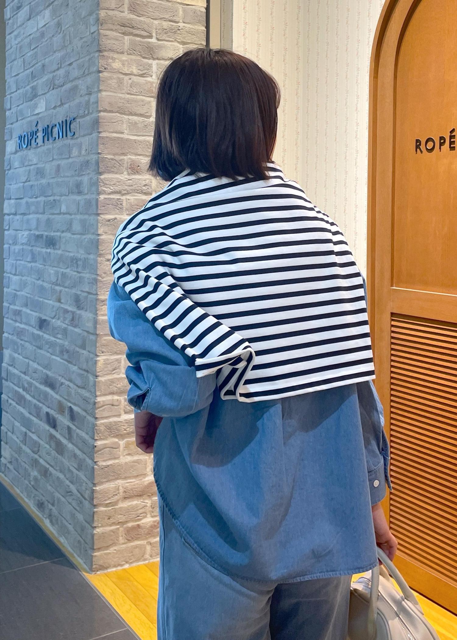 ボーダーカットソーを肩掛けしてこなれたスタイルに◎