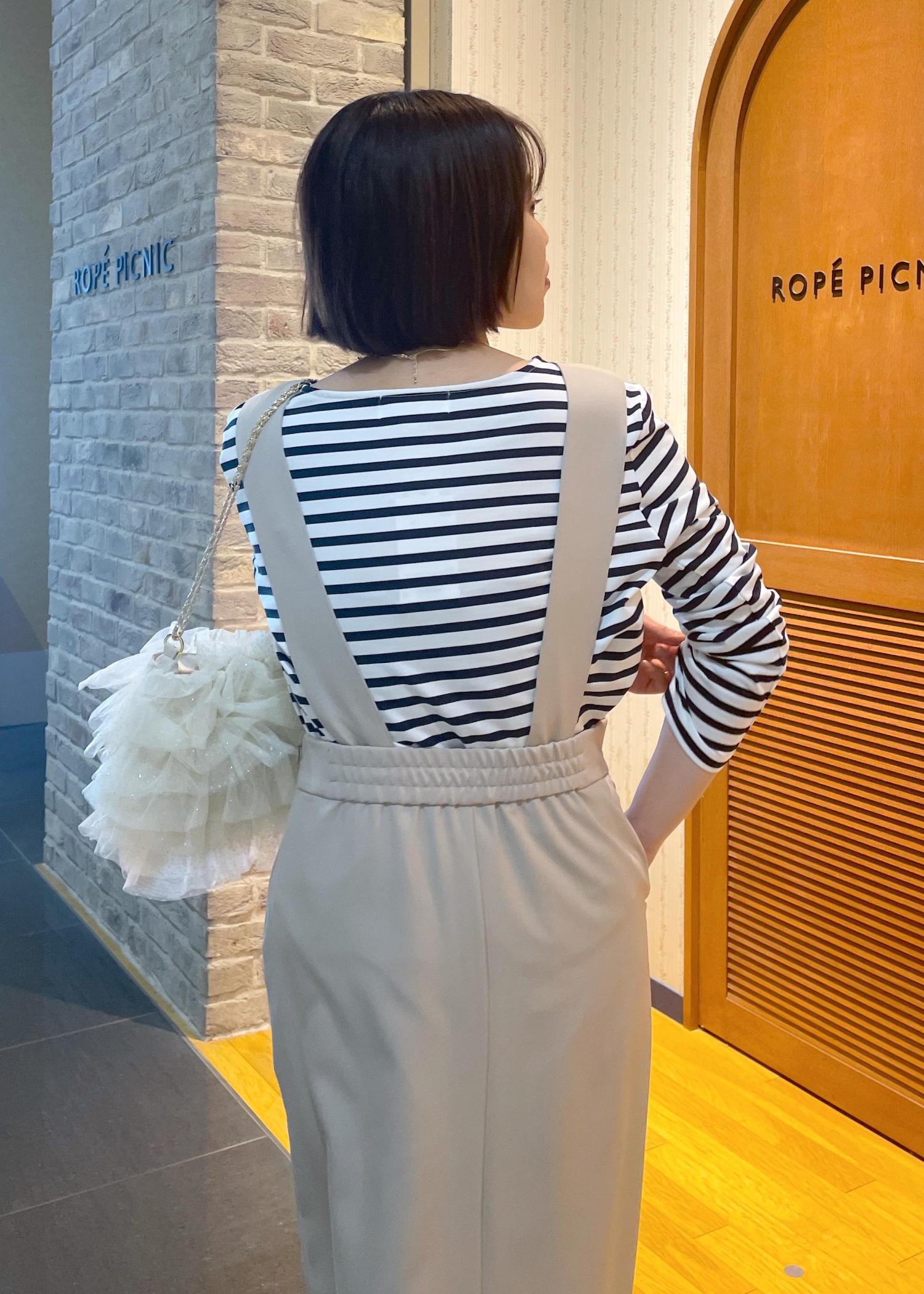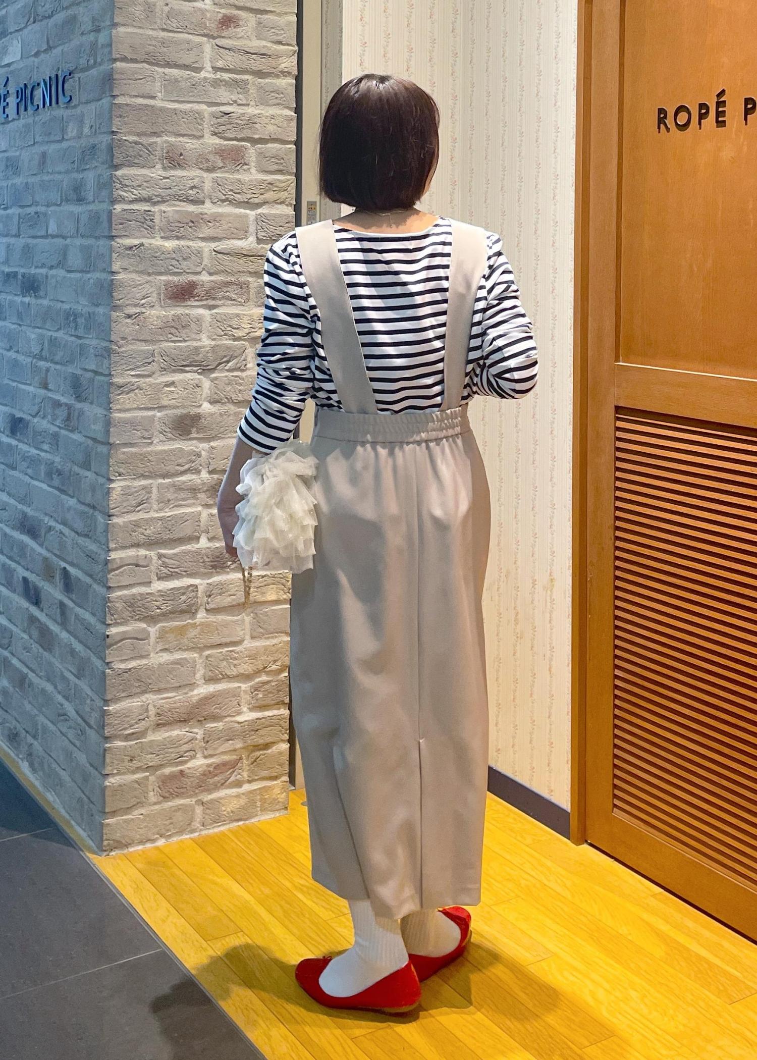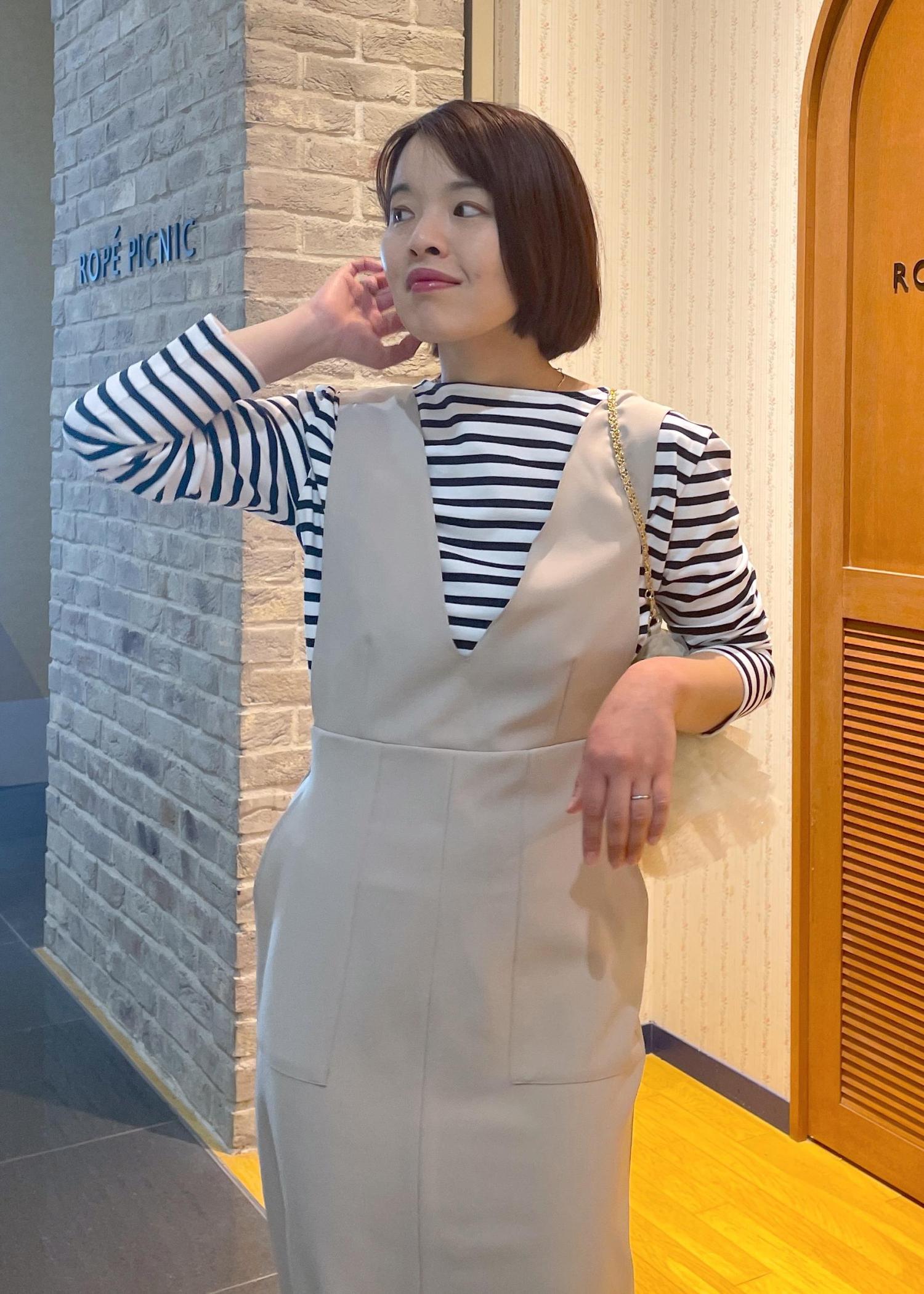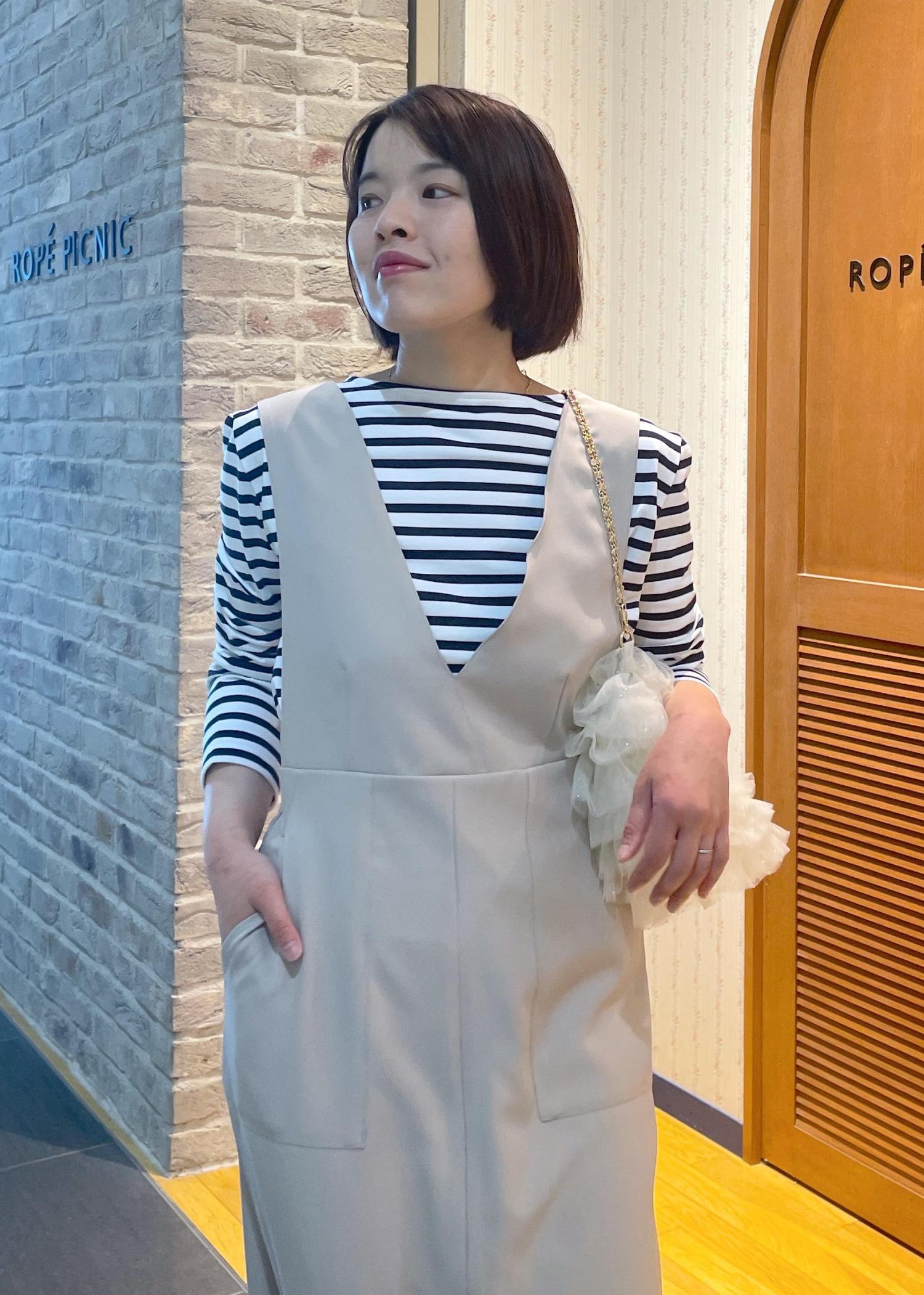 ベージュのジャンパースカートにボーダートップスを合わせた、春にぴったりのお出かけカジュアルコーデです!