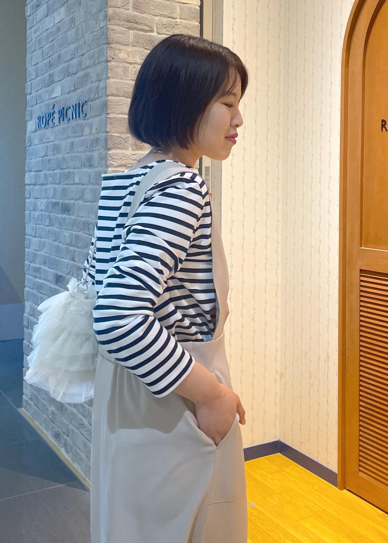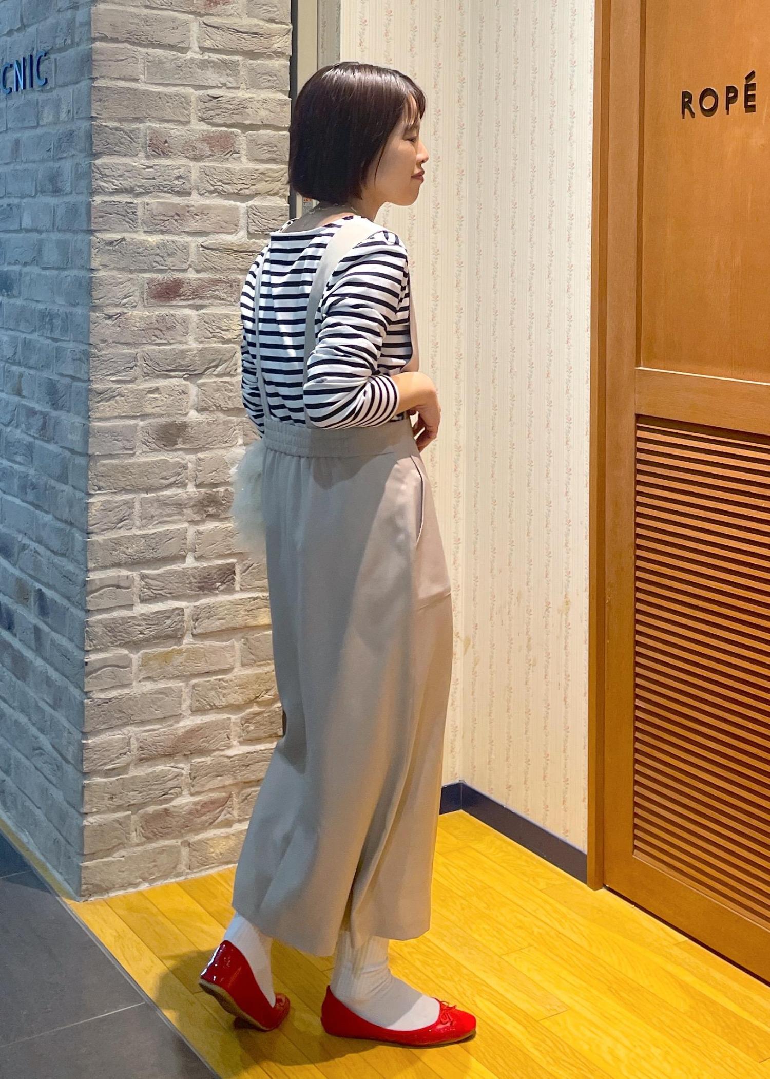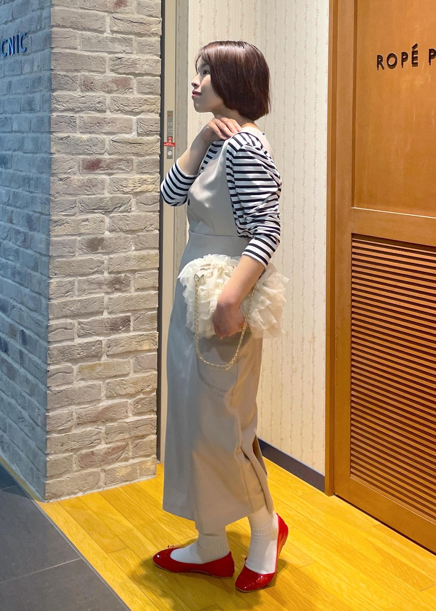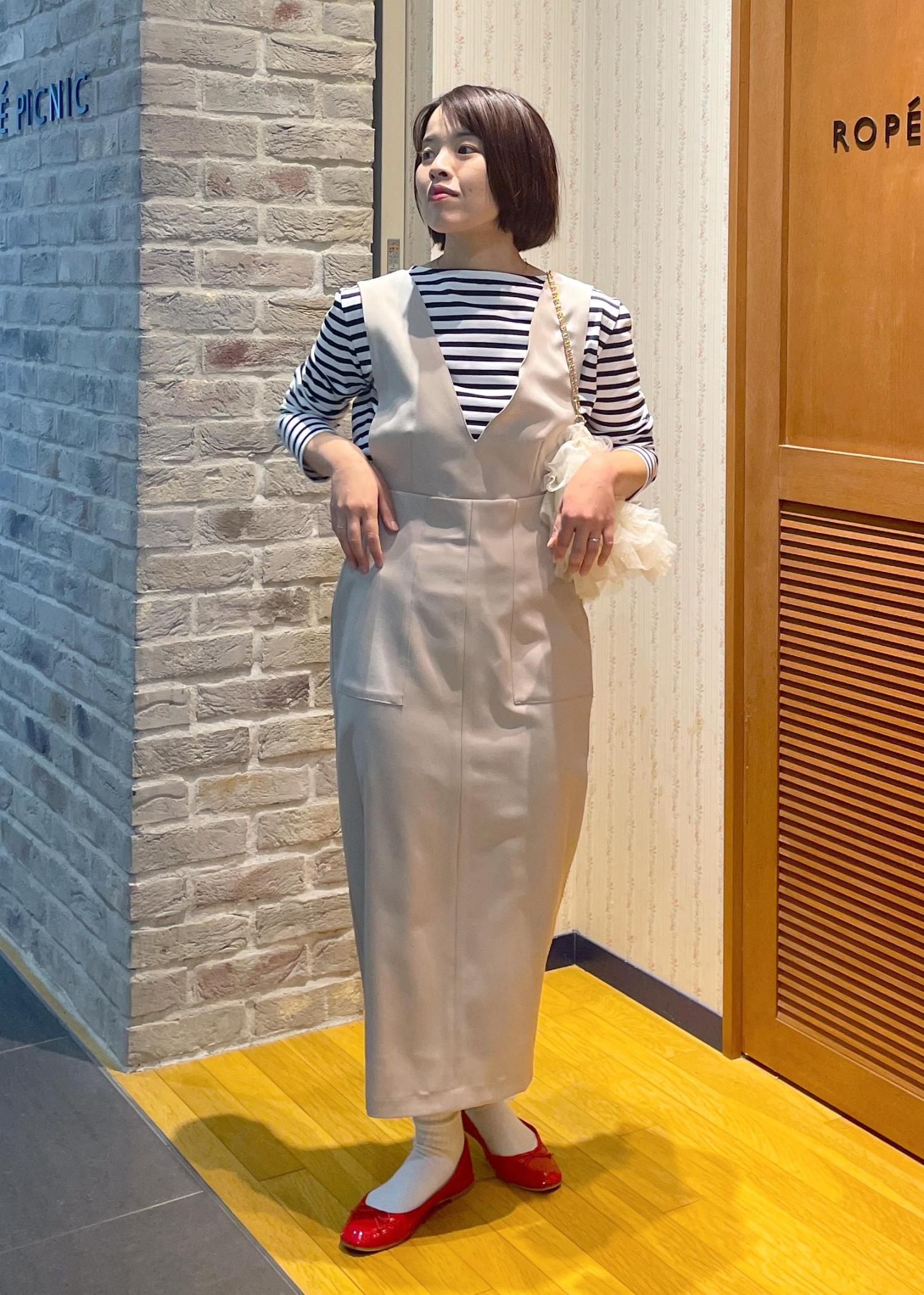 ベージュのジャンパースカートにボーダートップスを合わせた、春にぴったりのお出かけカジュアルコーデです!