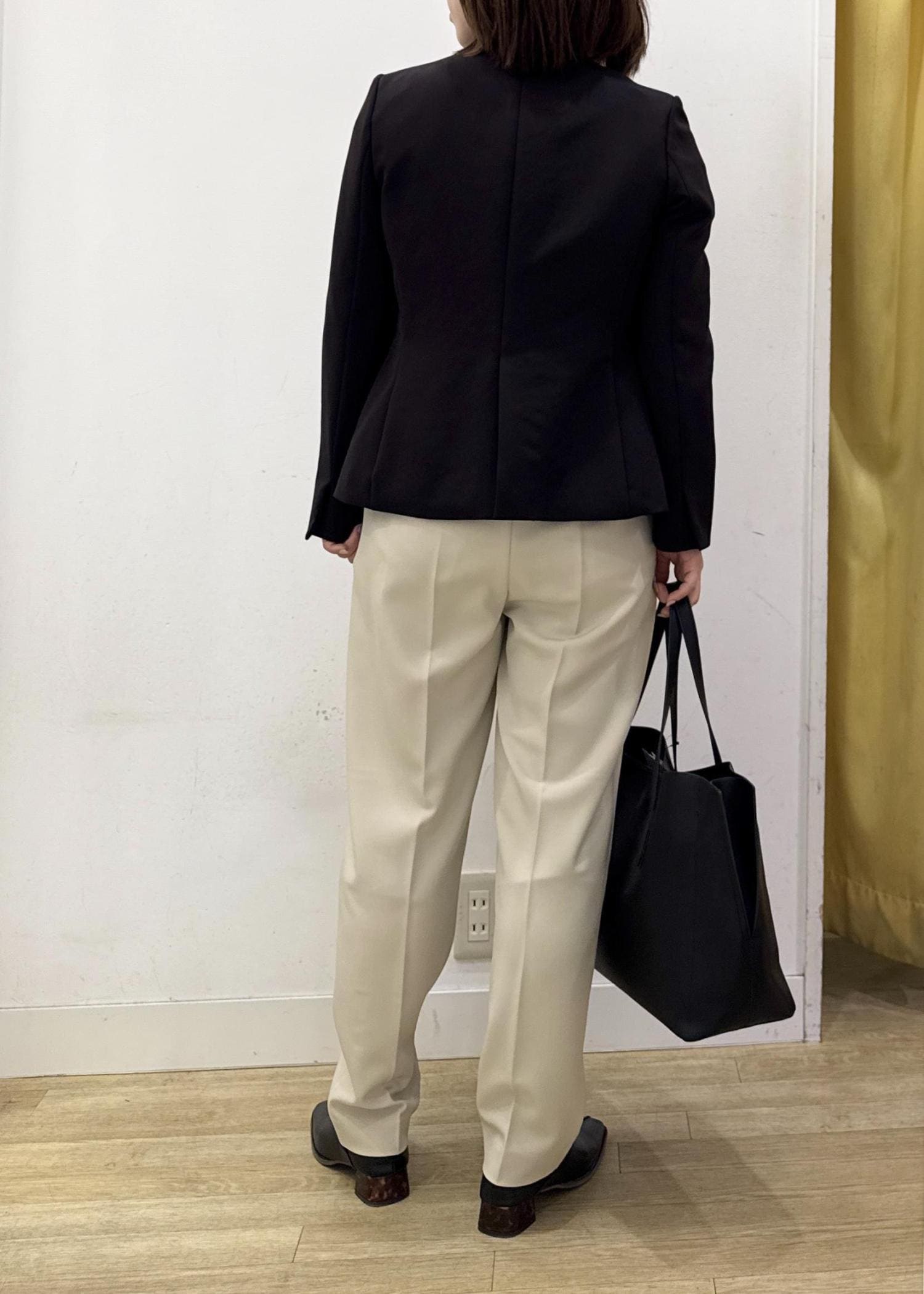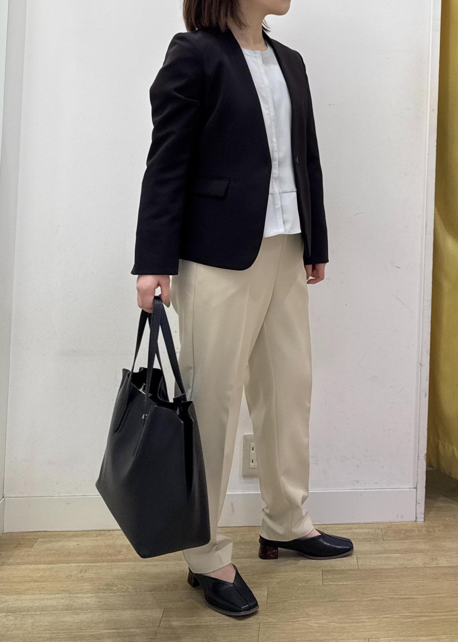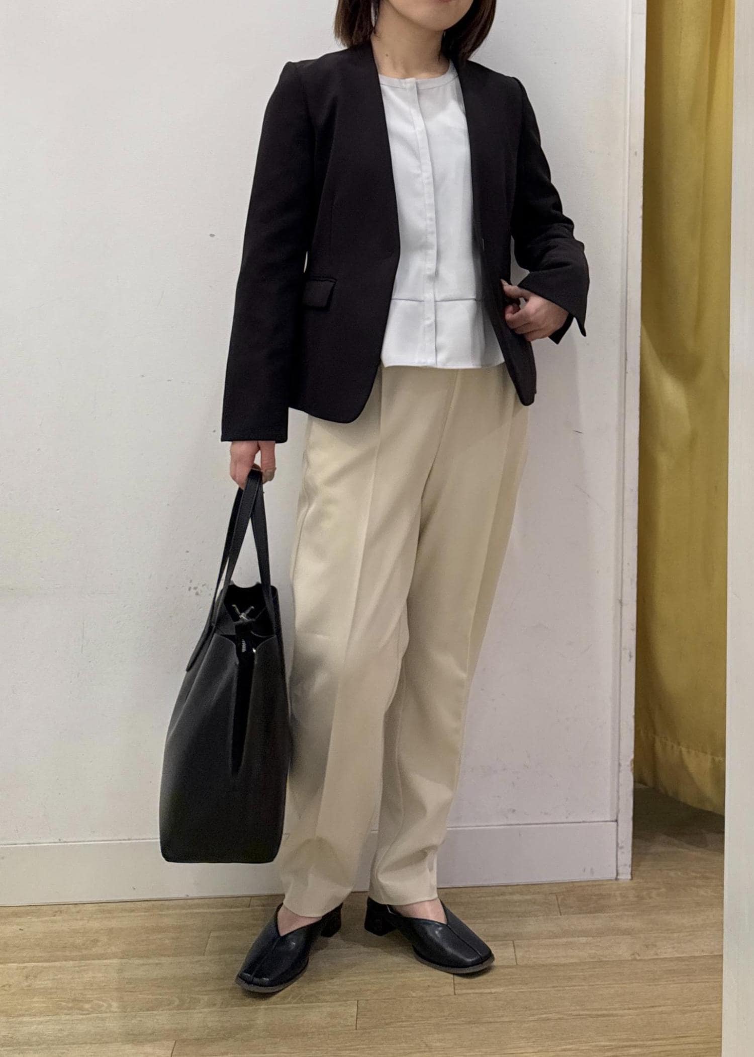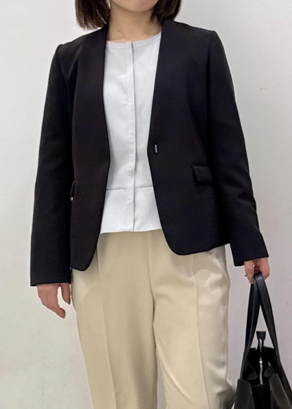 ライトグリーンのブラウス、ベージュのテーパードパンツで春らしい明るい雰囲気にまとめてブラックのジャケットで締めるのがポイント☺︎