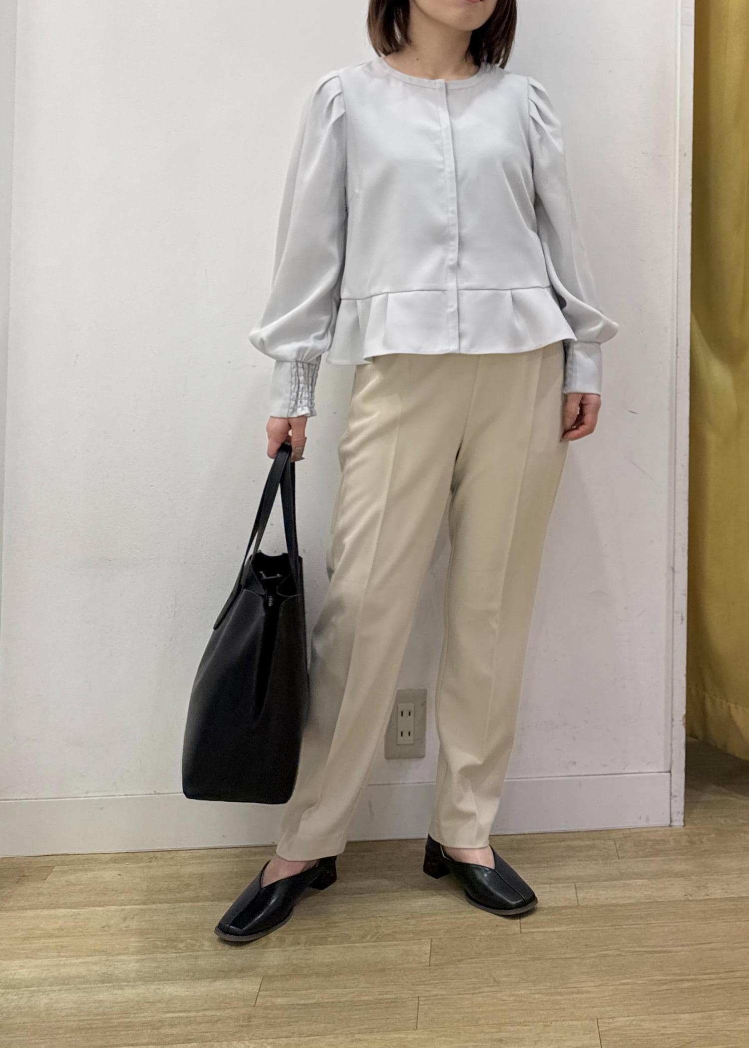 裾のペプラムデザインは広がり過ぎず、アウトスタイルでも長すぎない着丈です。 -