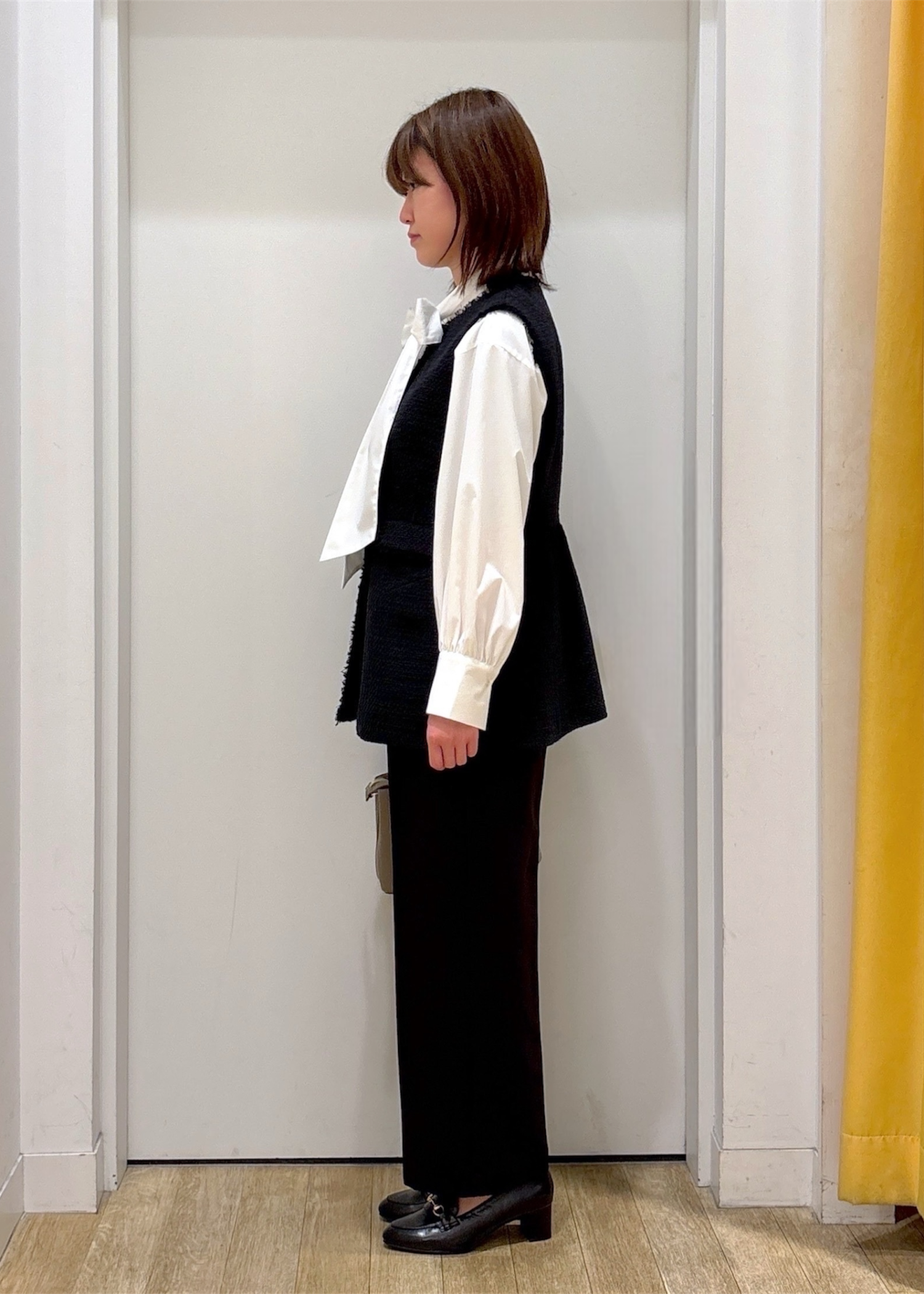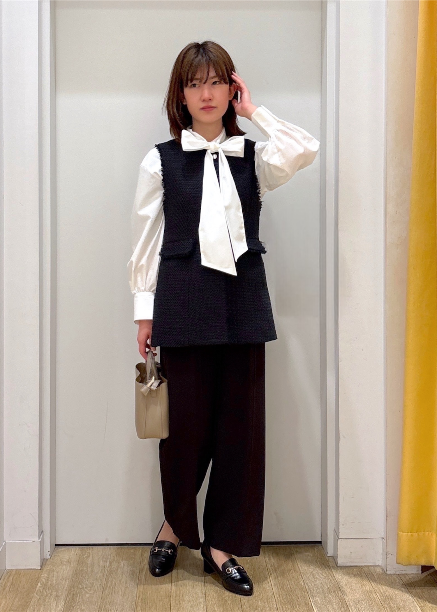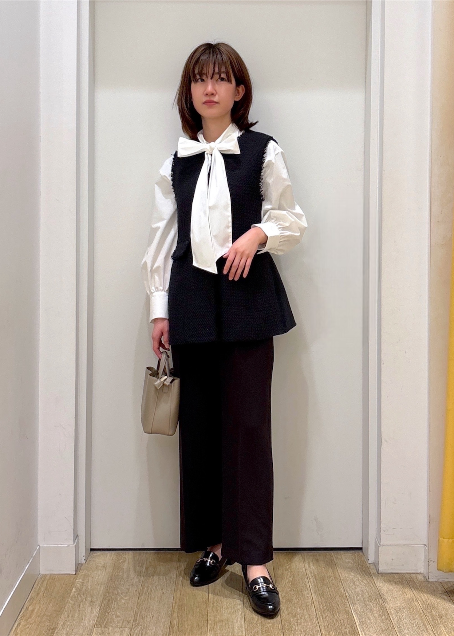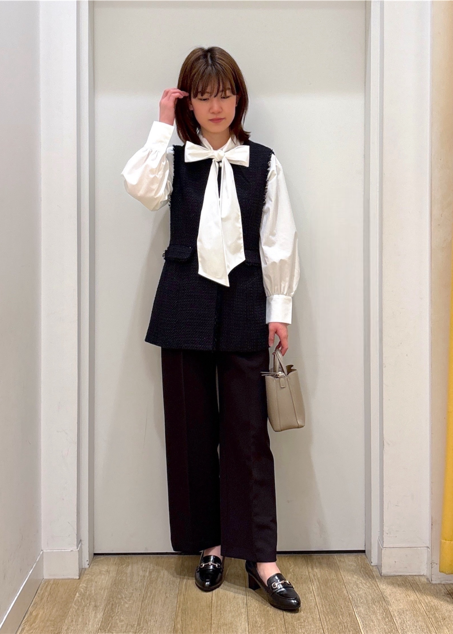 リボンブラウス合わせで堅苦しくなりすぎないようにしました。