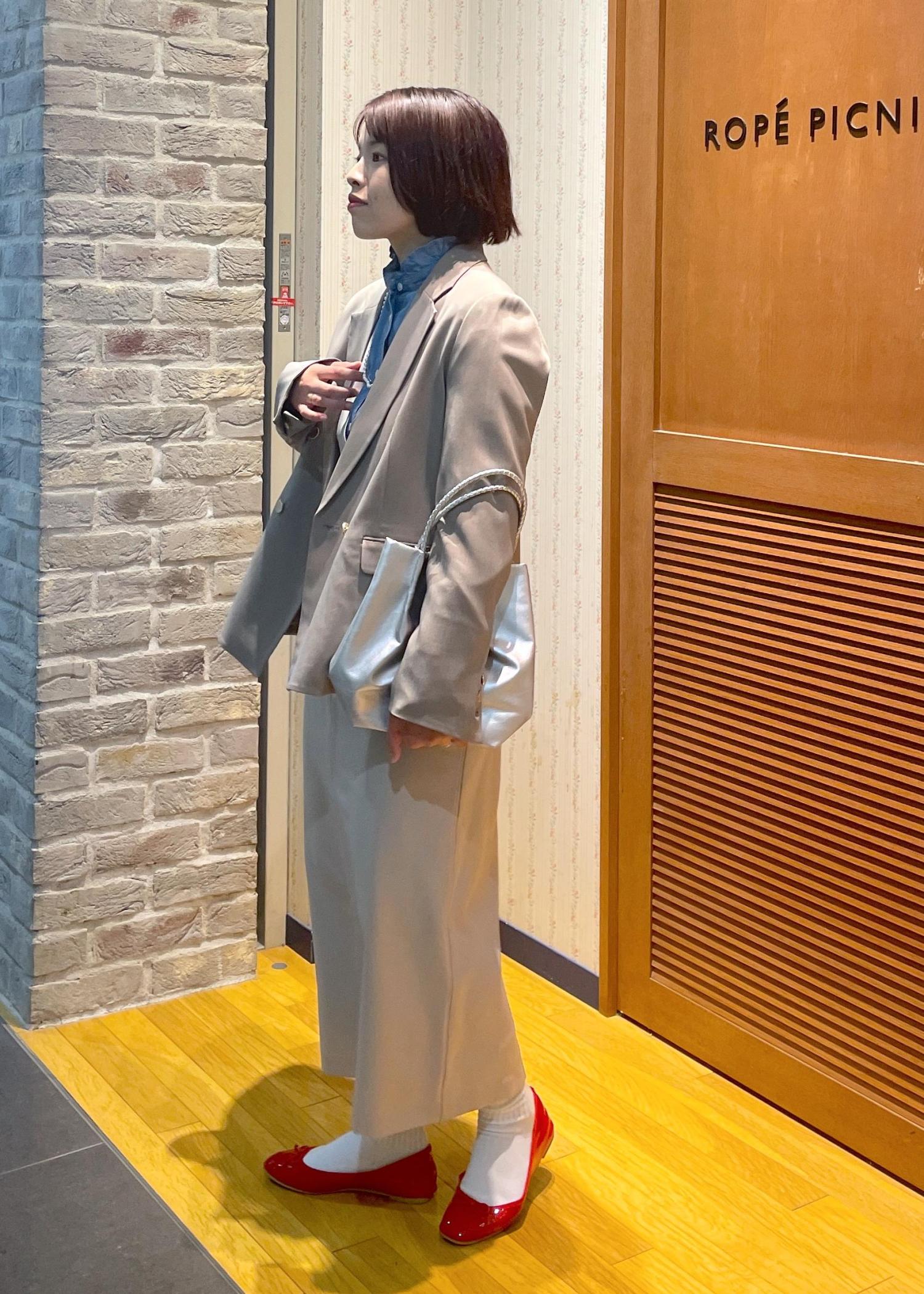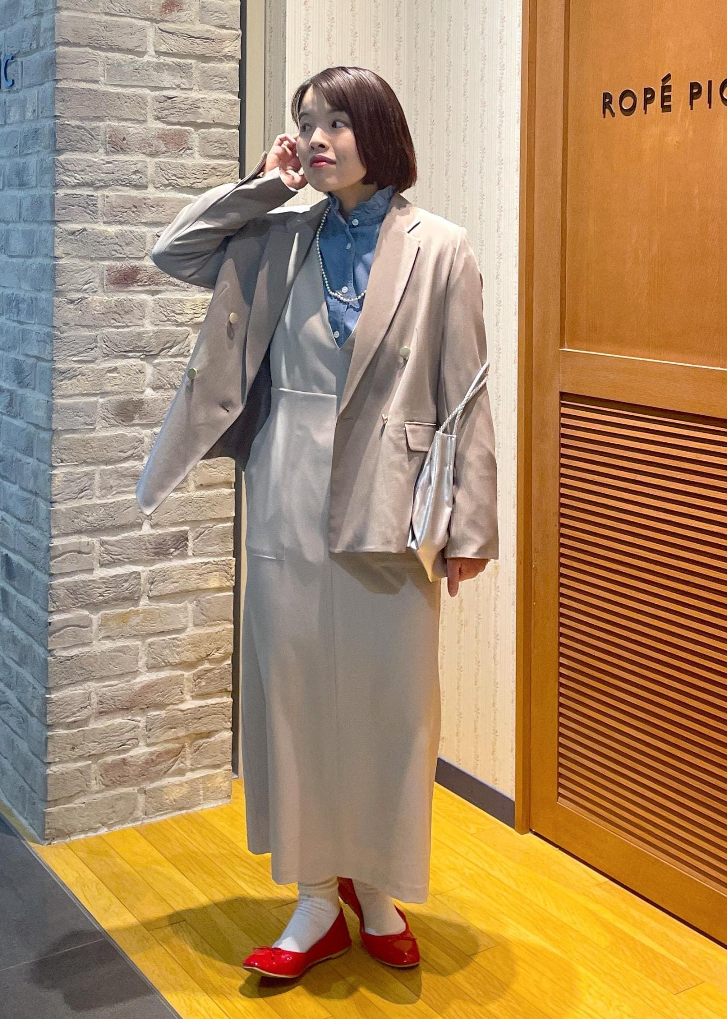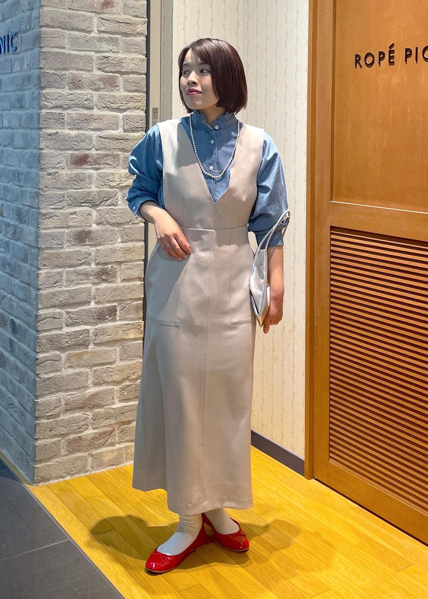 休日のお出かけにも使いやすいに、ジャンスカのインナーにはデニムシャツを、足元は赤のバレエシューズを合わせて、フレンチシックでカジュアルな雰囲気に◎