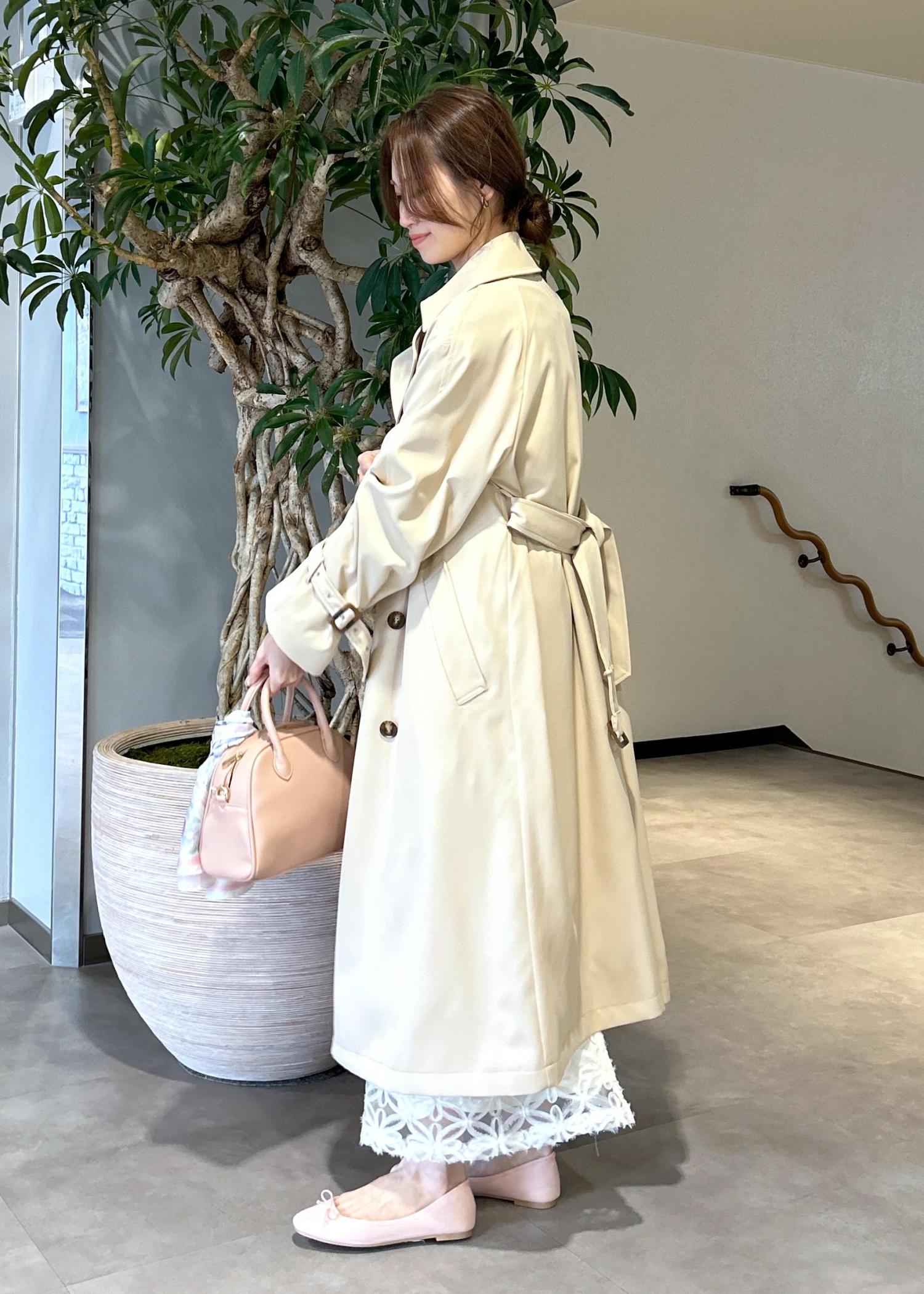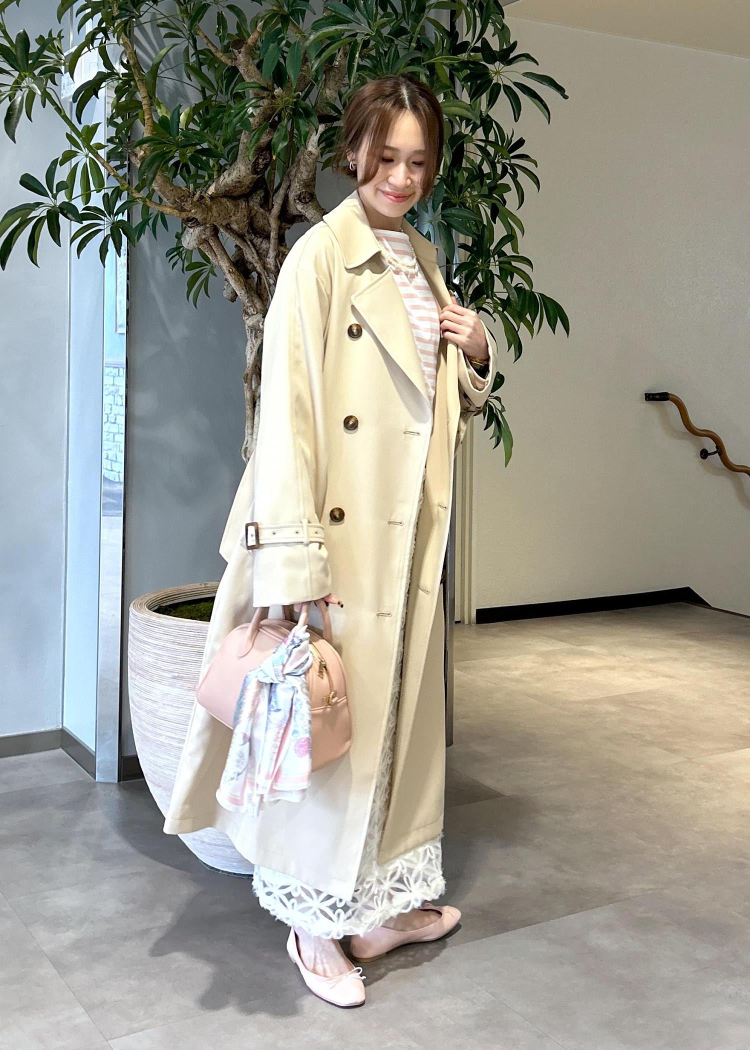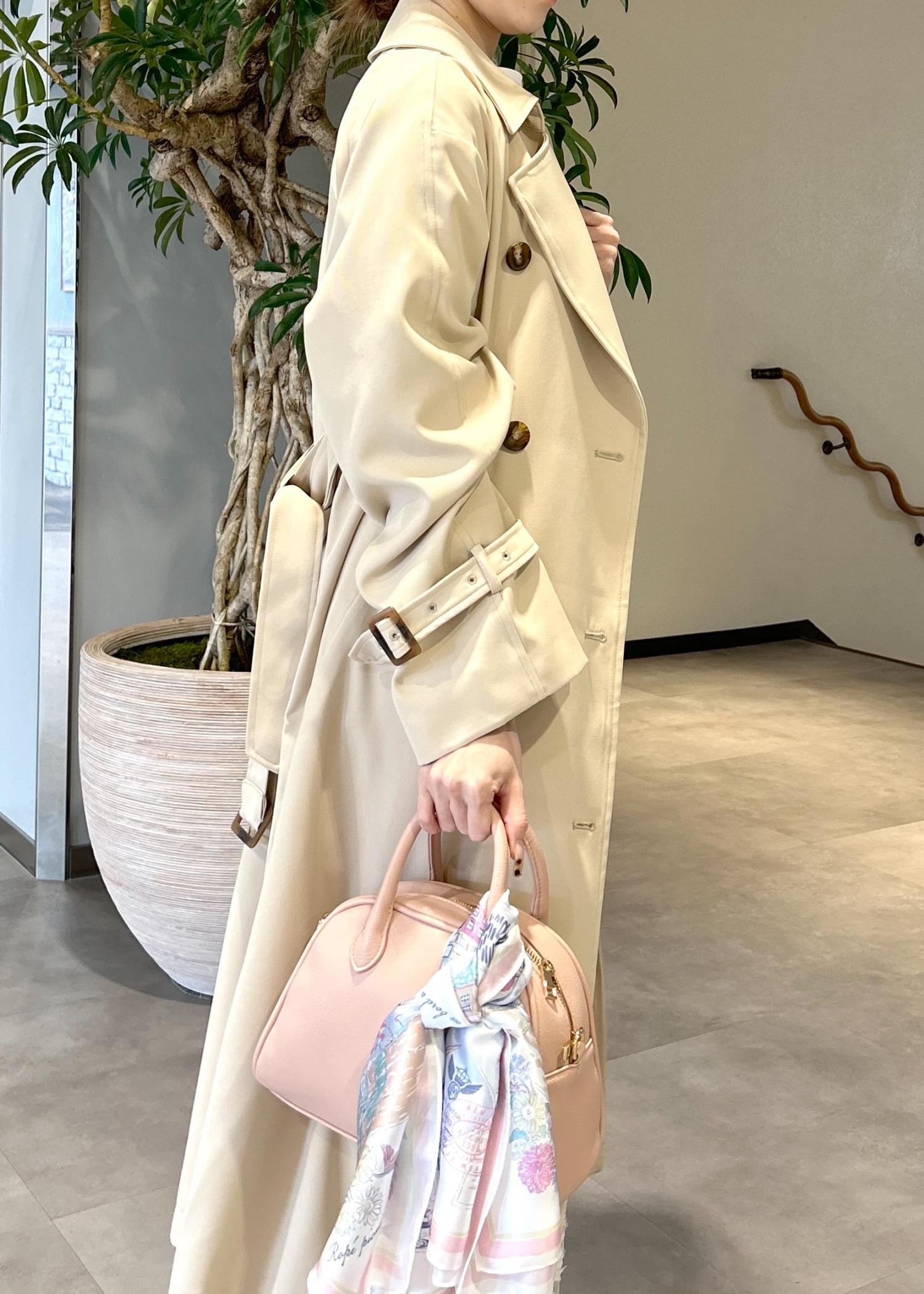 ベージュのトレンチコートに小物はピンクで春先取りなスタイリングにしました。