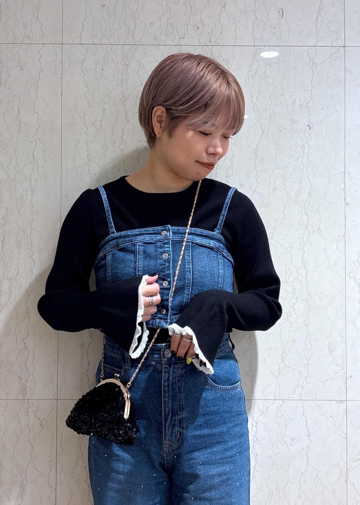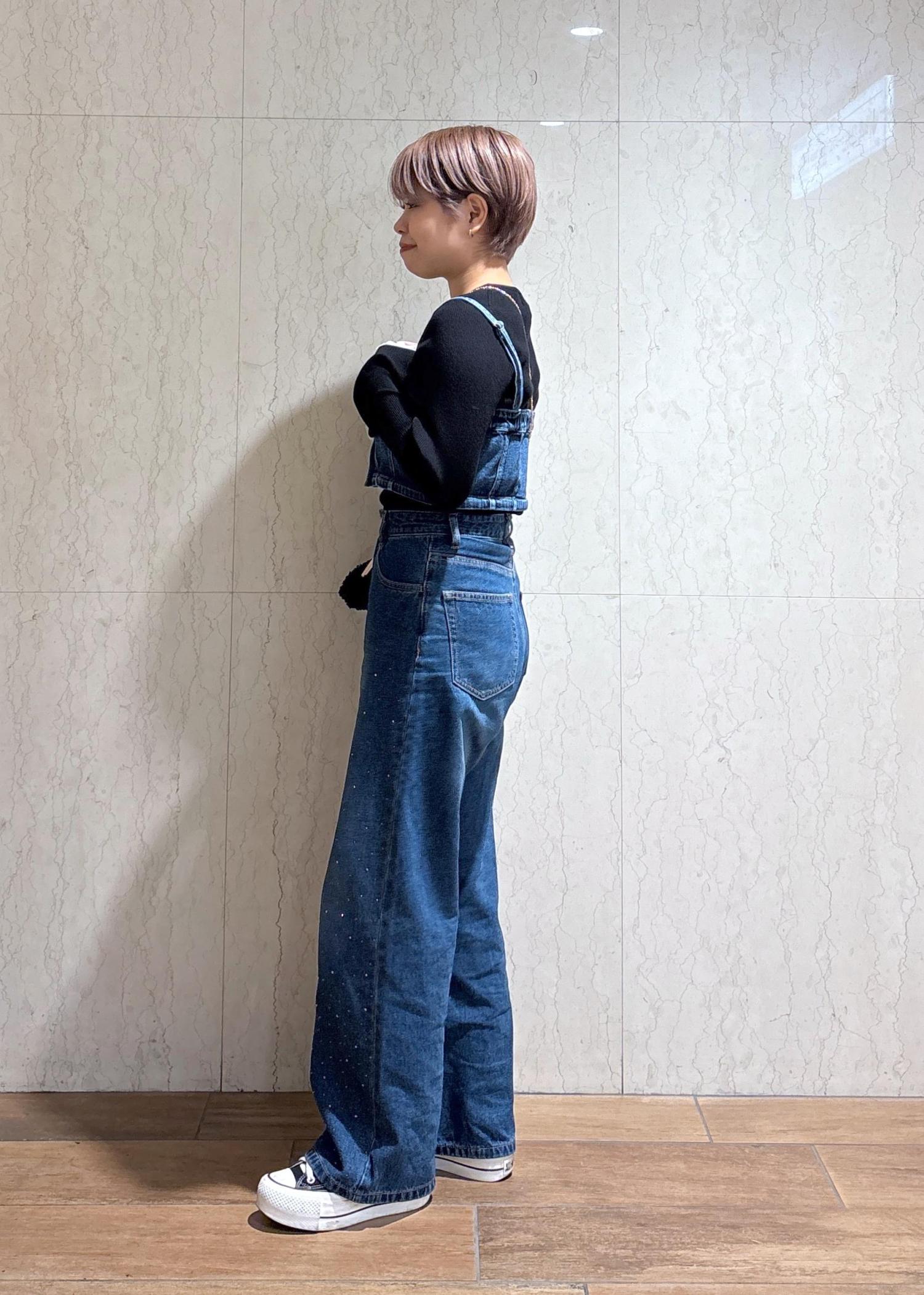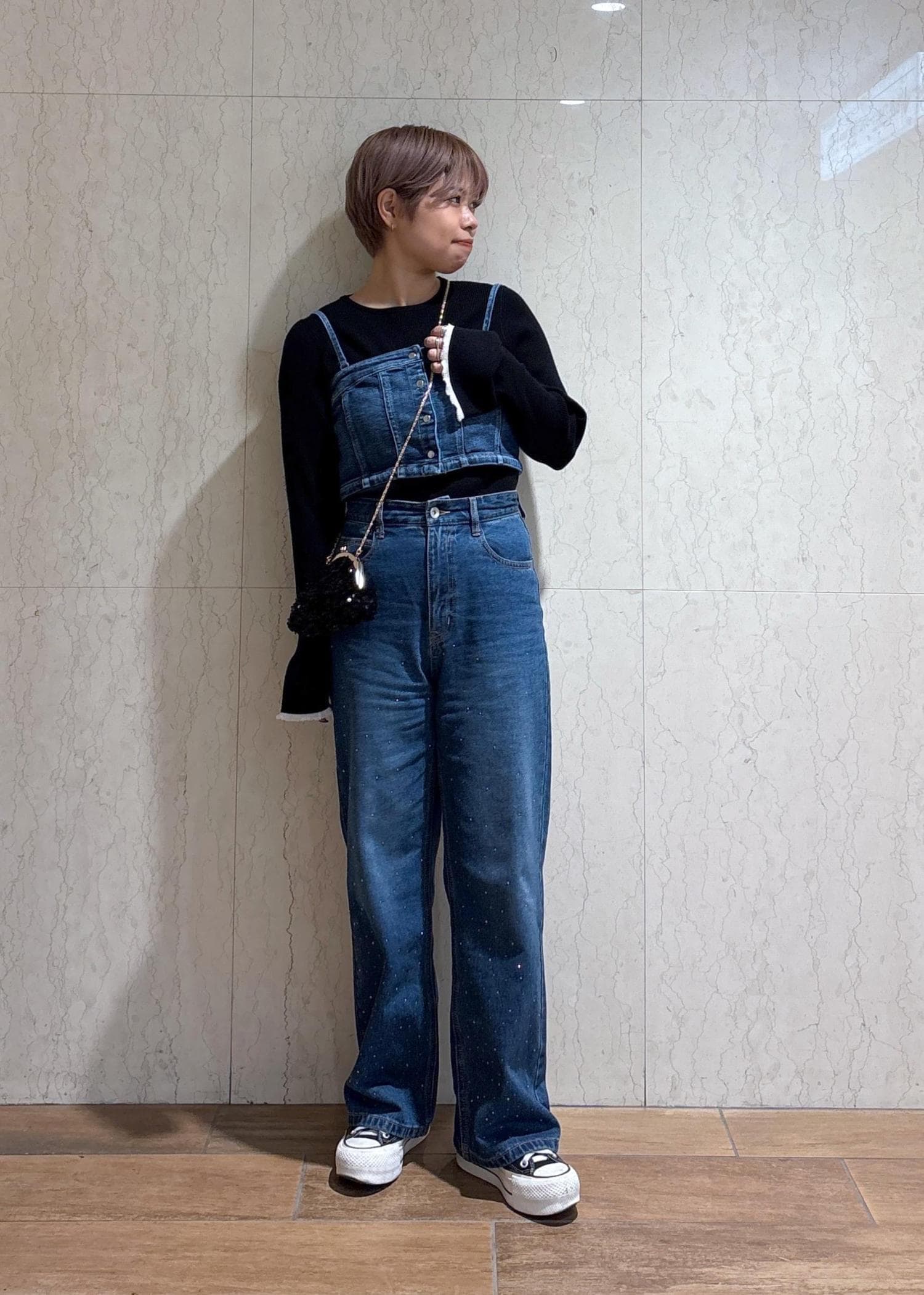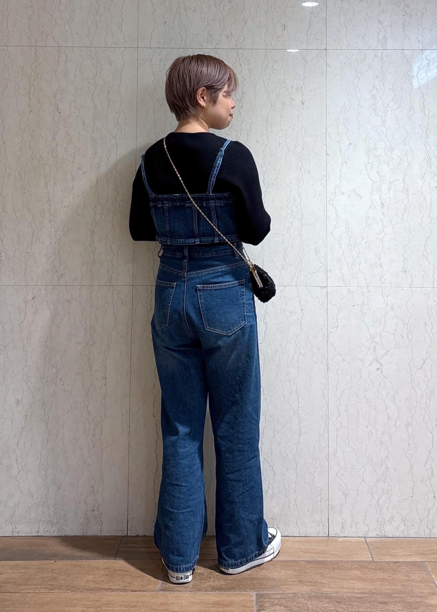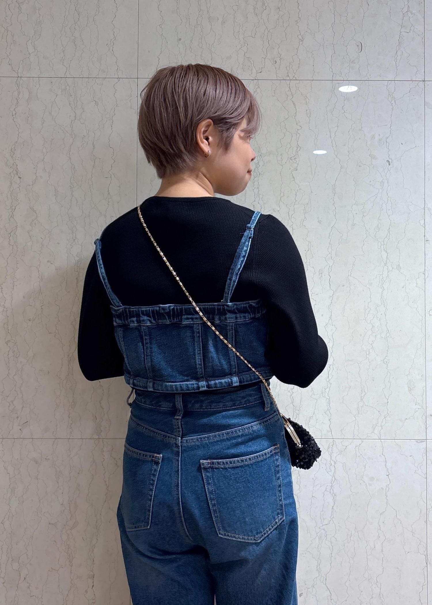 今回はデニムのパンツとビスチェを使って、セットアップ風のコーディネートを組みました。