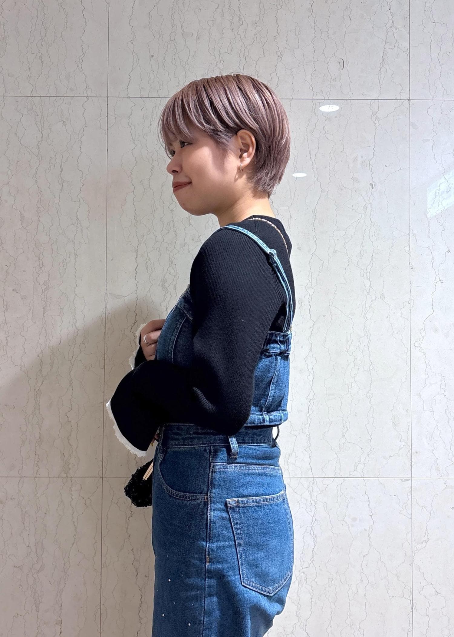インナーをスッキリとした黒のニットにすることで、カジュアルすぎないスタイリングにした事がポイントです。