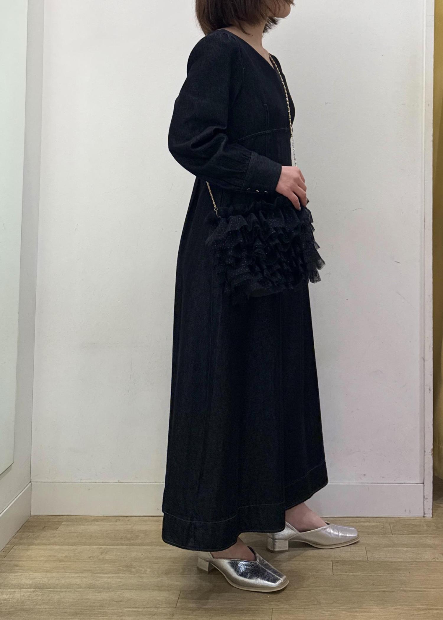 バッグとワンピースのシックな色合わせにバブーシュのシルバーがポイントのコーディネートです☺︎