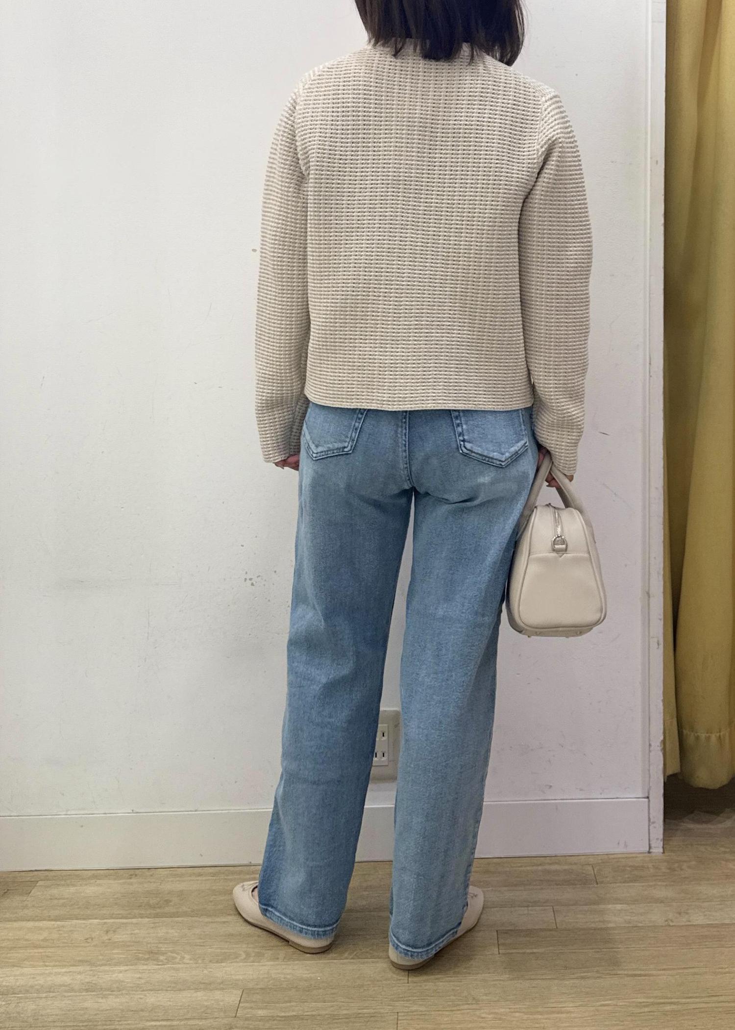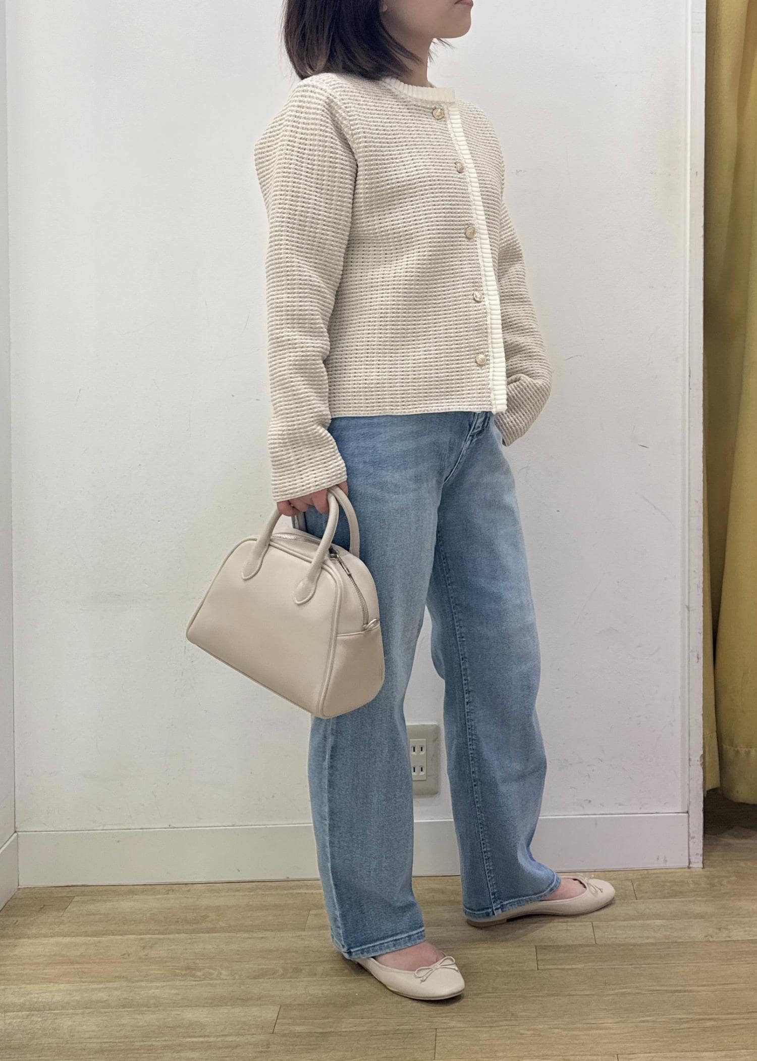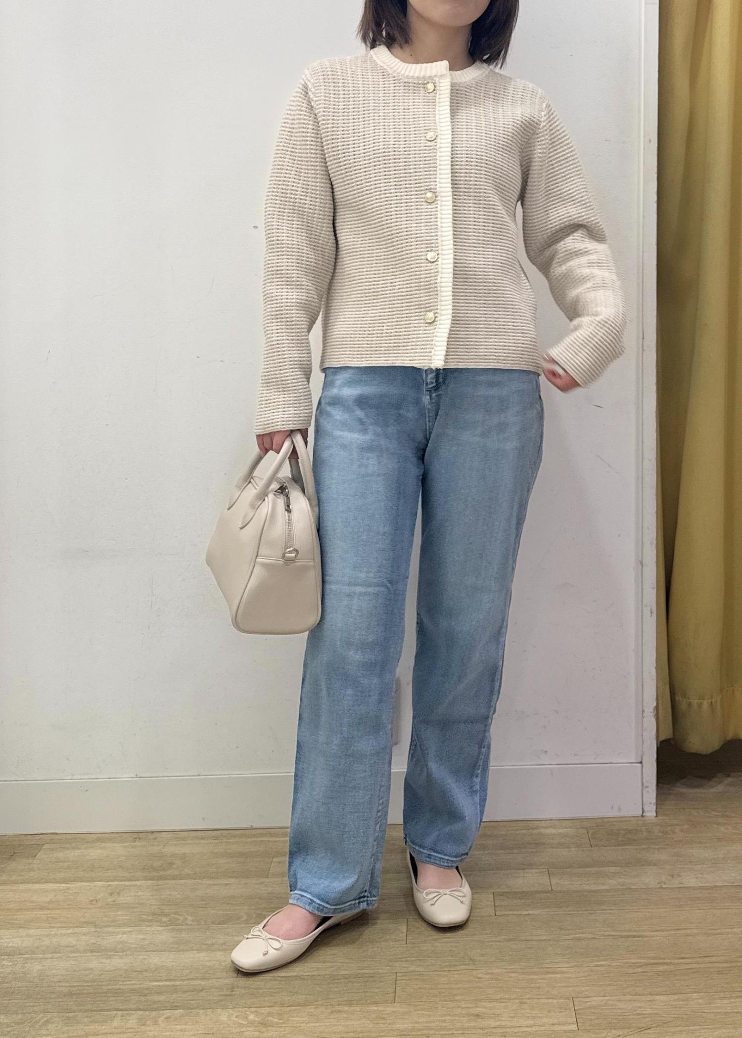 デニムにちょっとキレイ見えするカーディジャケットをトップス風に合わせれば、ちゃんと感もありつつラフに着られるコーディネートに☺︎