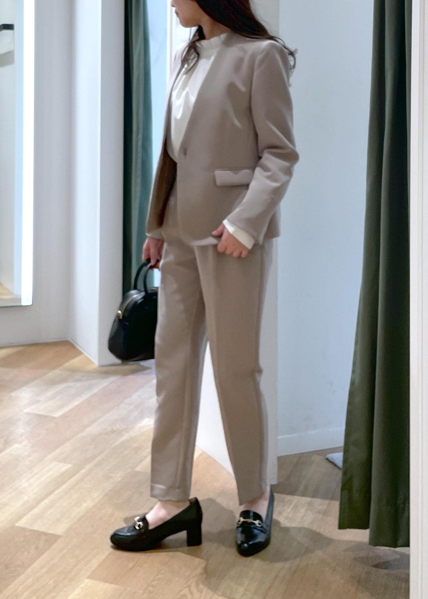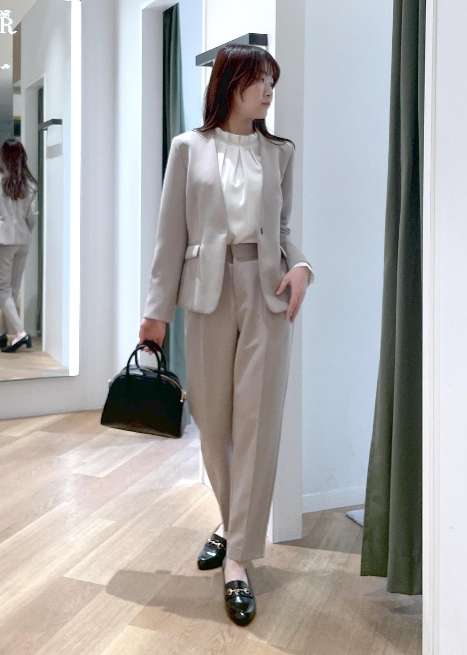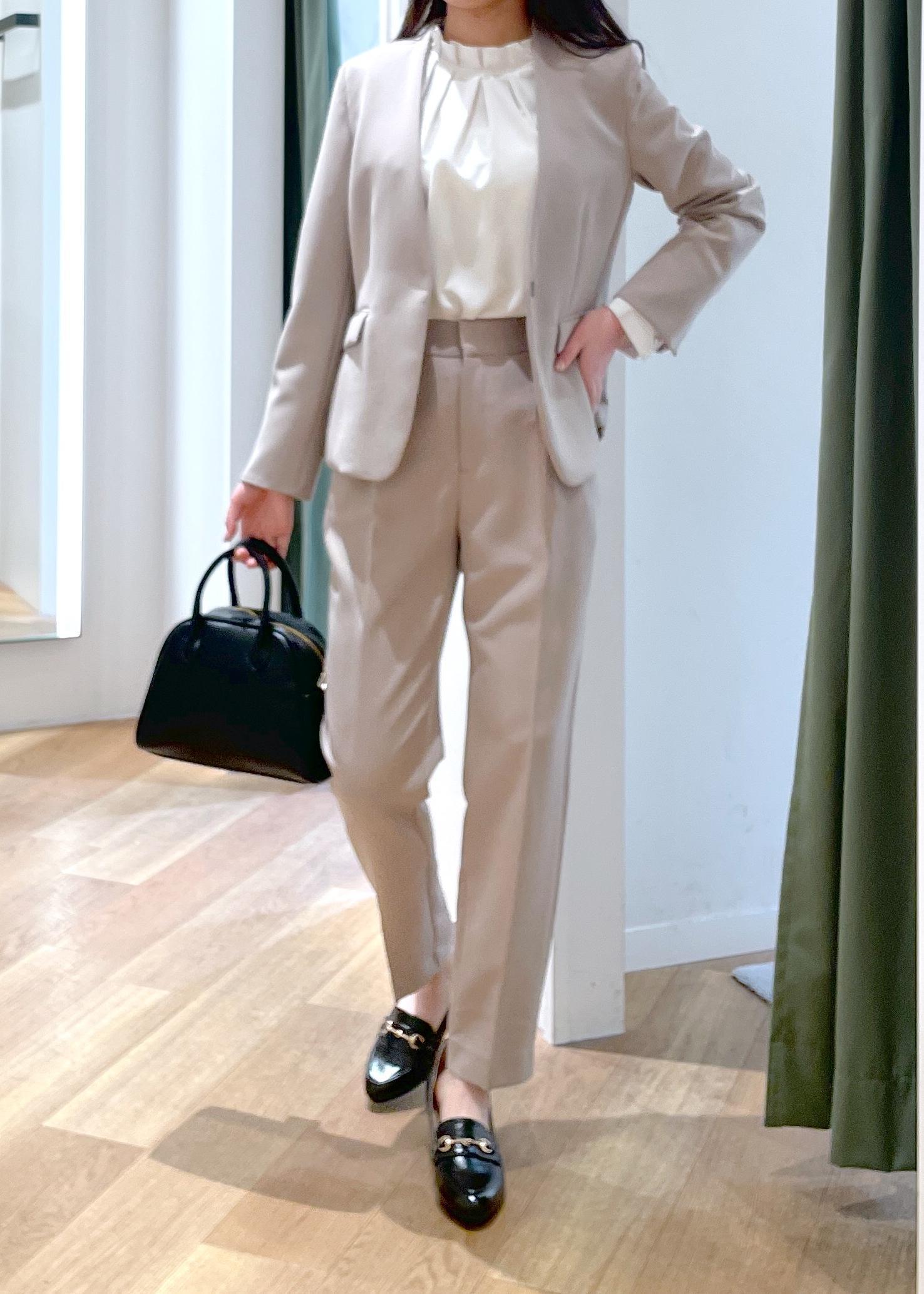 セットで着られるジャケットとパンツをベージュの色味で合わせきれいめコーデを組みました。