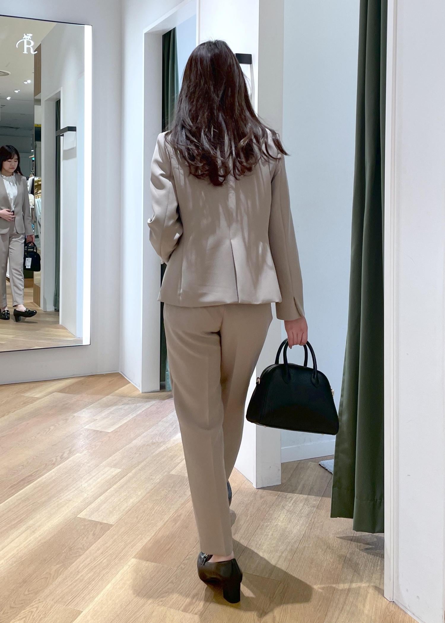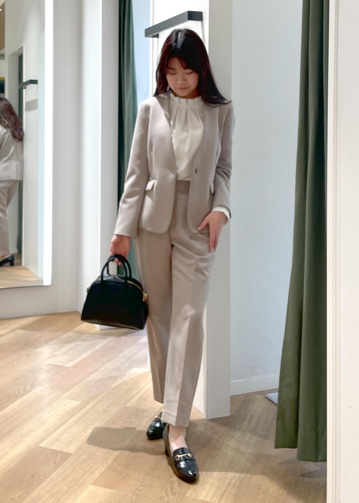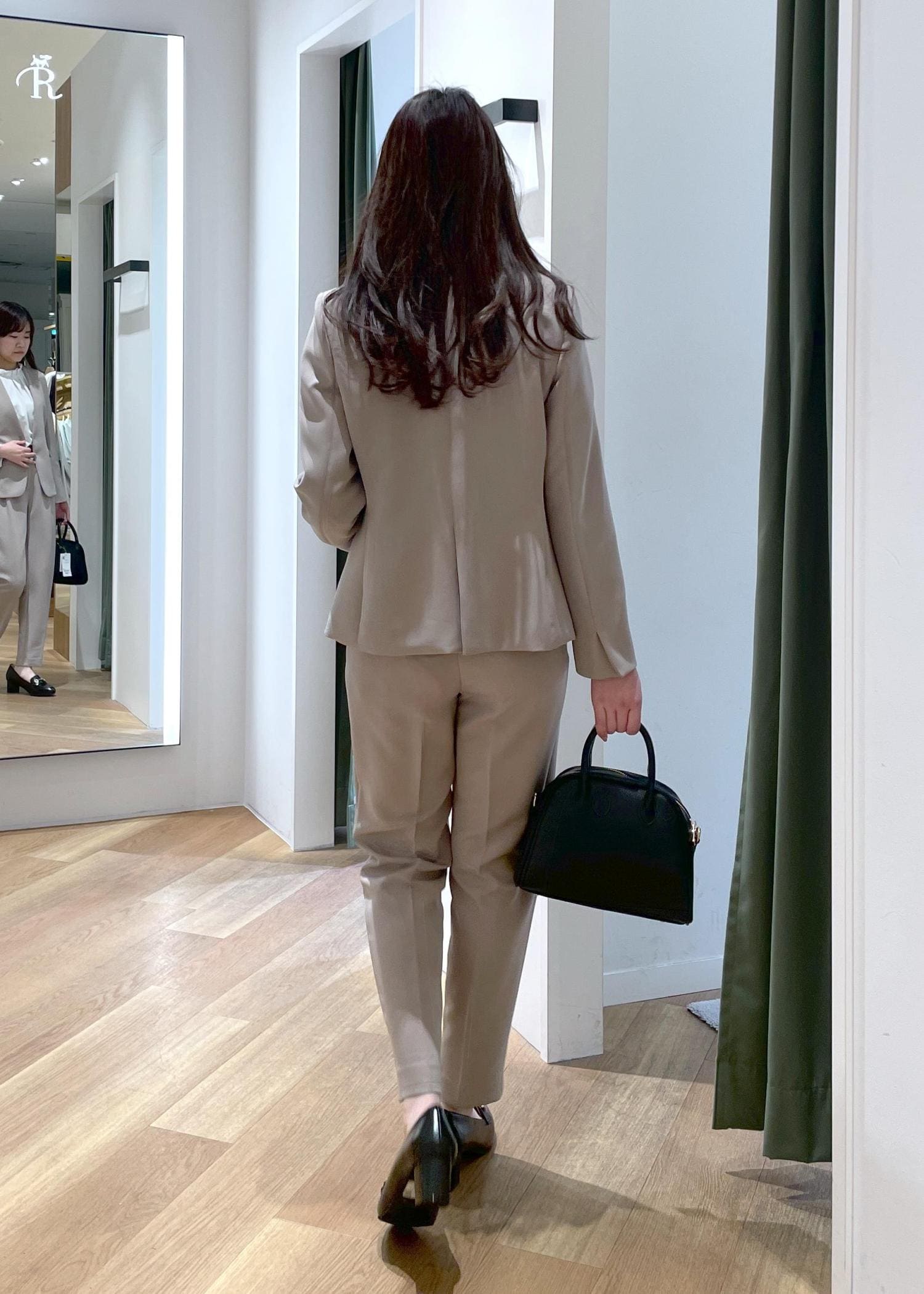 セットで着られるジャケットとパンツをベージュの色味で合わせきれいめコーデを組みました。