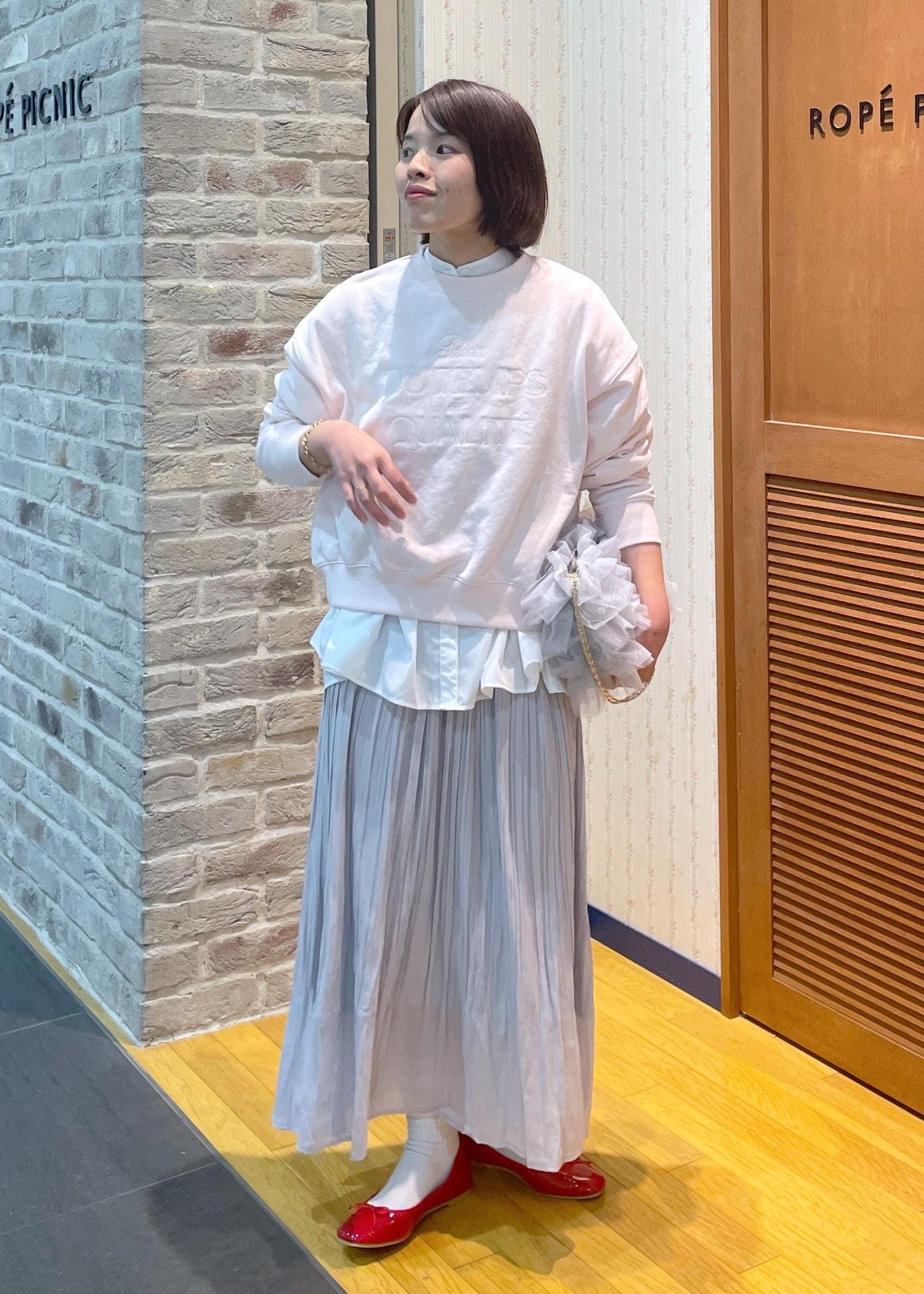 ピンクのスウェットにロングのプリーツスカートを合わせた、ほんのり甘めなカジュアルコーデです!