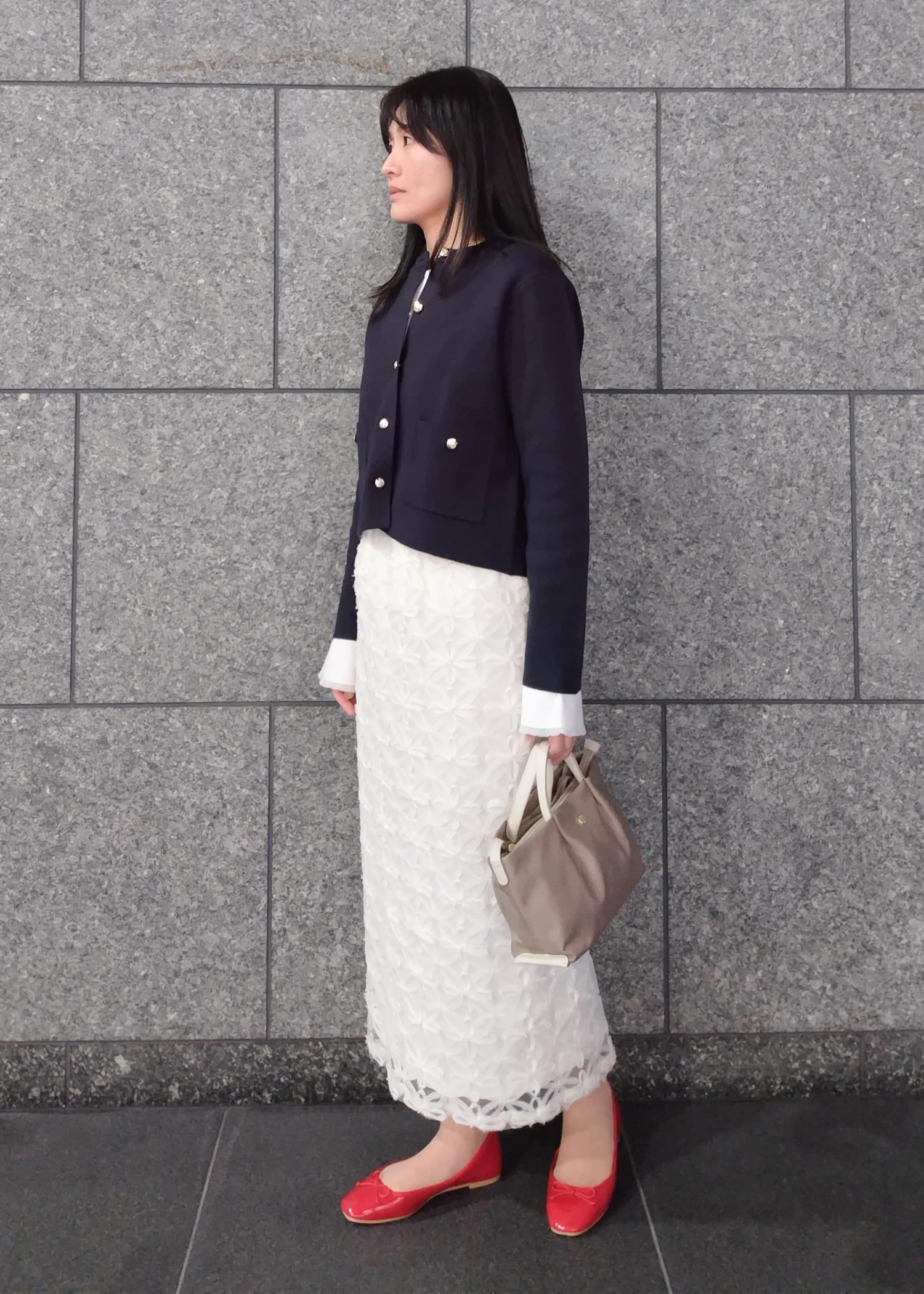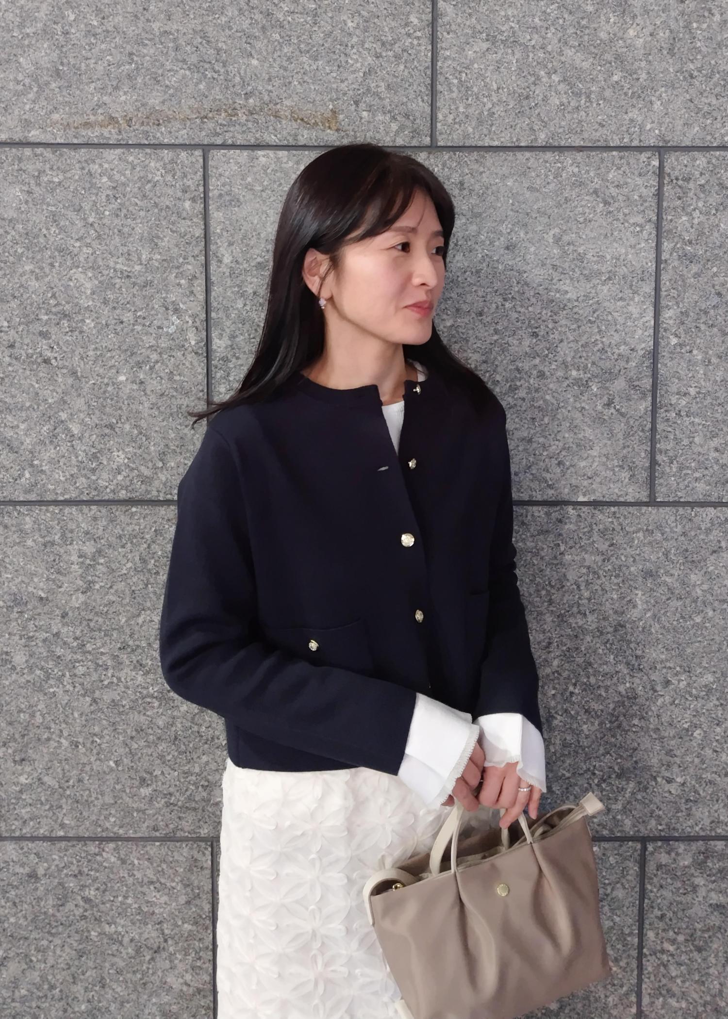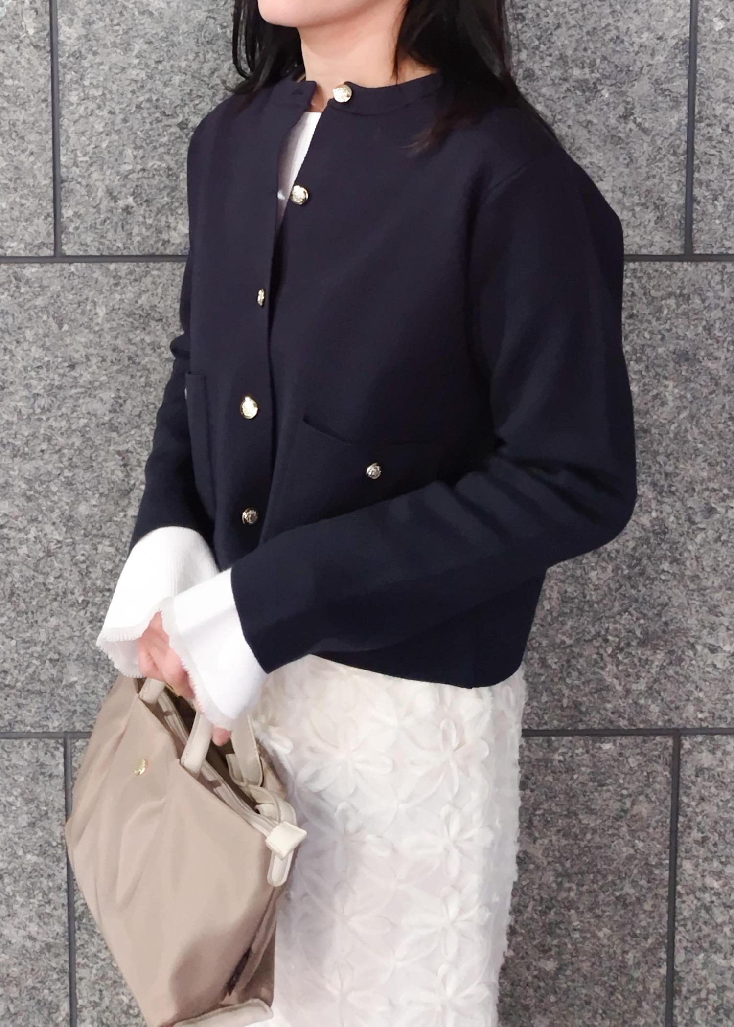 カーディガンはジャケットライクで品良く見えるデザインです。