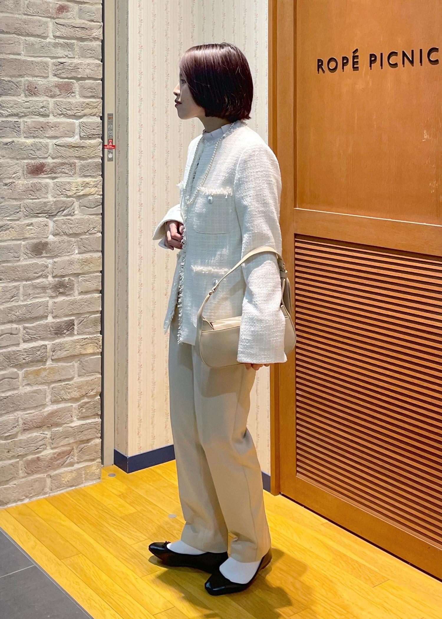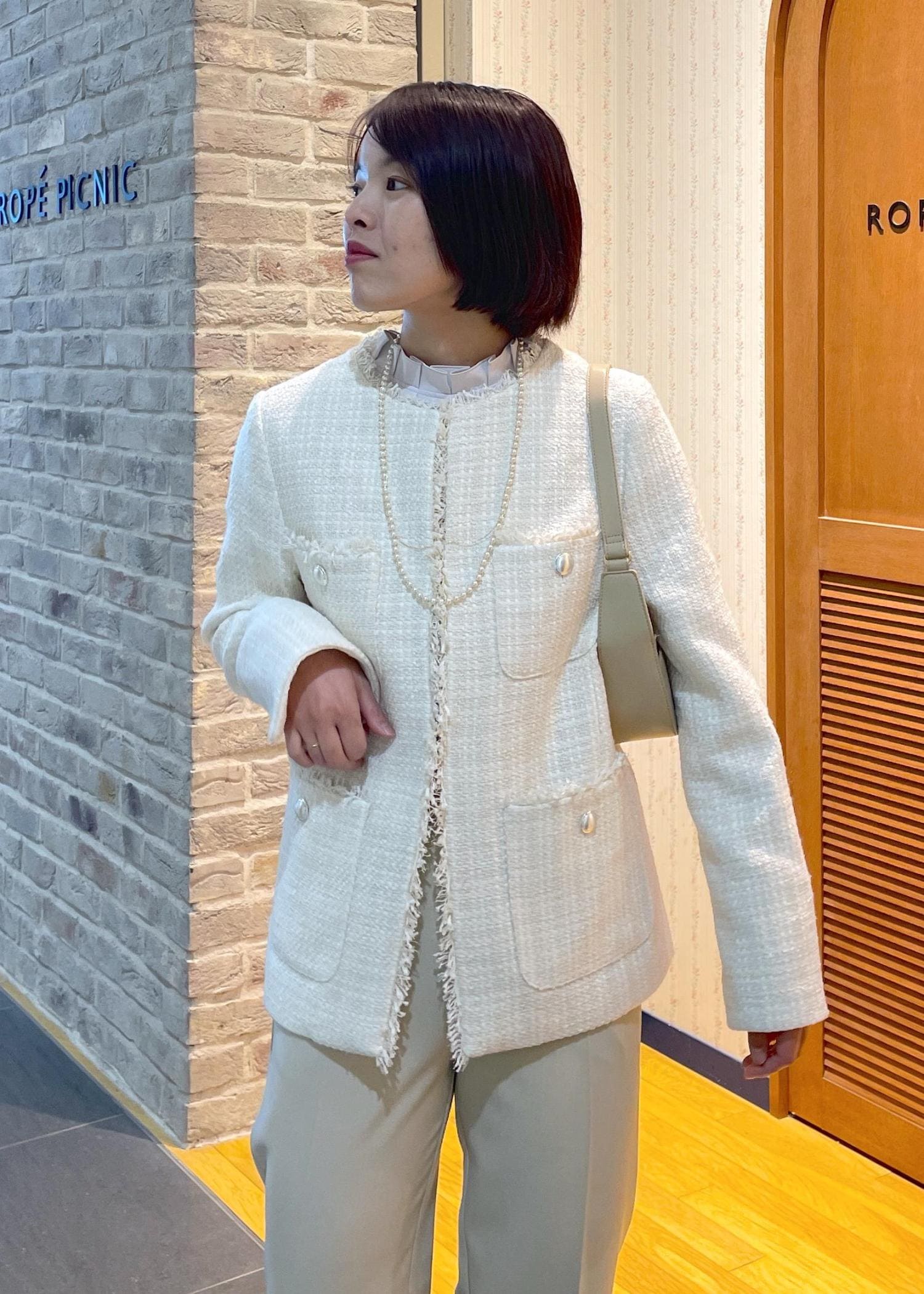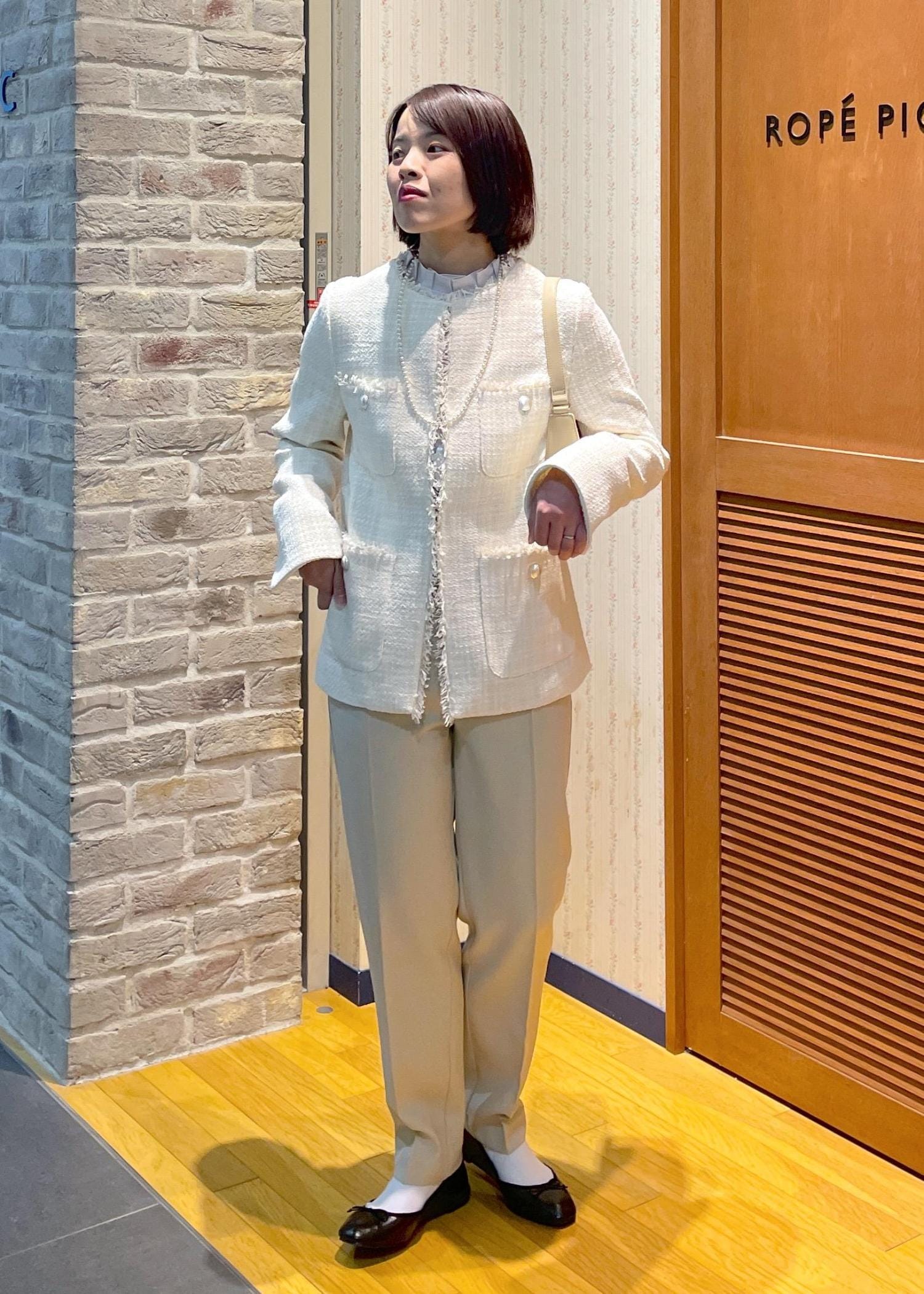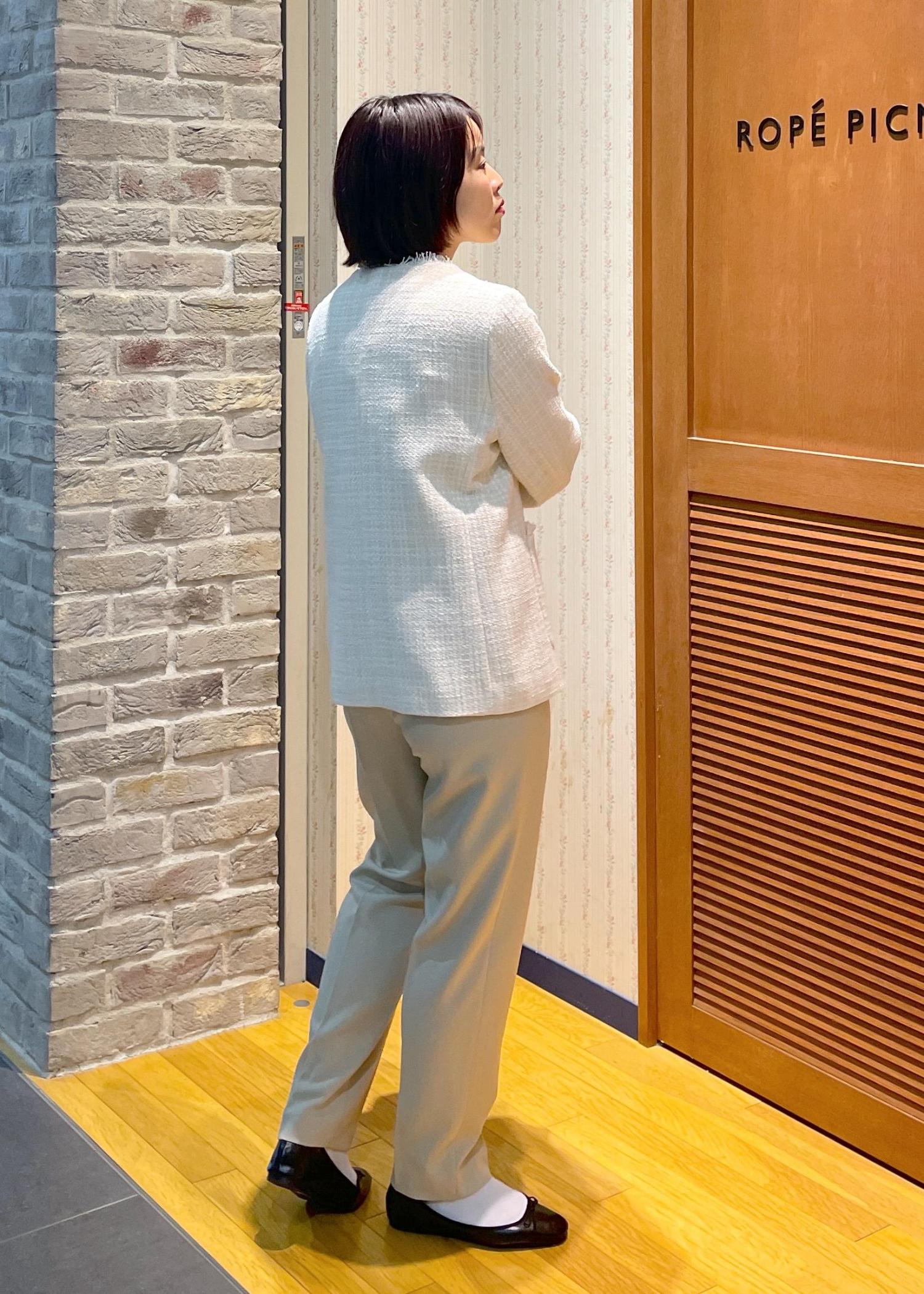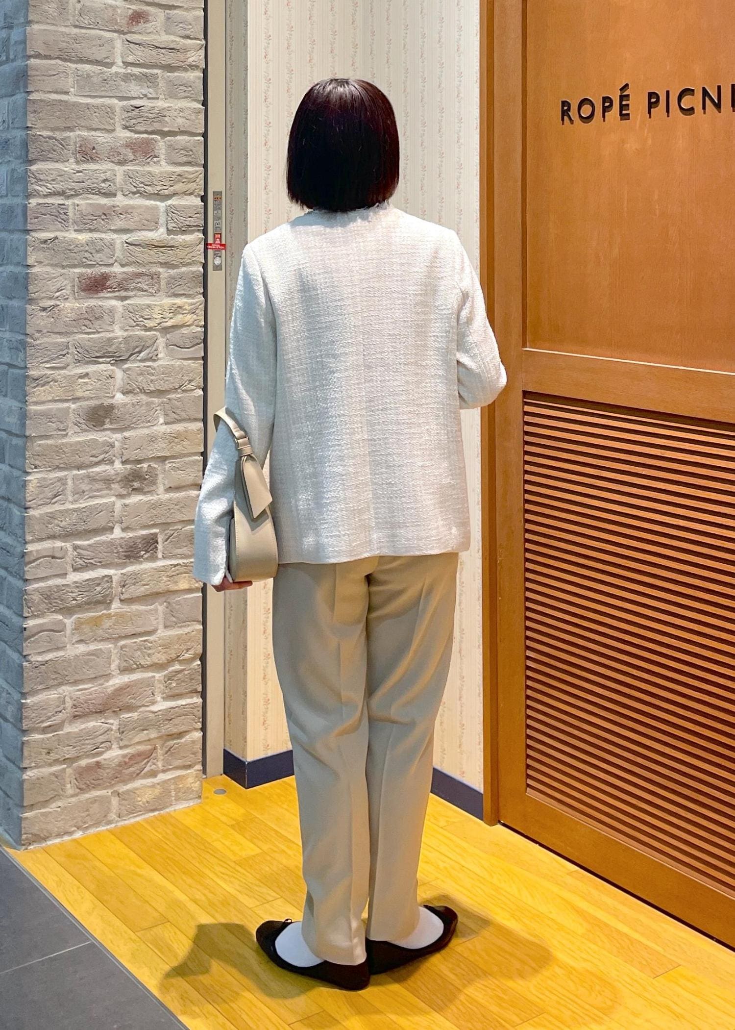 ホワイトのツイードジャケットにベージュのテーパードパンツを合わせた、入園、入学式にぴったりのセレモニーコーデです!