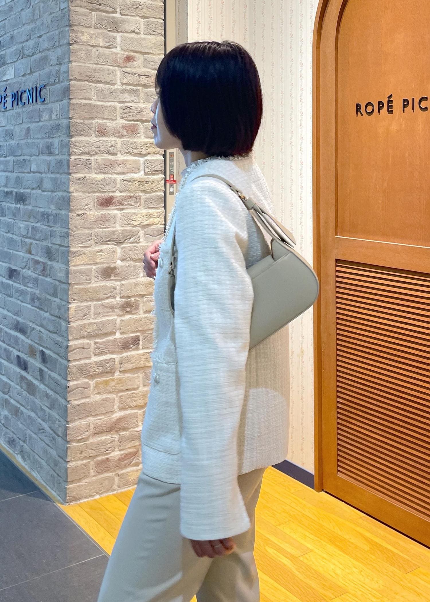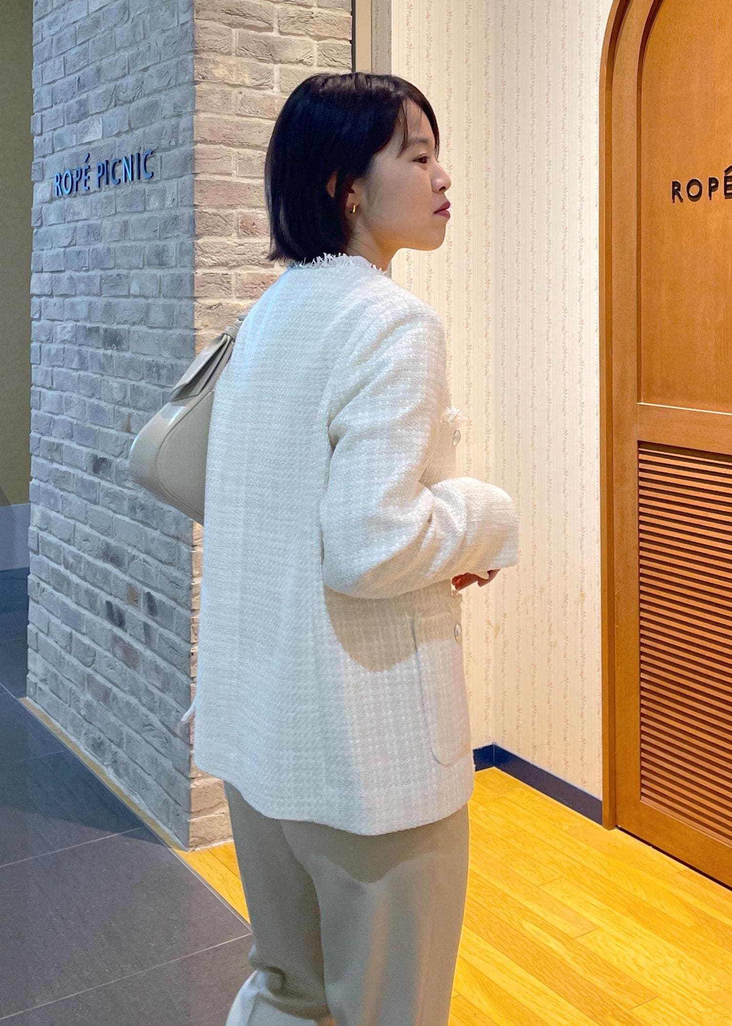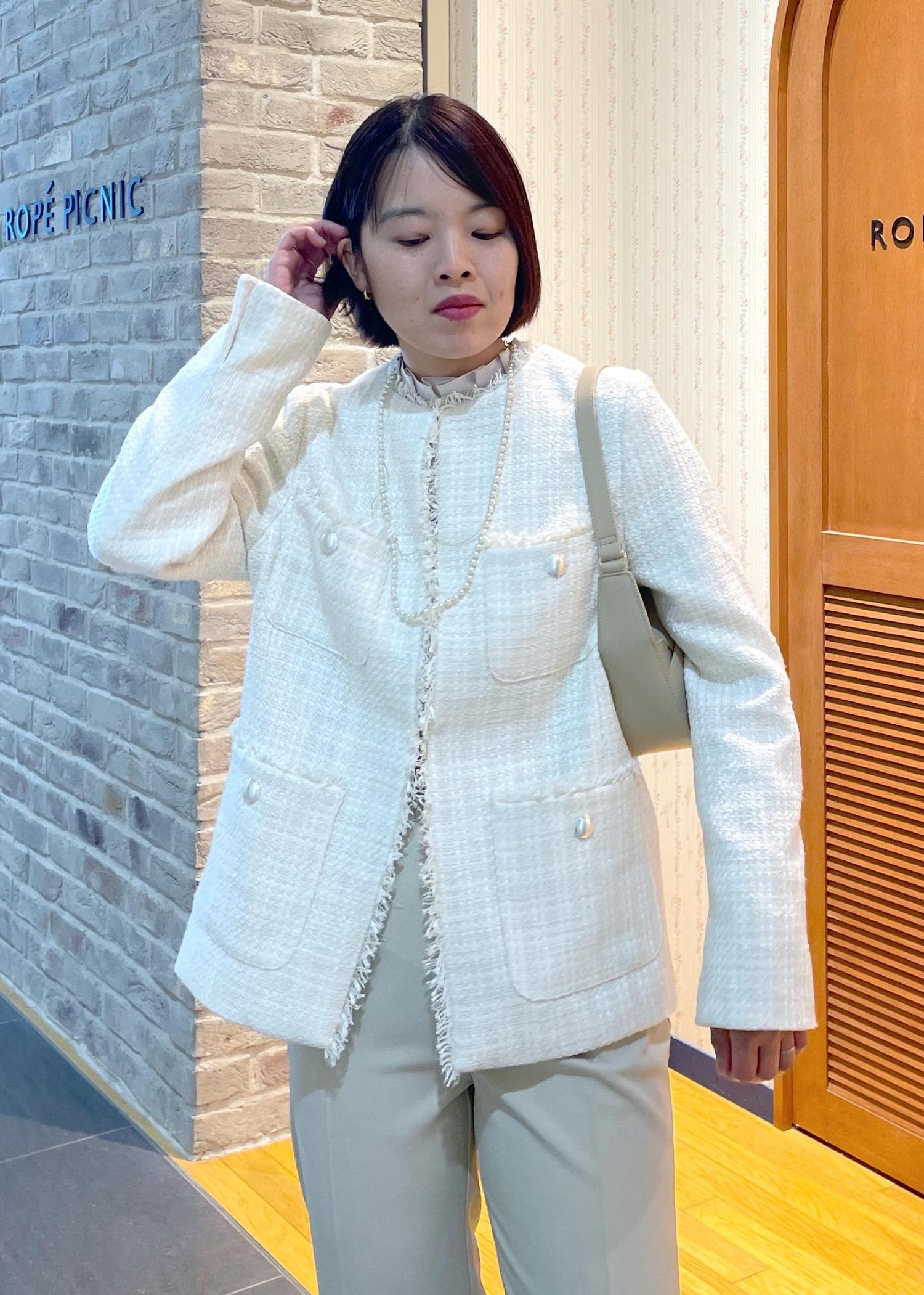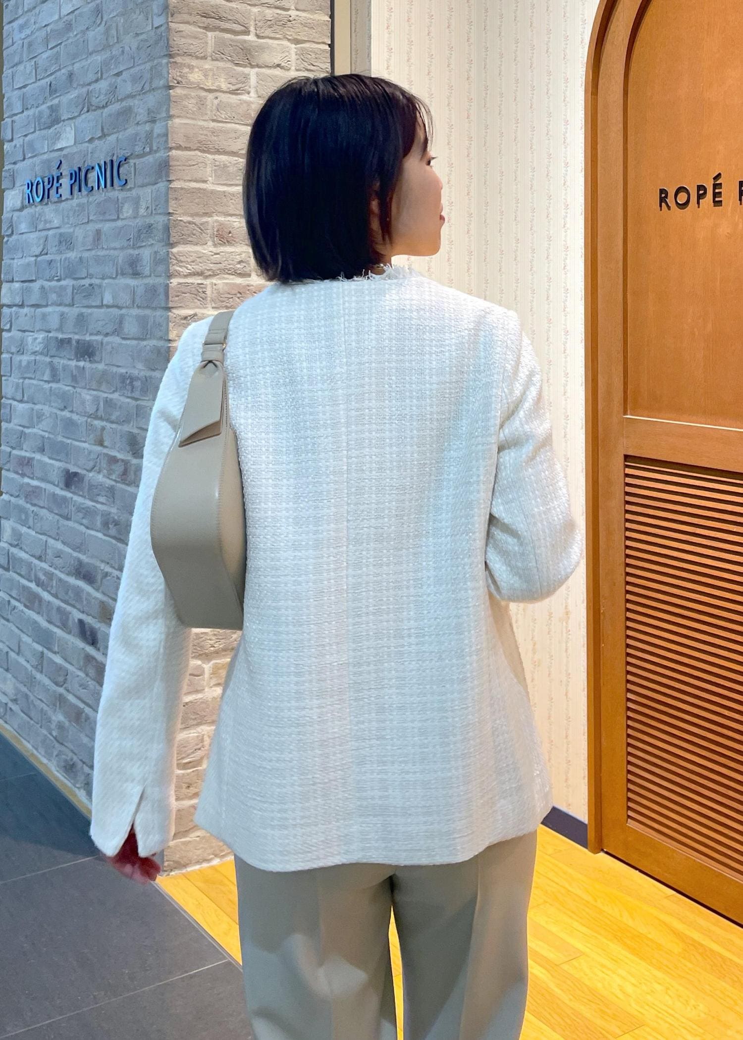 ROPÉ PICNICセレモニー・通勤対応/ツイードジャケット/リンクコーデオフホワイト / 38¥10,439レビューゆったりしたサイズ感のツイードジャケットで、ニットやブラウスなど、様々なインナーを合わせて着回しを楽しむことができます。着丈はヒップに掛かるくらいの長さでした。