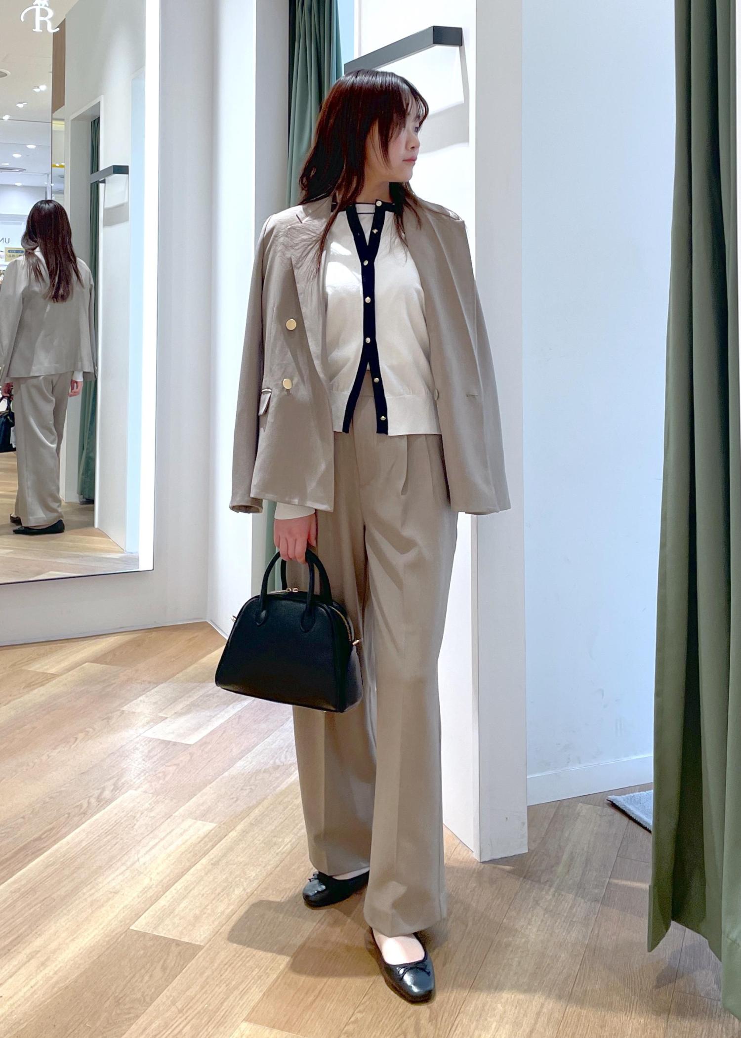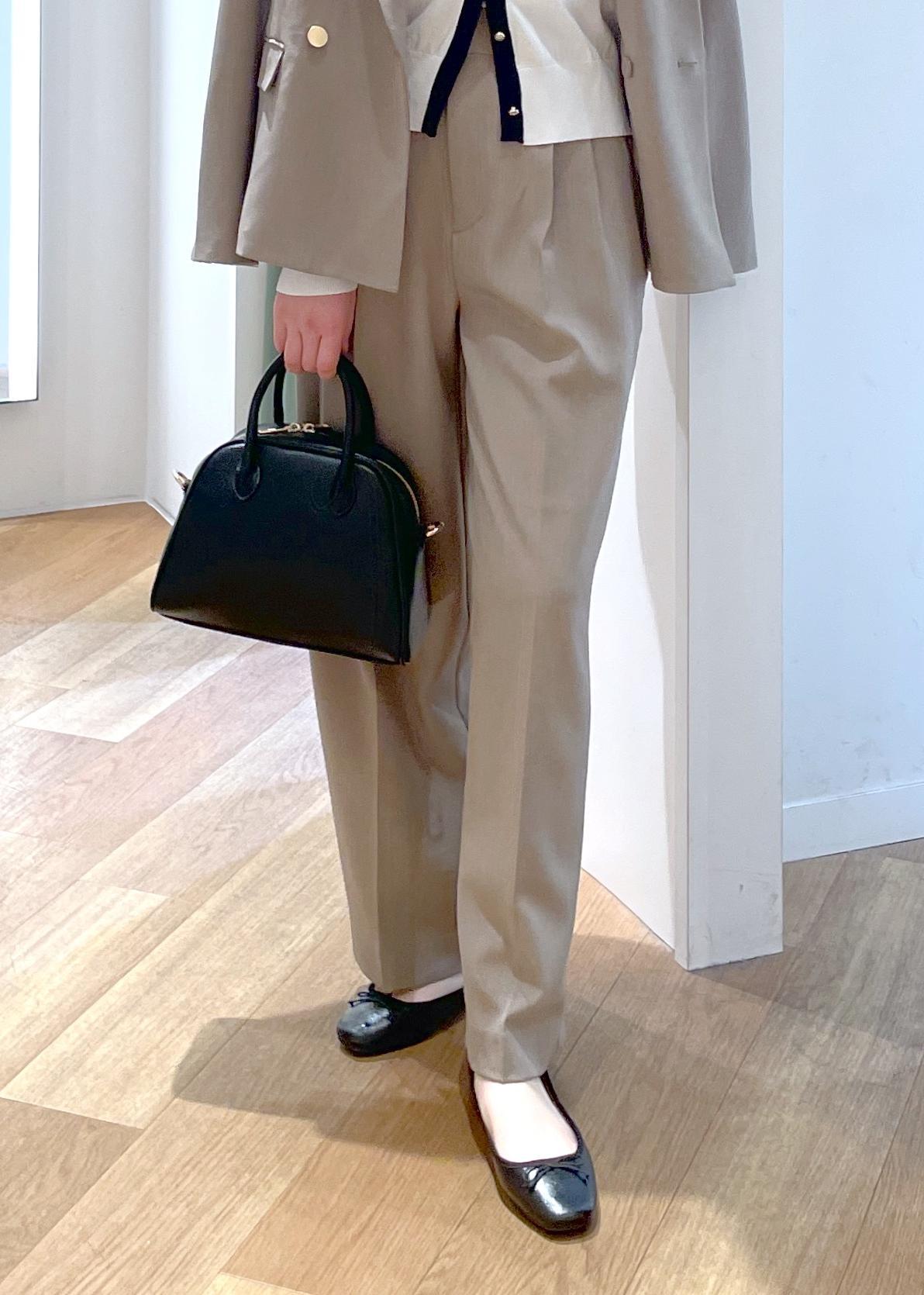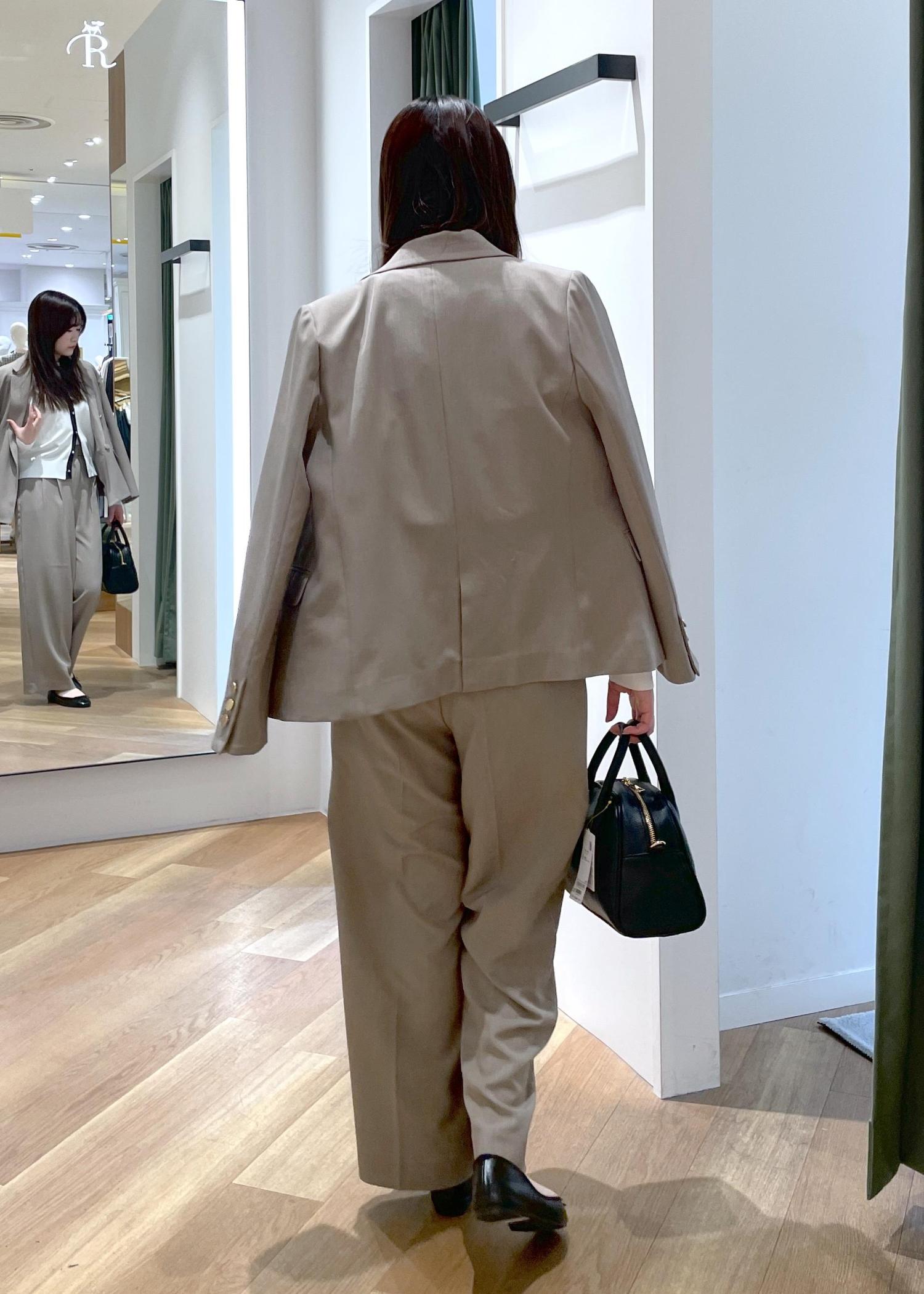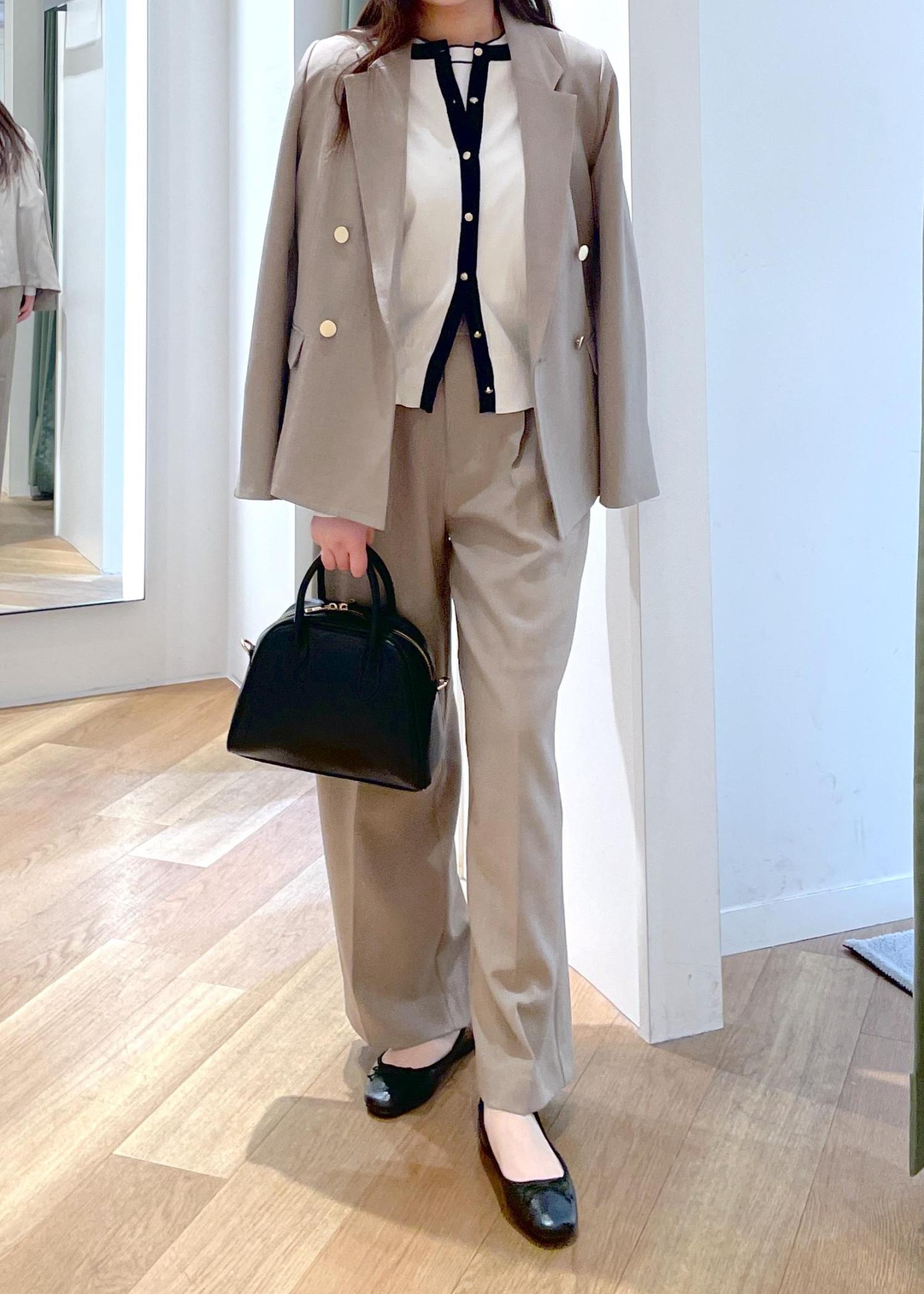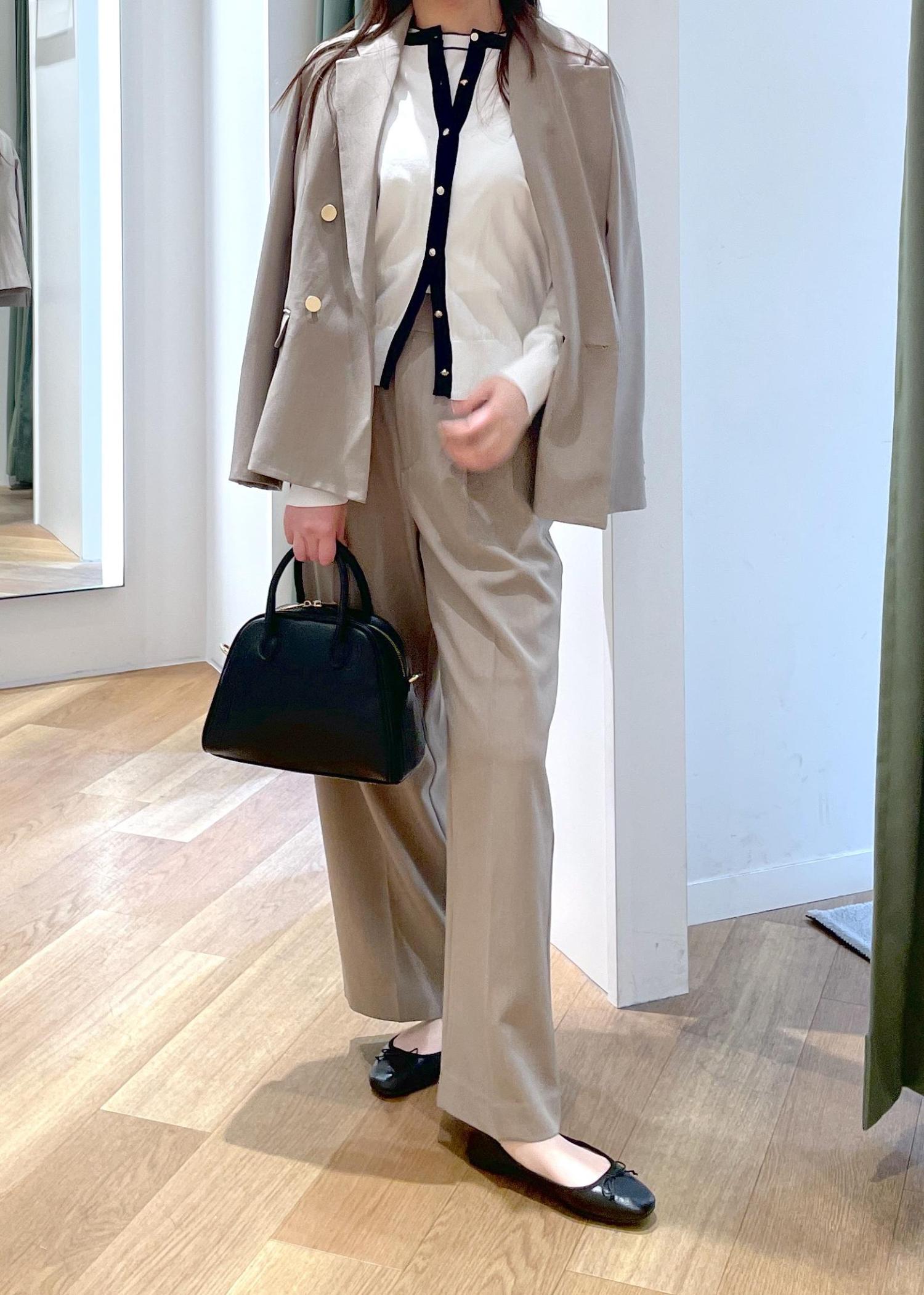 ベージュを基調にした柔らかい色味のコーデですが、ジャケットやスラックスなどのきちんと感の出るアイテムを選び、ハンサムコーデに仕上げました。