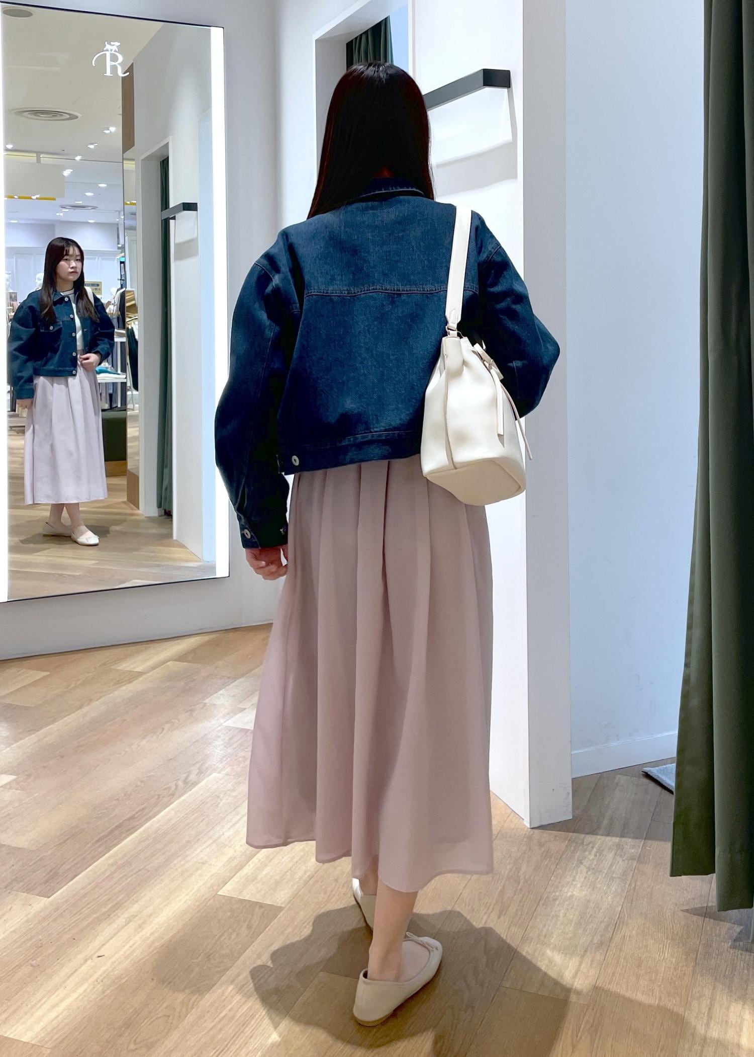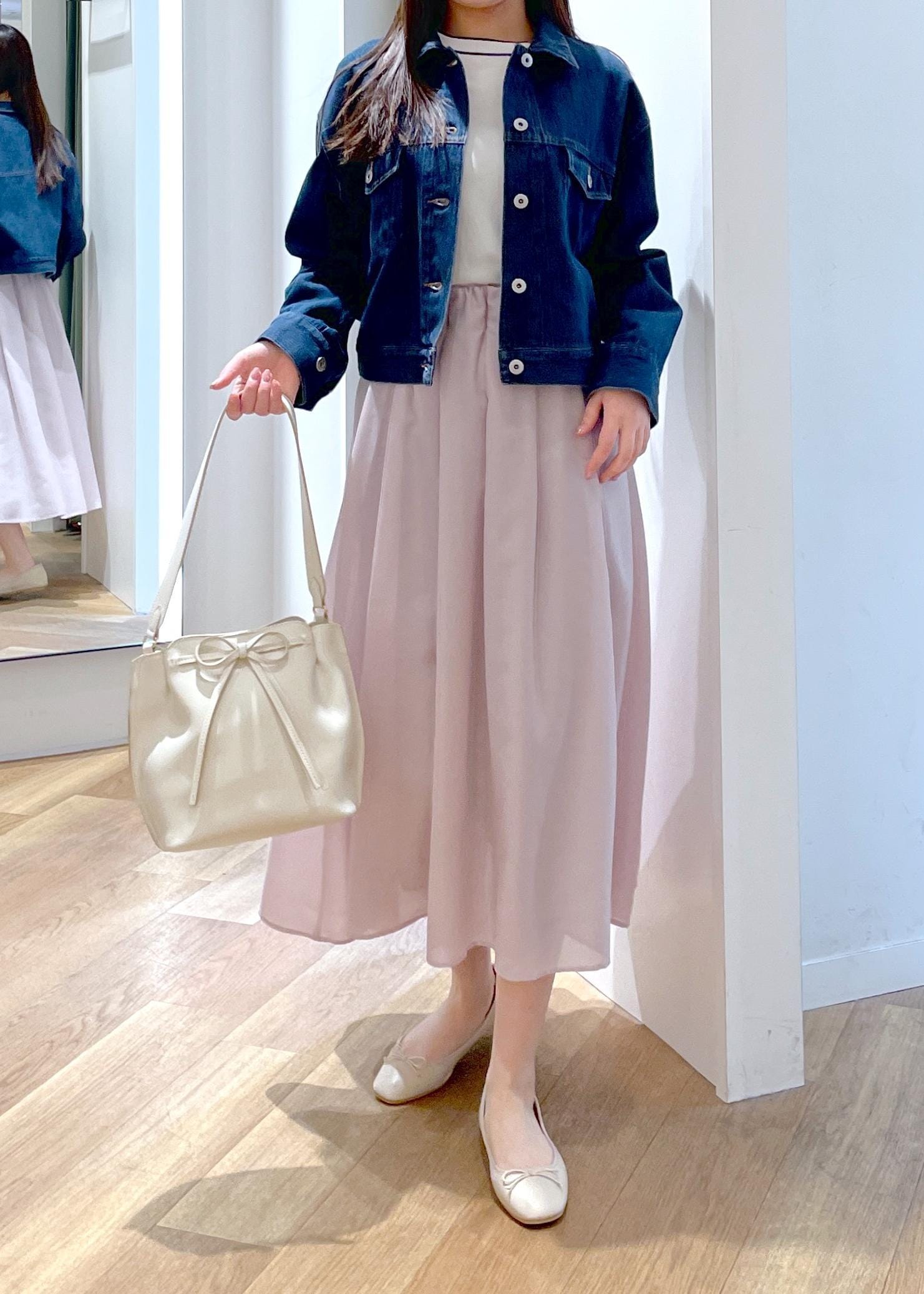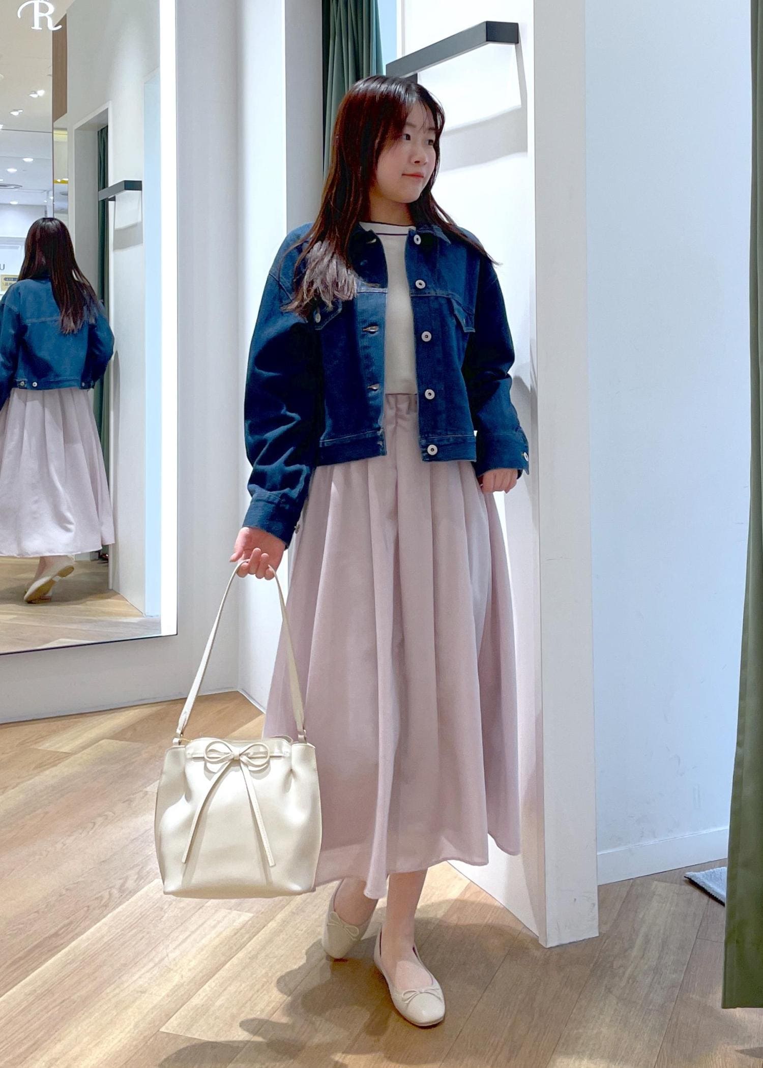 春らしさを一気に感じられるデニムジャケットを主役に、フレアスカートを合わせたフェミニンなコーディネートにしました。