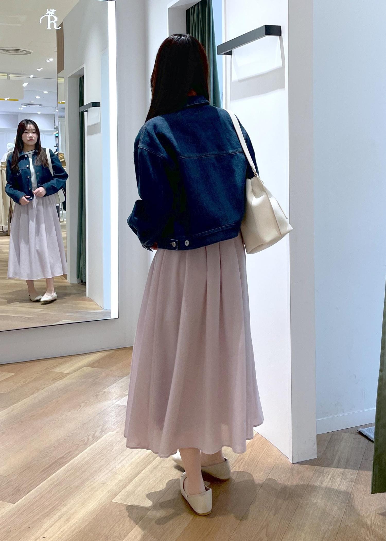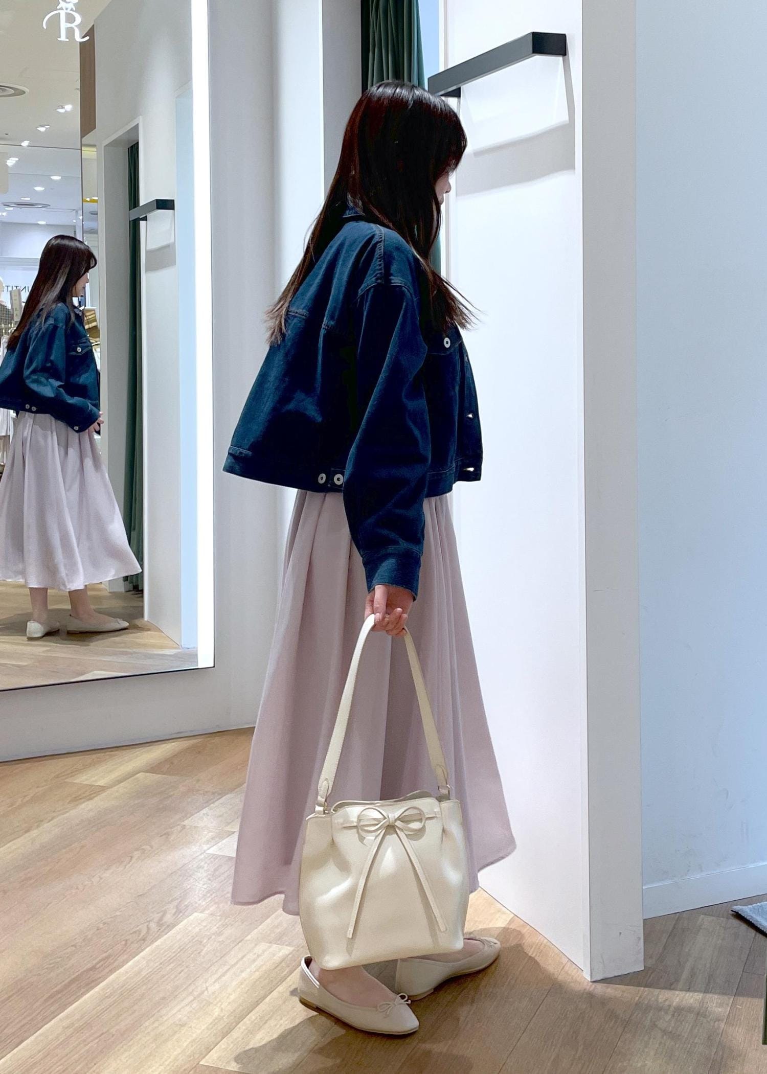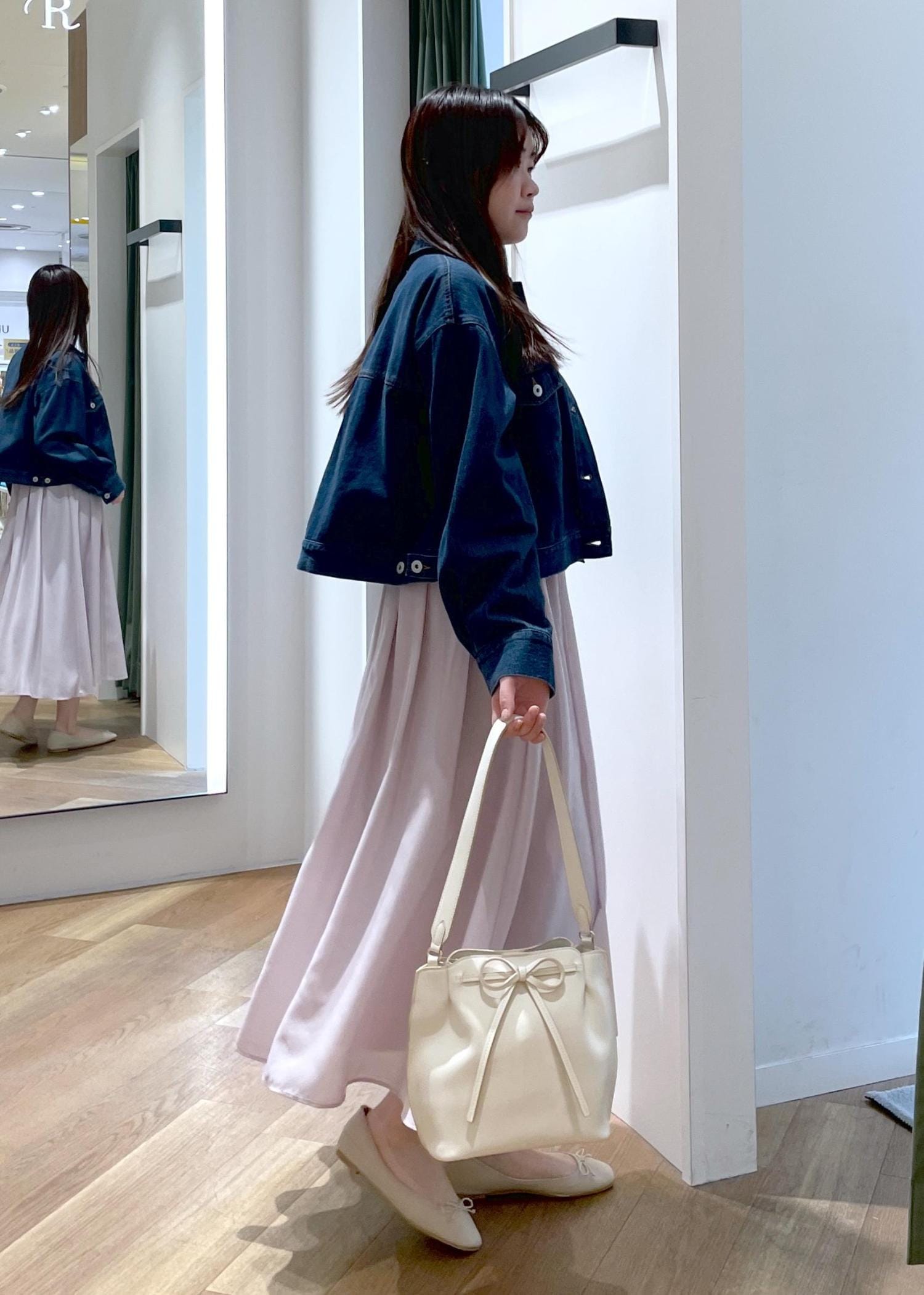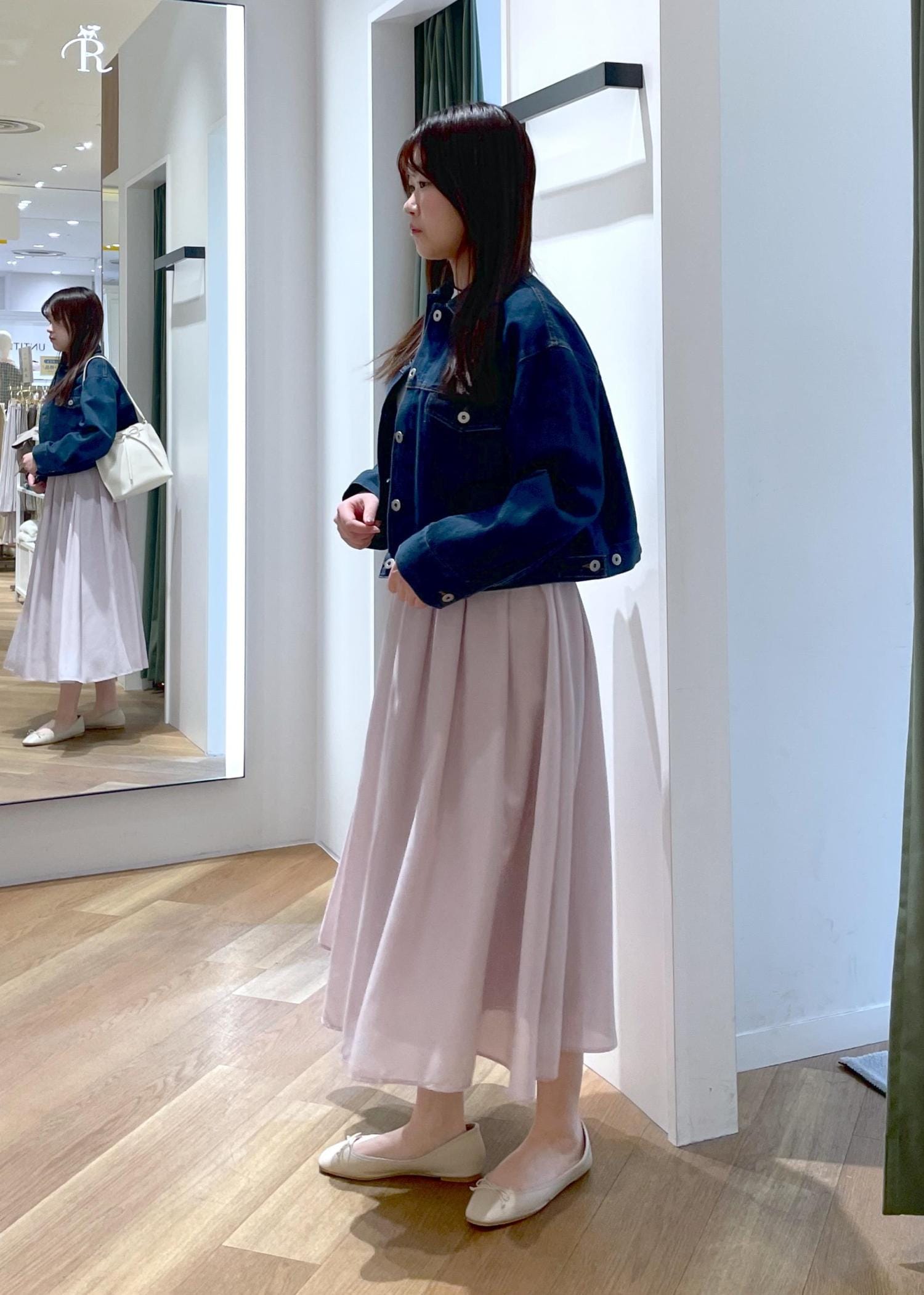 春らしさを一気に感じられるデニムジャケットを主役に、フレアスカートを合わせたフェミニンなコーディネートにしました。