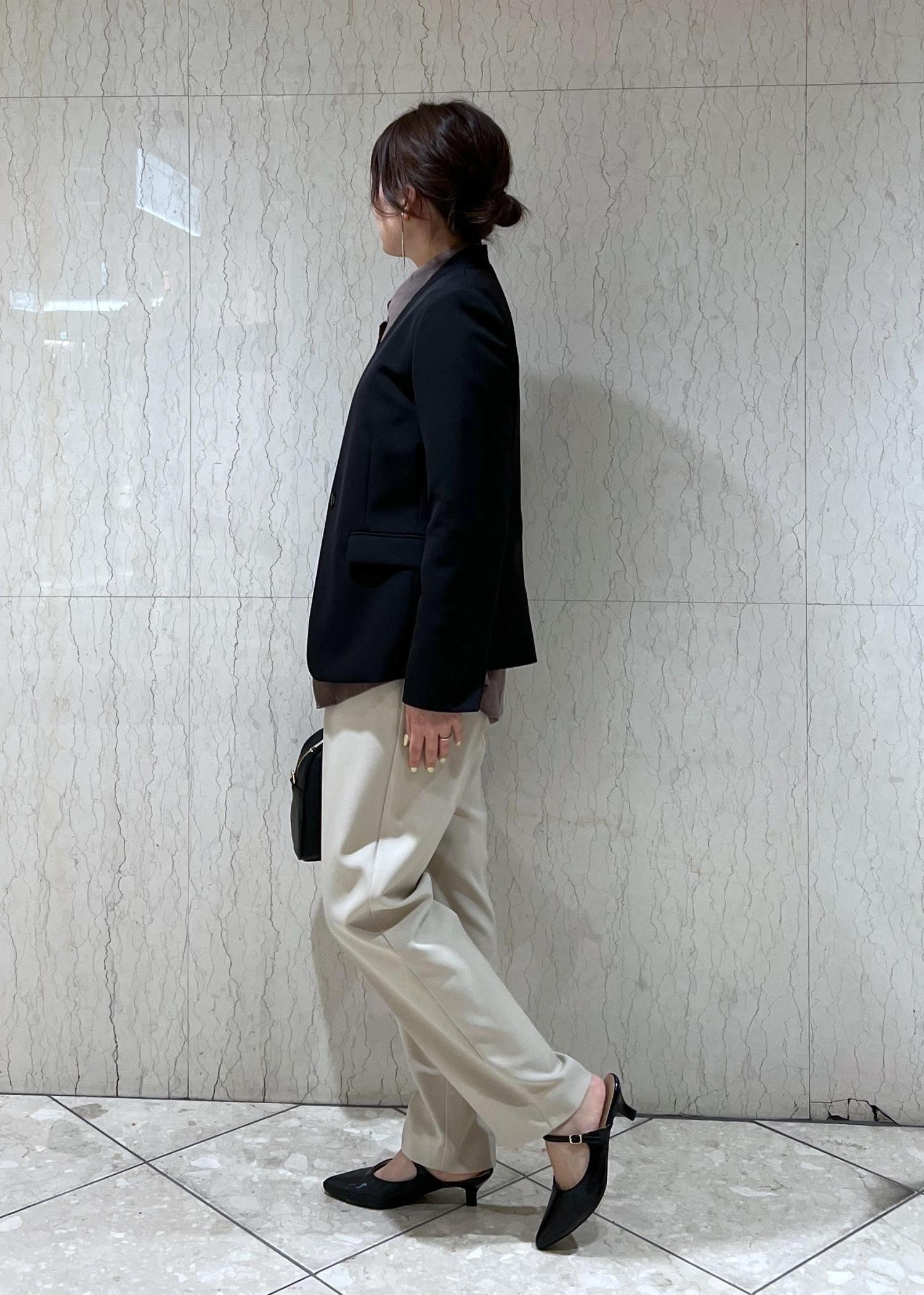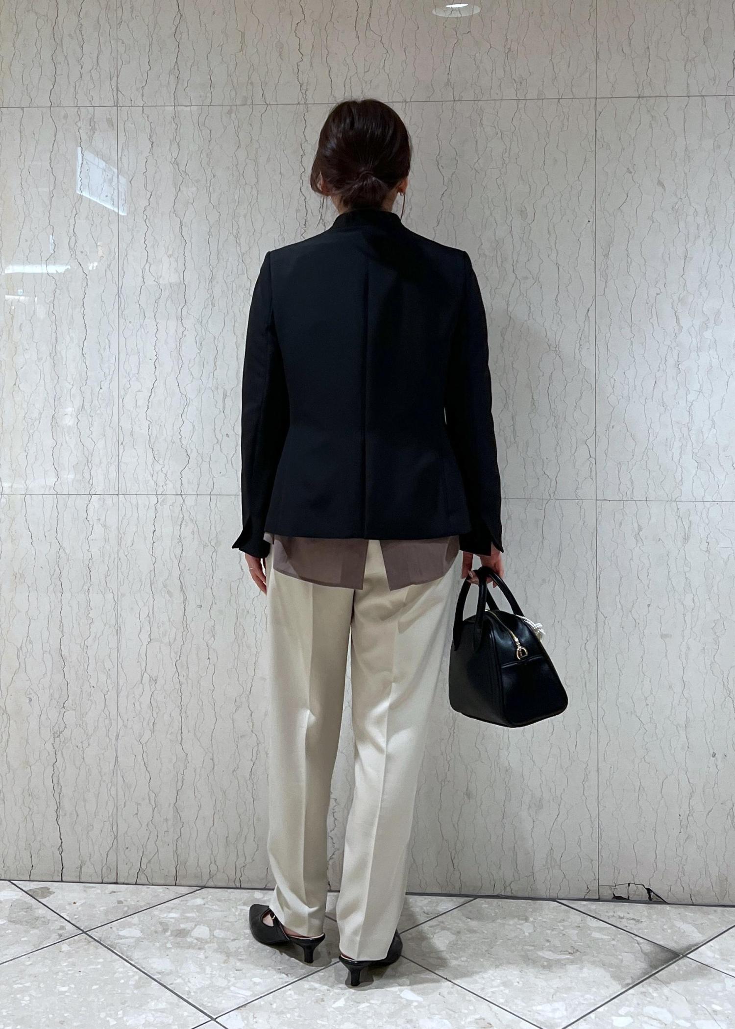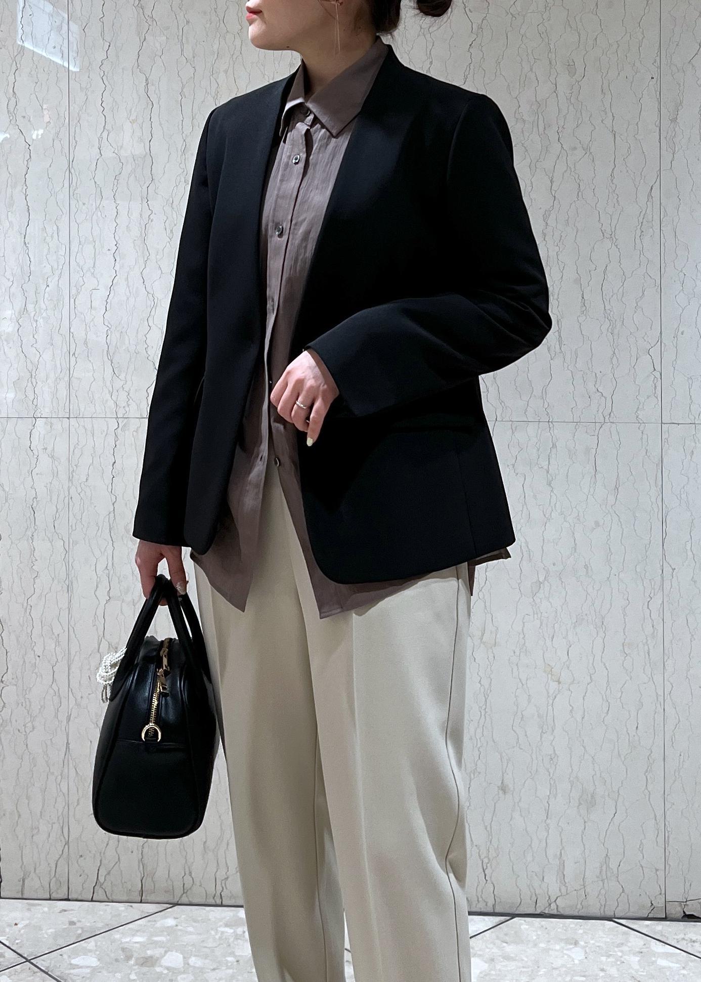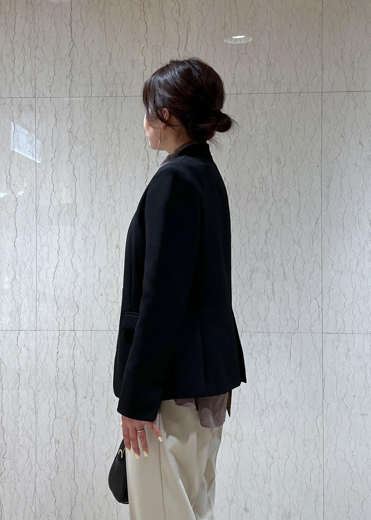 素材感:ジャケットでも少しストレッチ性もある素材でツルッとした素材感です。裏地もしっかりとついているので春・秋・冬までシーズン長く着用できます。
