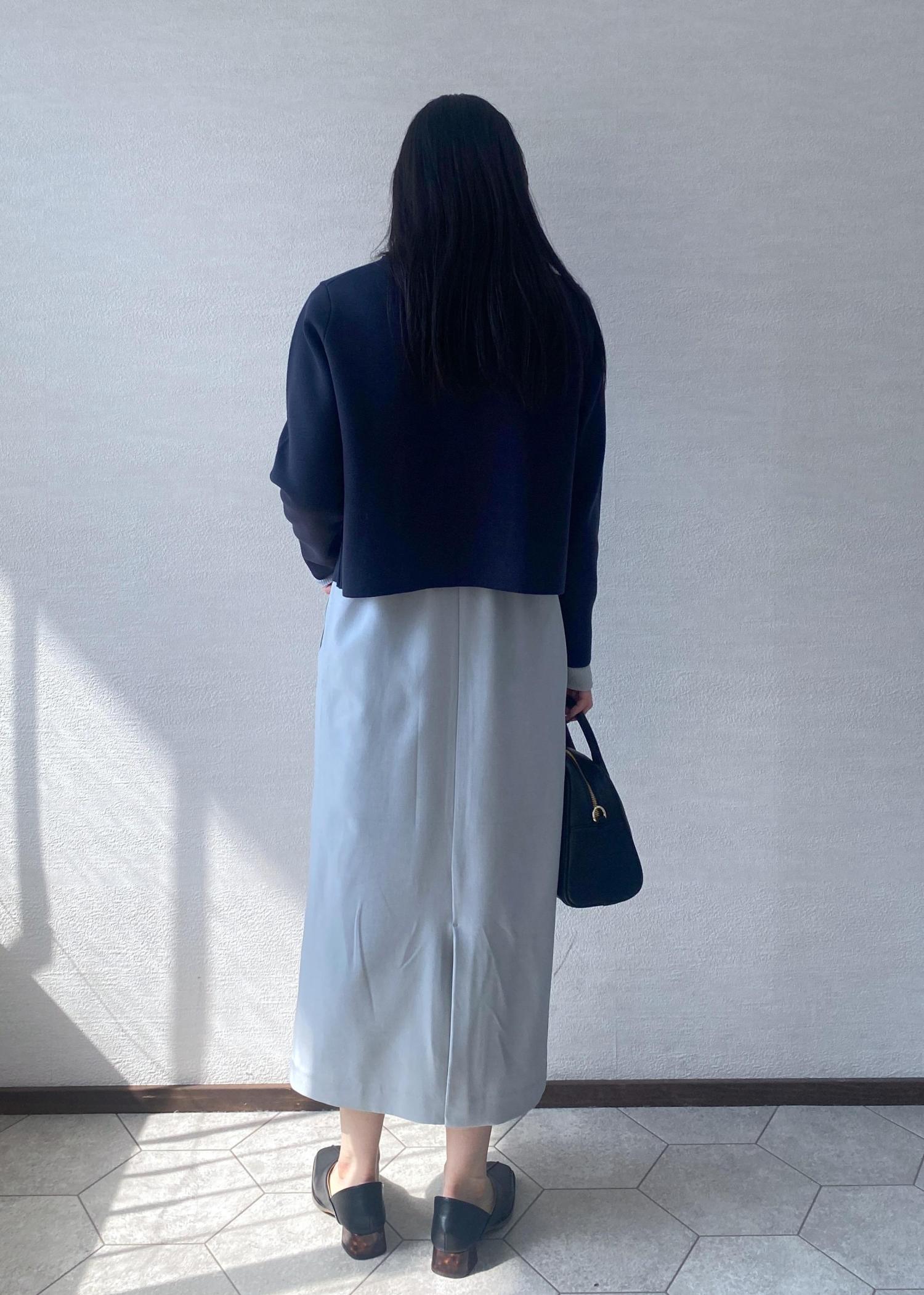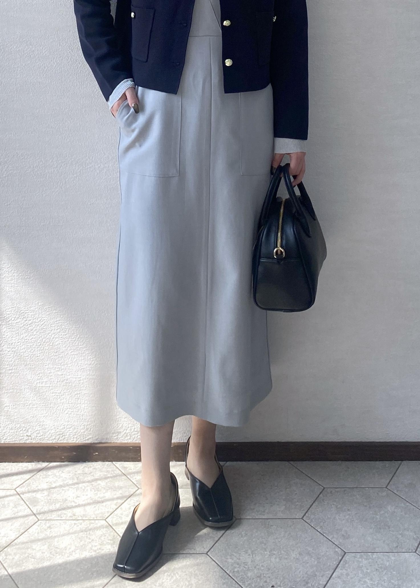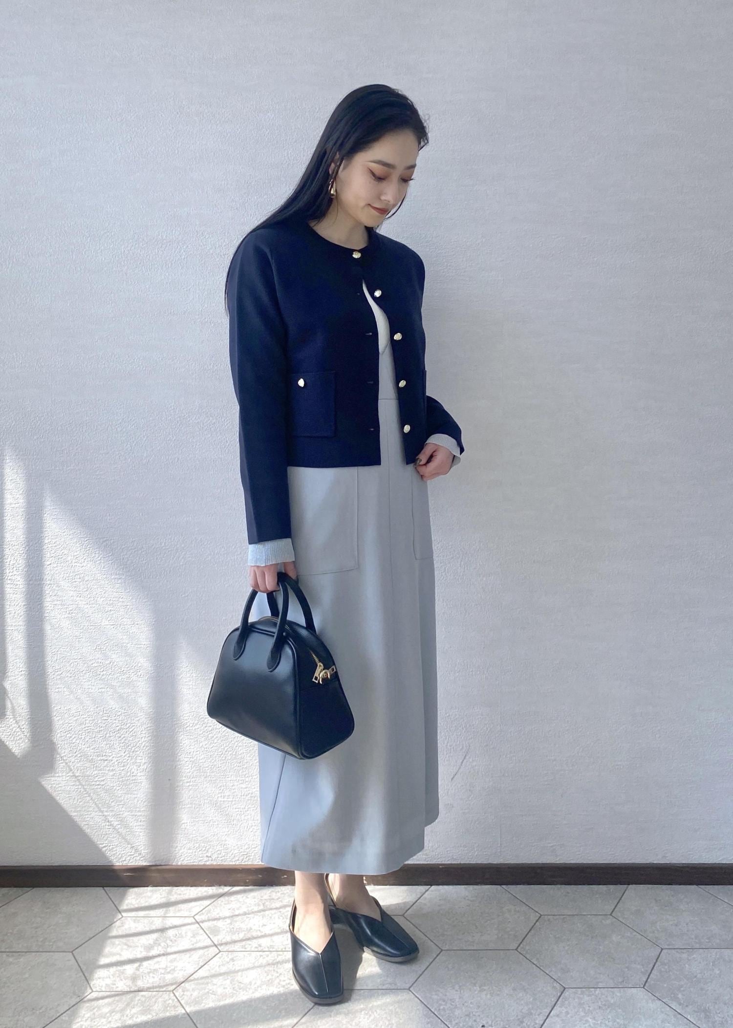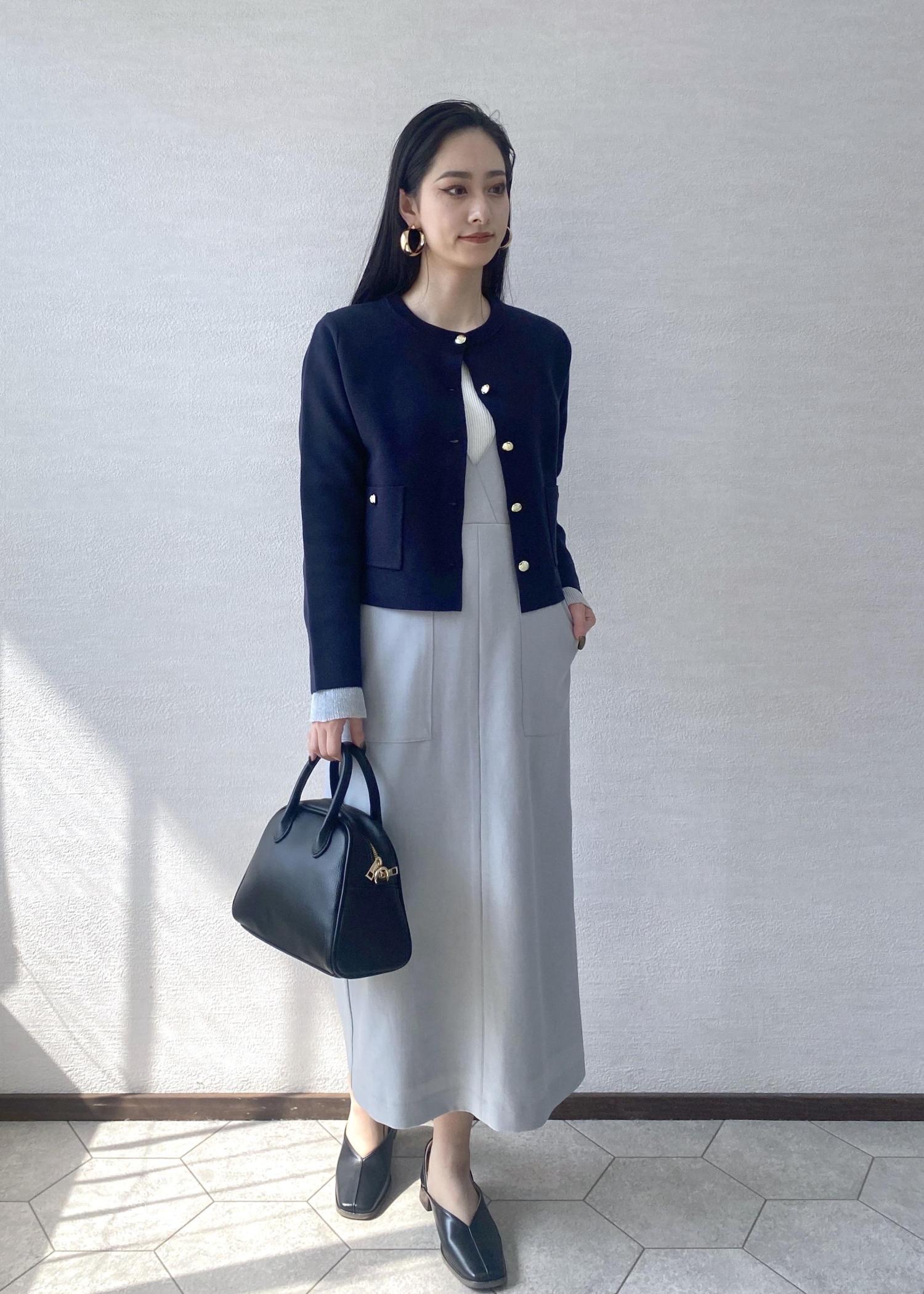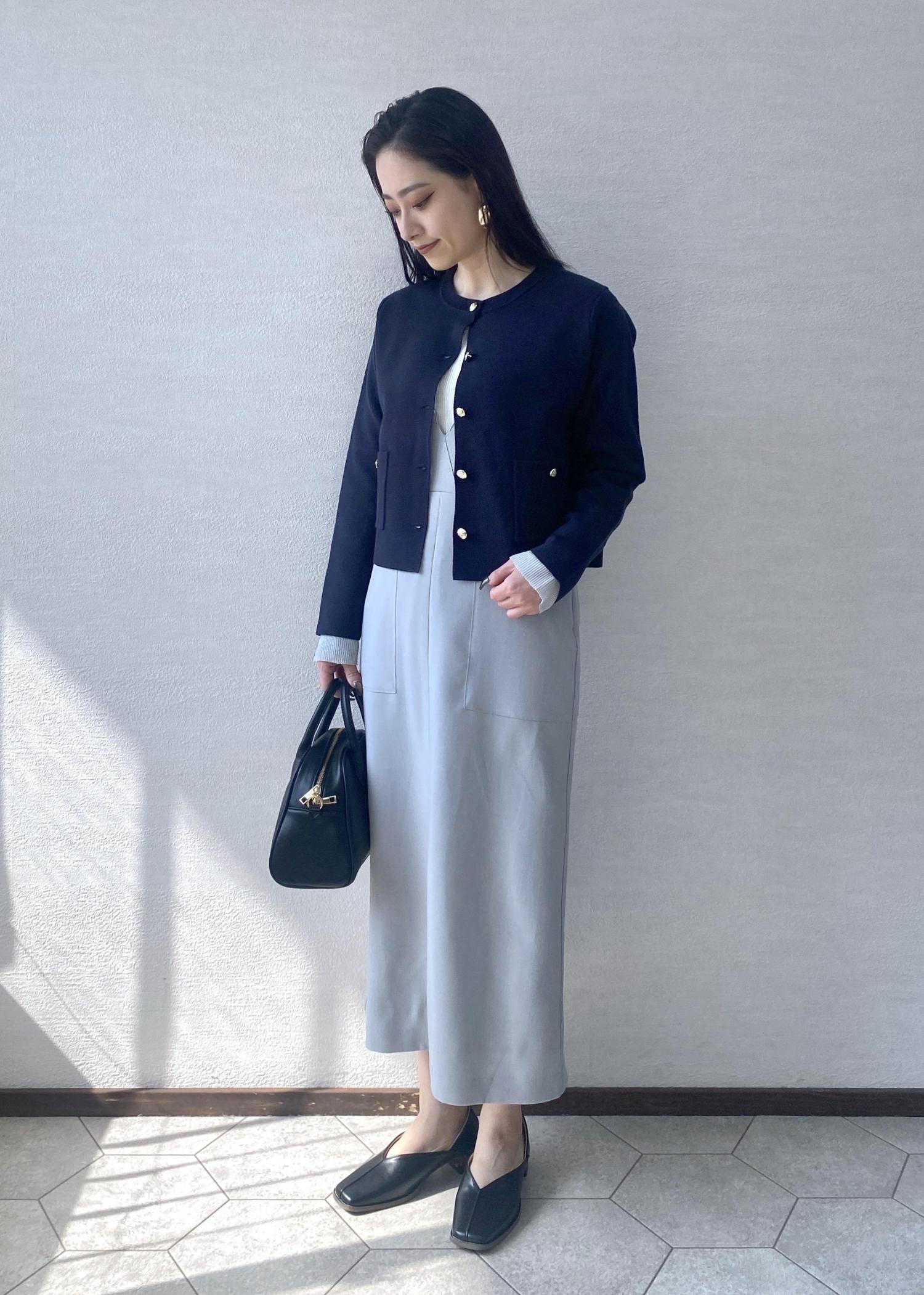 デザインポケットがポイントのジャンパースカートにきちんと感のあるネイビーのカーディガンを合わせたキレイめなコーディネートです。